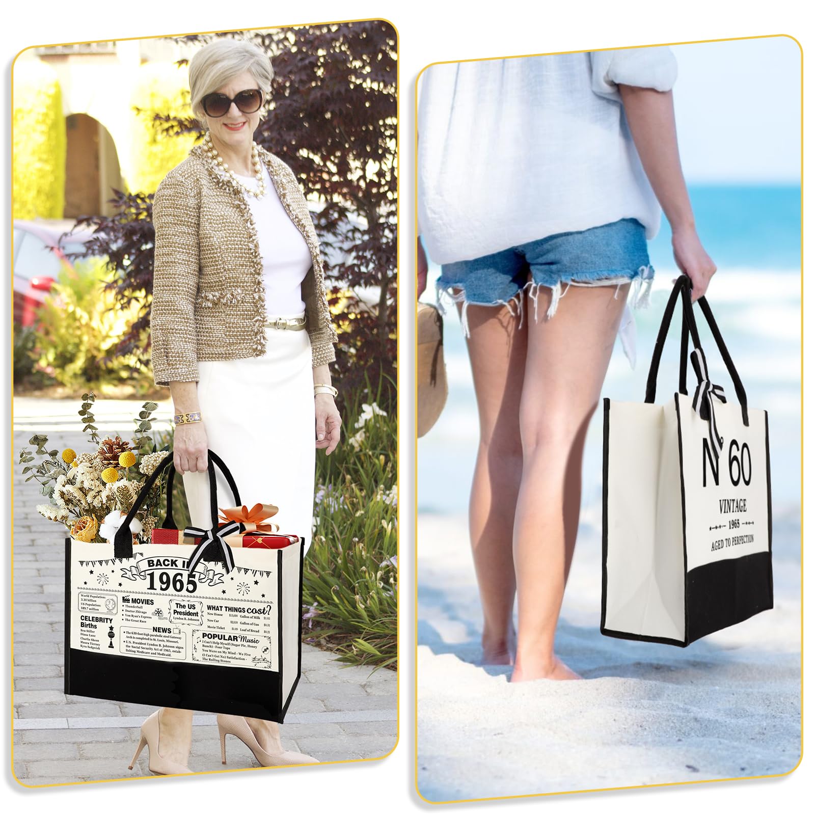 Great Gift for Her 60th Birthday: This gifts set for 60th birthday women contains: 1 X 1965 beach bag, 1 X makeup bag, 1 X back in 1965 poster, 1 X greeting card. Unique canvas tote bag gifts set will be a adorable gift for women's 60th birthday. This birthday 60 gifts themed idea makes the perfect choice for putting a smile on her face on their special day.