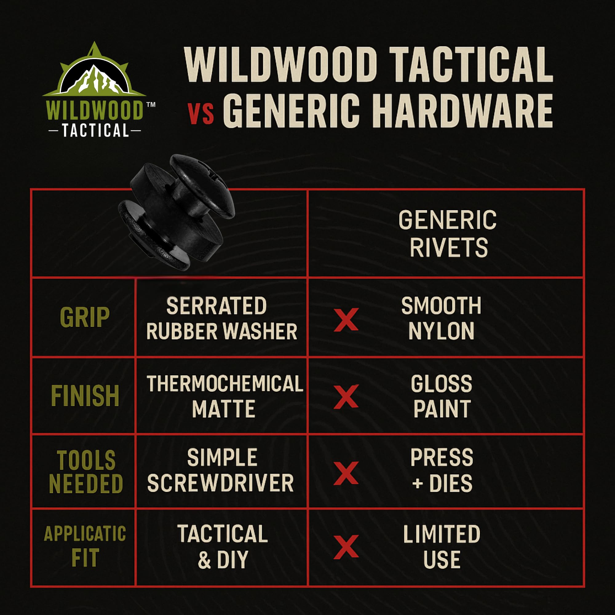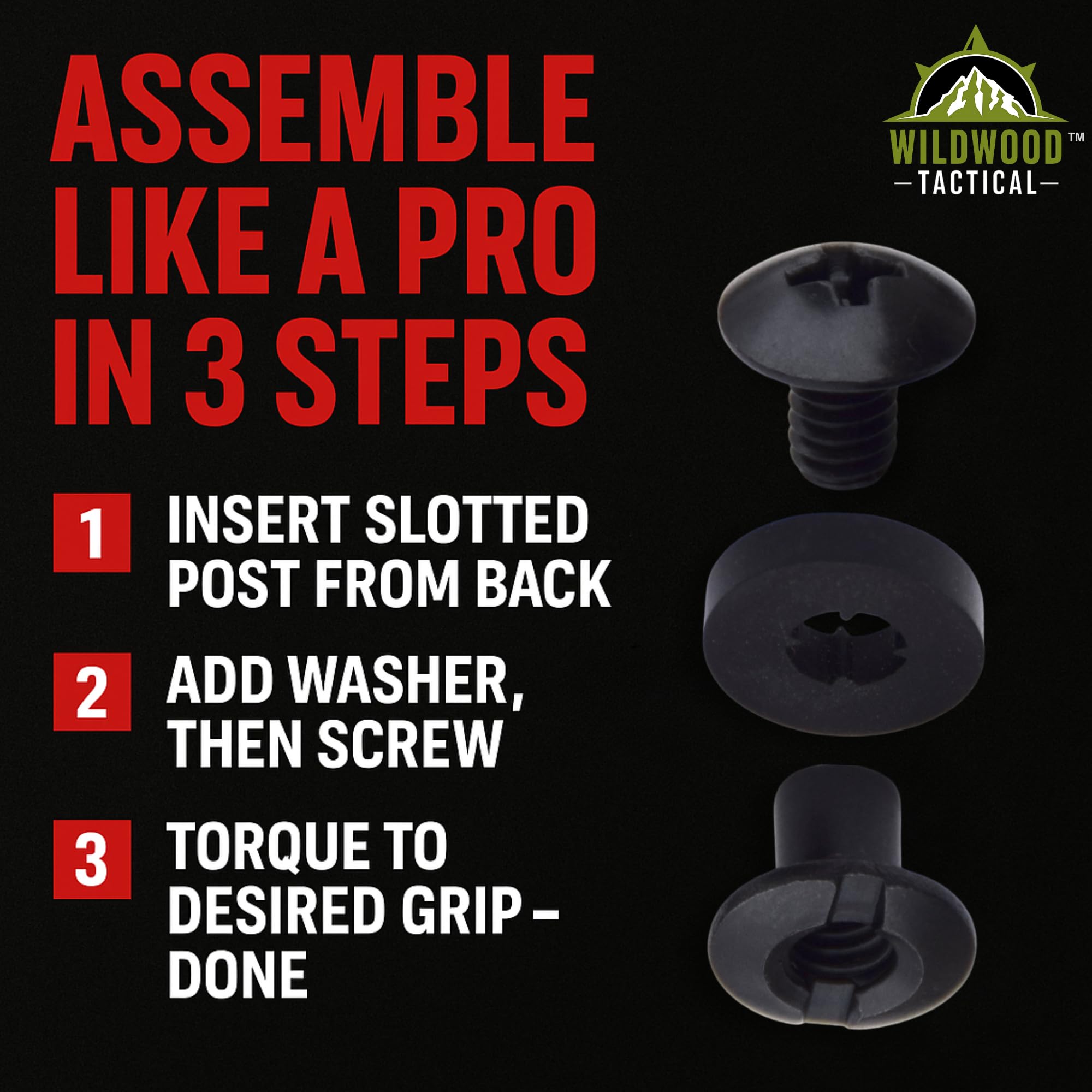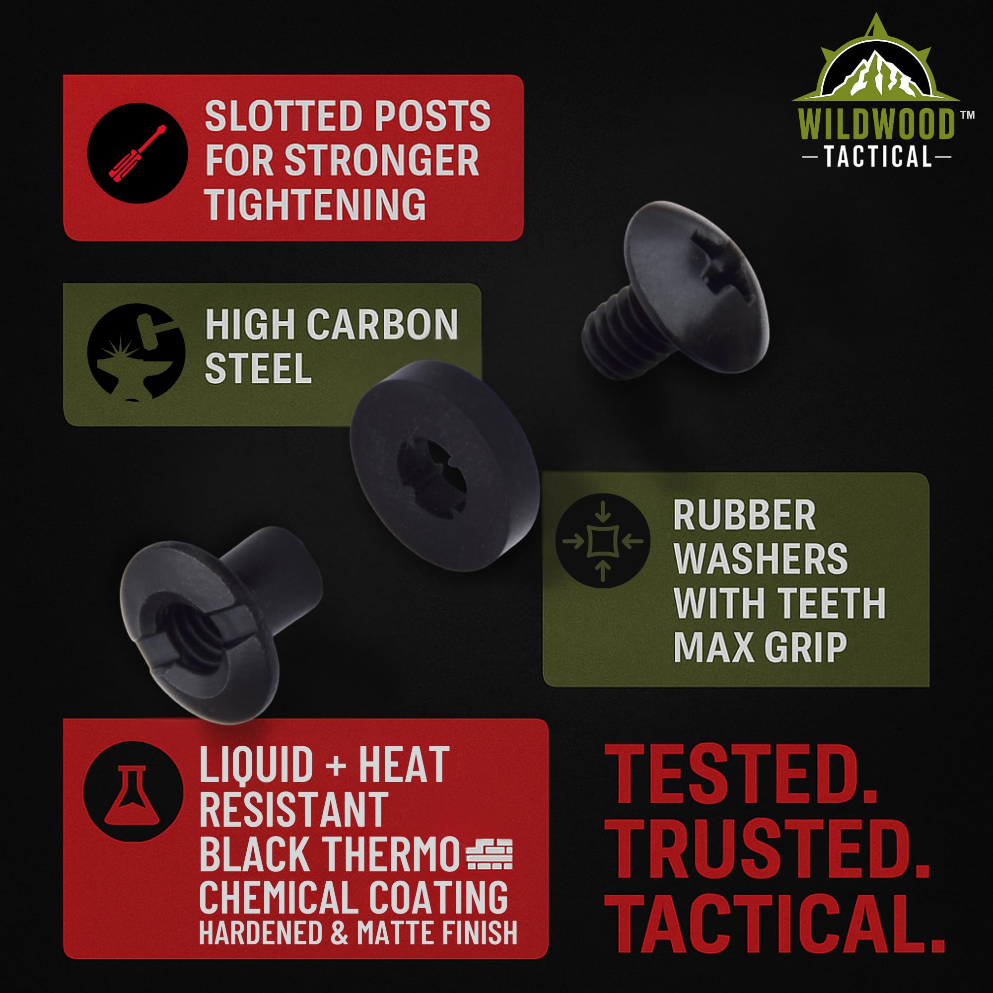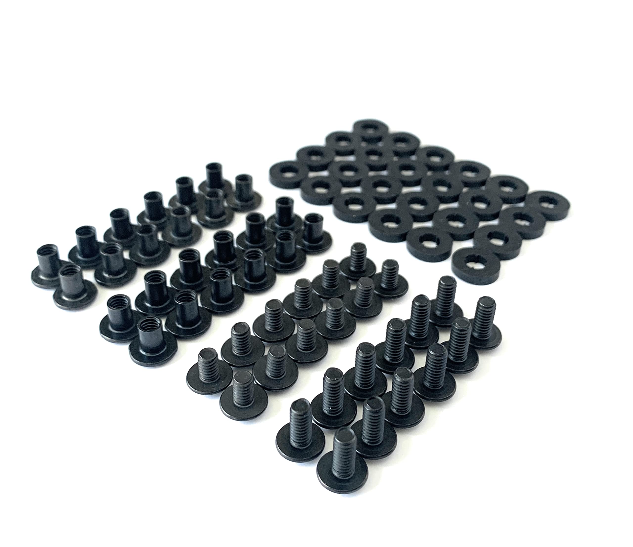 STRONG & DURABLE – Each piece of hardware is made of high carbon steel and coated with a high tech black thermochemical treating to harden it and give it a gun-like matte finish that eliminates any glare. The included washers are resistant to liquids and oils and are able to withstand extreme temperatures.