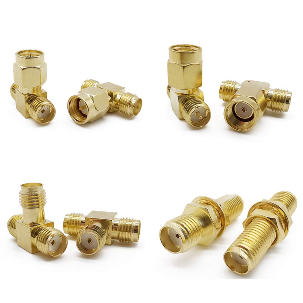 18pcs different type SMA Connectors SMA Kits have 18 pieces connectors converters SMA right angle kits include 4 types: SMA male to SMA female 90 degree SMA female to RP SMA male 90 degree RP SMA female to RP SMA male 90 degree RP SMA Male To SMA RP SMA Female 90 degree Female to female kits include 4 types: SMA female to female barrel RP SMA female to RP SMA female barrel SMA female to RP SMA female barrel SMA female to female bulkhead Male to Male kits : SMA male to male SMA male to RP SMA male RP SMA male to RP SMA male TIPS: Normal SMA male - A pin center,thread inside Normal SMA female - A hole in center,thread outside RP SMA male - A hole in center,thread inside RP SMA female - A pin in center,thread outside