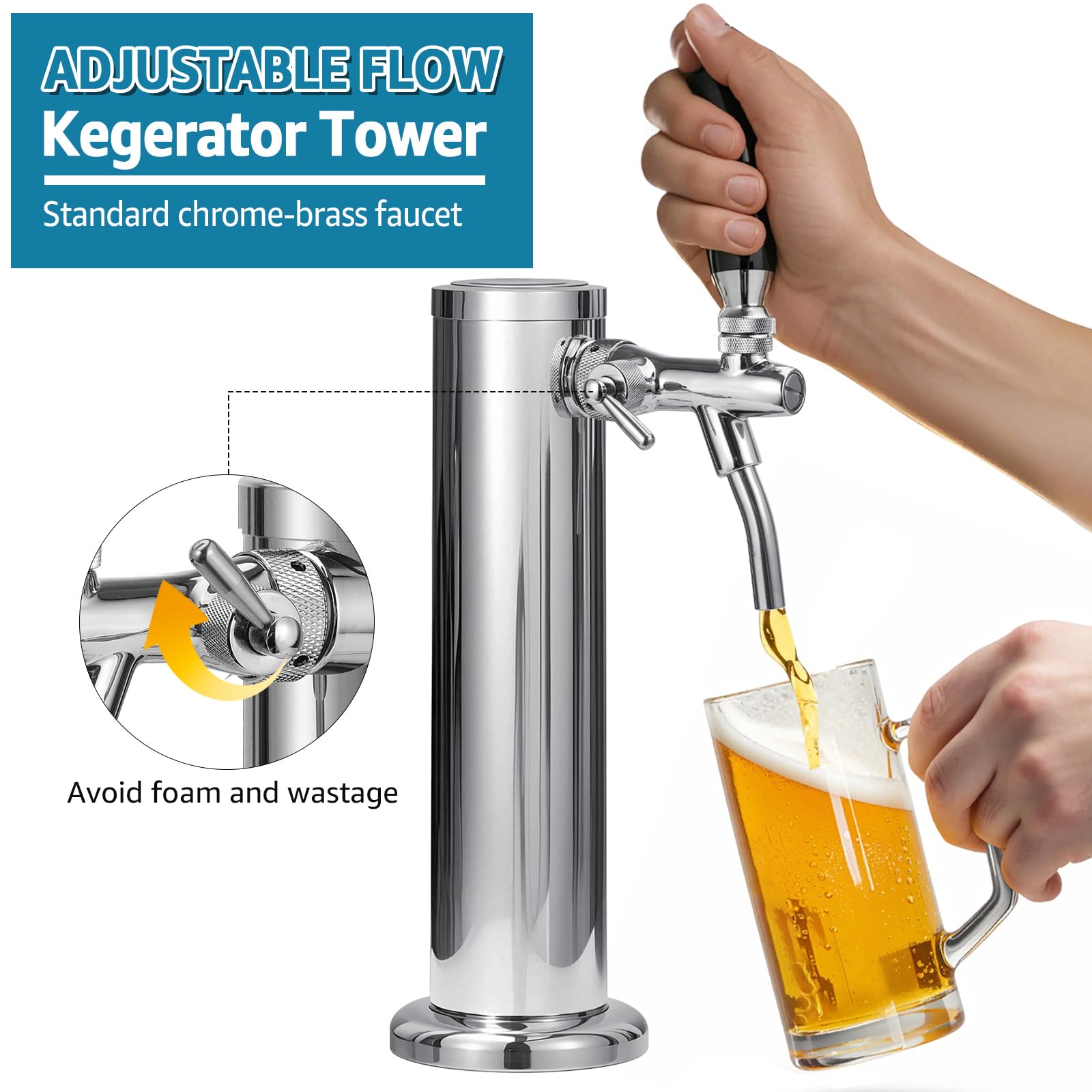PRECISE FLOW CONTROL: The beer faucet is equipped with a flow control valve, allowing easy adjustment of beer flow to avoid excessive foam, reduce spillage, and minimize waste. This kegerator tower is suitable for various drinks such as beer, cider, cocktails, and carbonated beverages, ensuring the perfect pour every time