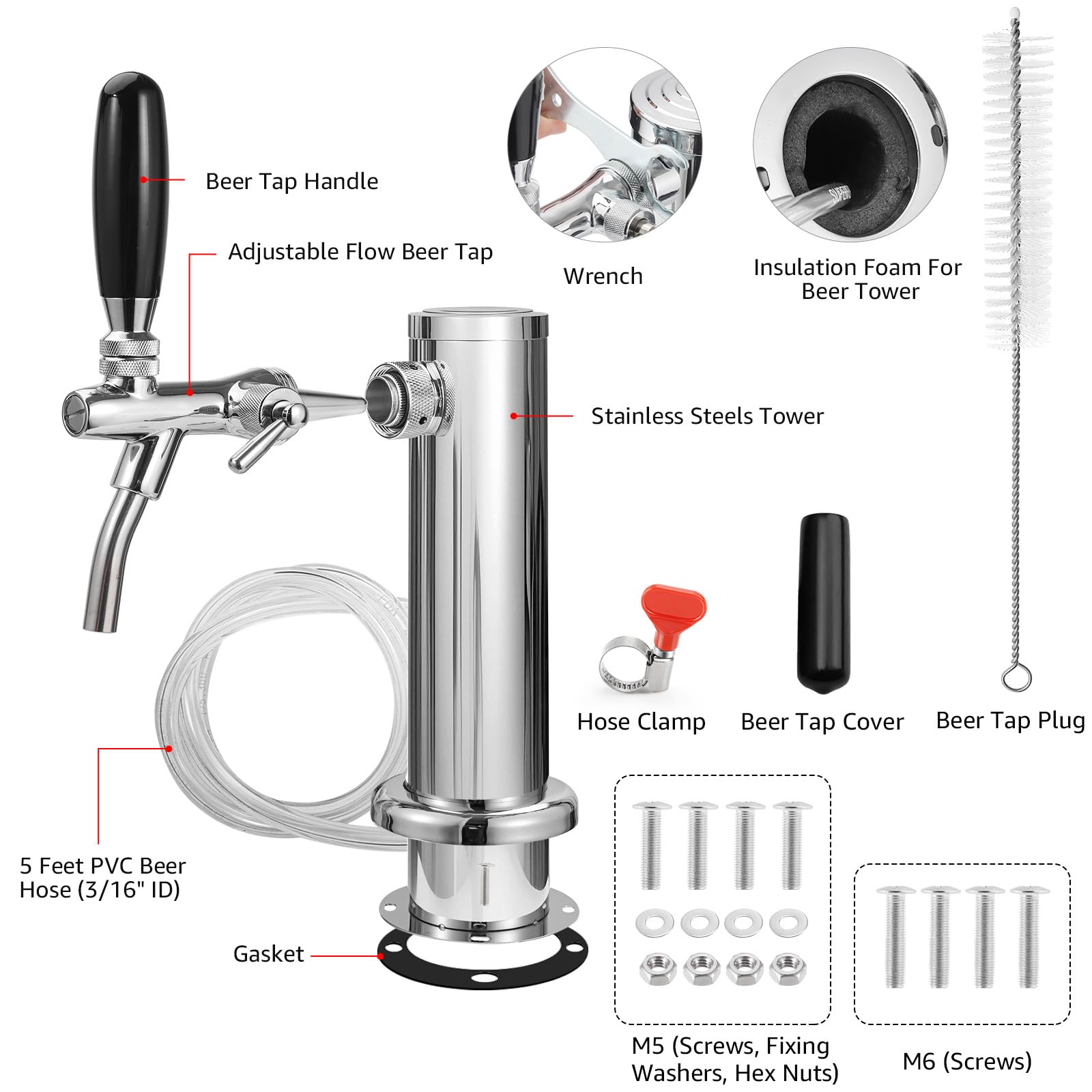 HEALTHY AND DURABLE: The beer tower dispenser is made of stainless steel, with the faucet body crafted from chrome-plated polished brass, and the internal core is stainless steel, offering corrosion resistance and easy cleaning. The food-grade PVC beer line preserves the original flavor of the beer, being strong and durable for long-lasting use