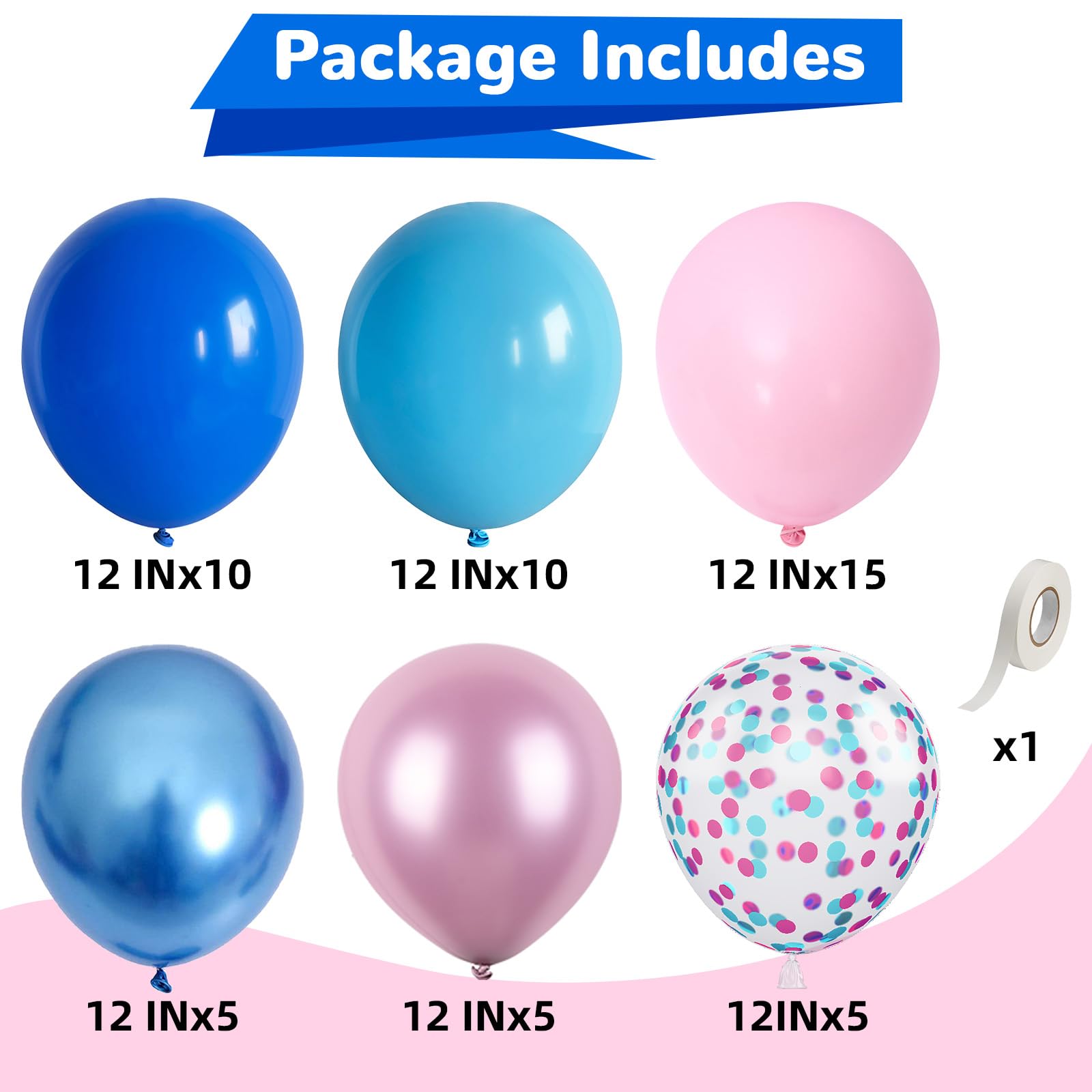 Blue and Pink Balloons: Includes 12 inch 50 pcs helium balloons with 10 pcs dark blue balloons, 10 pcs pastel blue balloons, 15 pcs light pink balloons, 5 pcs metallic blue balloons, 5 pcs metallic pink balloon, 5 pcs confetti balloon and a roll white ribbon