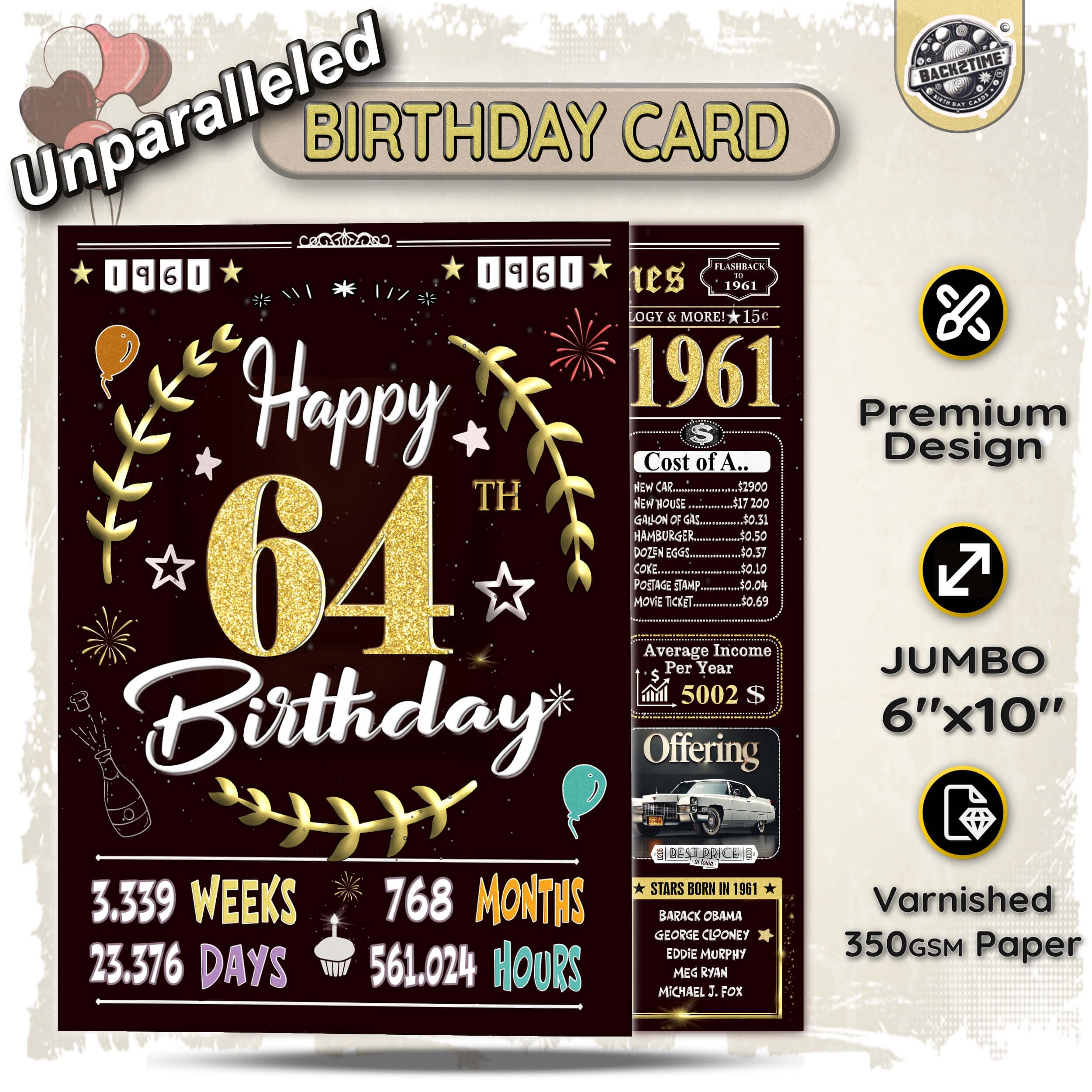 π 64TH BIRTHDAY CARD BACK IN 1961 π Celebrate birthday with this premium vintage design. Perfect for men and women, You are looking for a card for brother, sister, husband, wife, dad, mom, cousin, friend β€οΈ. Spread happiness and create unforgettable memories! Ideal for Gifts, 64 Decorations. Happy Birthday Cards for Women, Happy Birthday Card for Her, 64 years old Birthday Decorations for Men, Boy, Boyfriend.