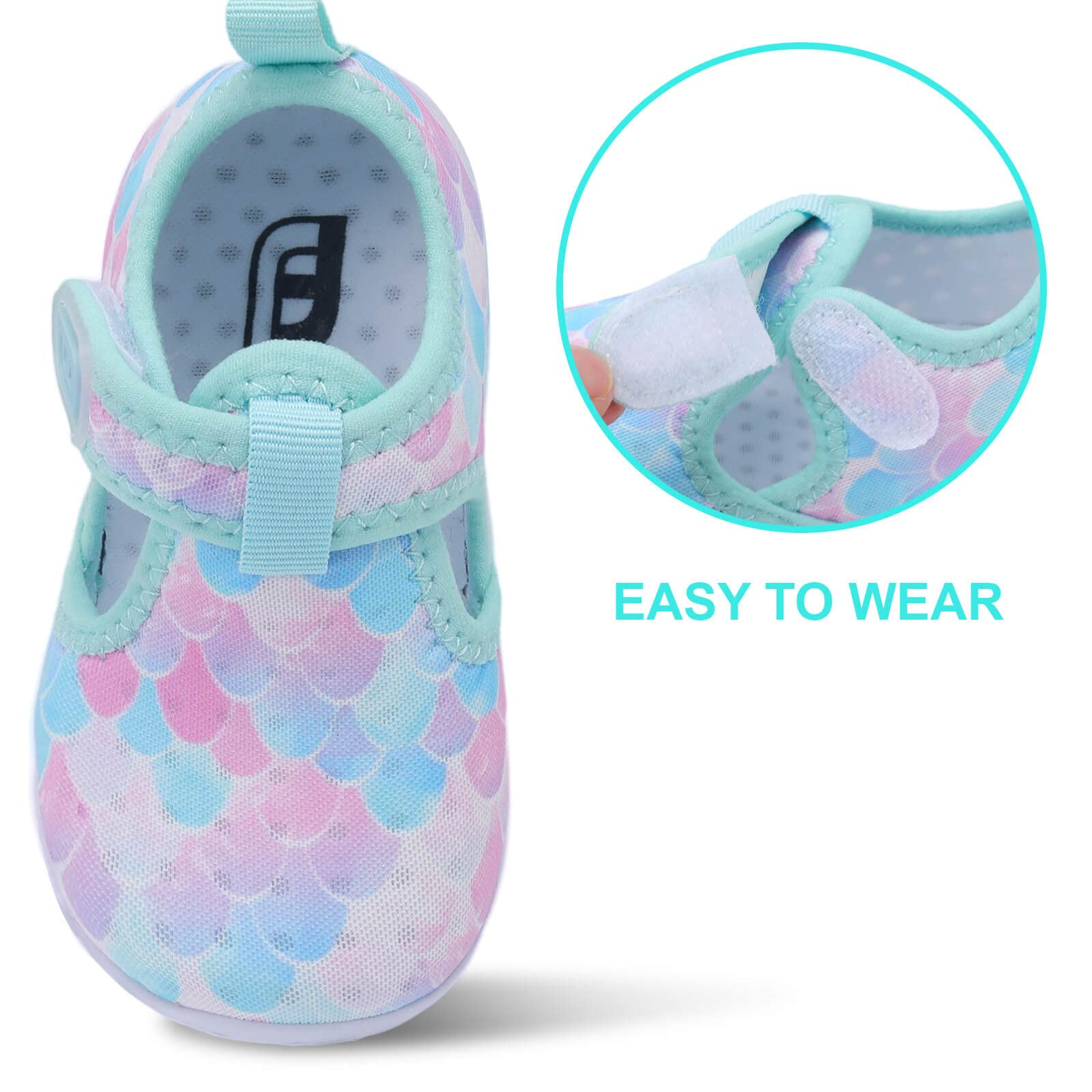 Convenient to wear: Slip on and Hook-and-Loop design makes these toddler water shoes easy to wear and take off. Elastic shoe neck design reduce abrasions when walking or running