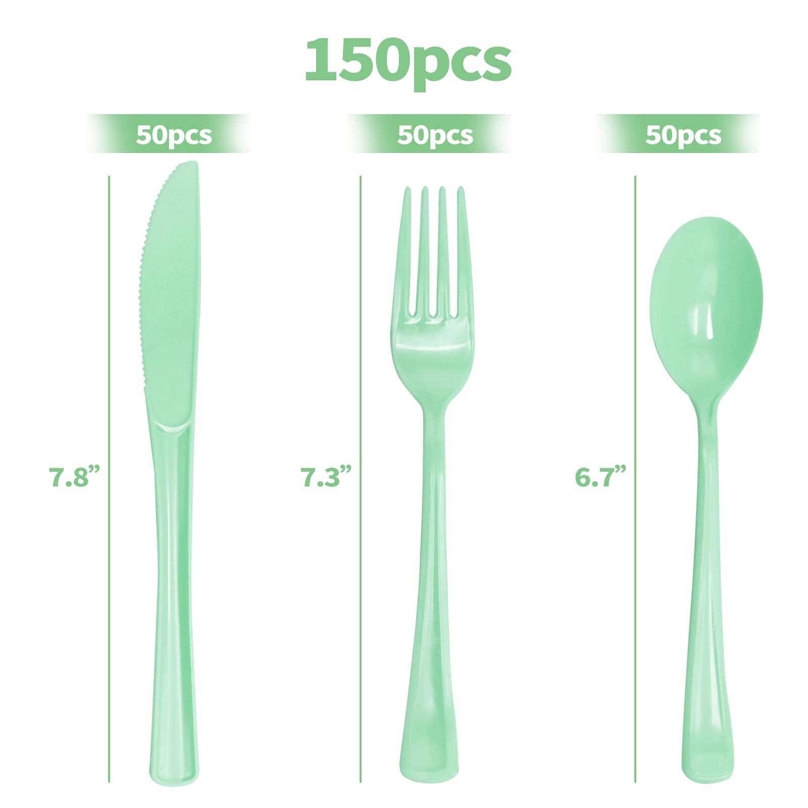 【Sufficient Quantity】: This sage green plastic silverware includes 50 green plastic forks, 50 green spoons and 50 green knives, total 150 plastic silverware. Perfect for St.Patrick's Day, wedding, birthday, baby shower , picnic or whatever your celebrated event is. No need to worry about insufficient cutlery, one-time preparation, easy to meet the needs of the party.