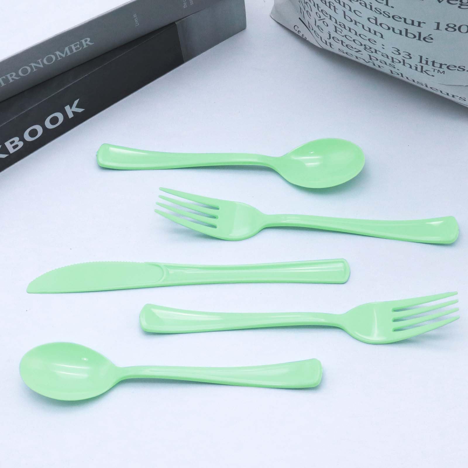 【Fresh Color Design】: Mint green is a color full of vitality and hope, which can give people a calm and comfortable feeling. The sage green exterior design can add a fresh and natural atmosphere to the table. Green plastic utensil sets are not only practical tableware, but also stylish decorations that add a decorative touch to your table.