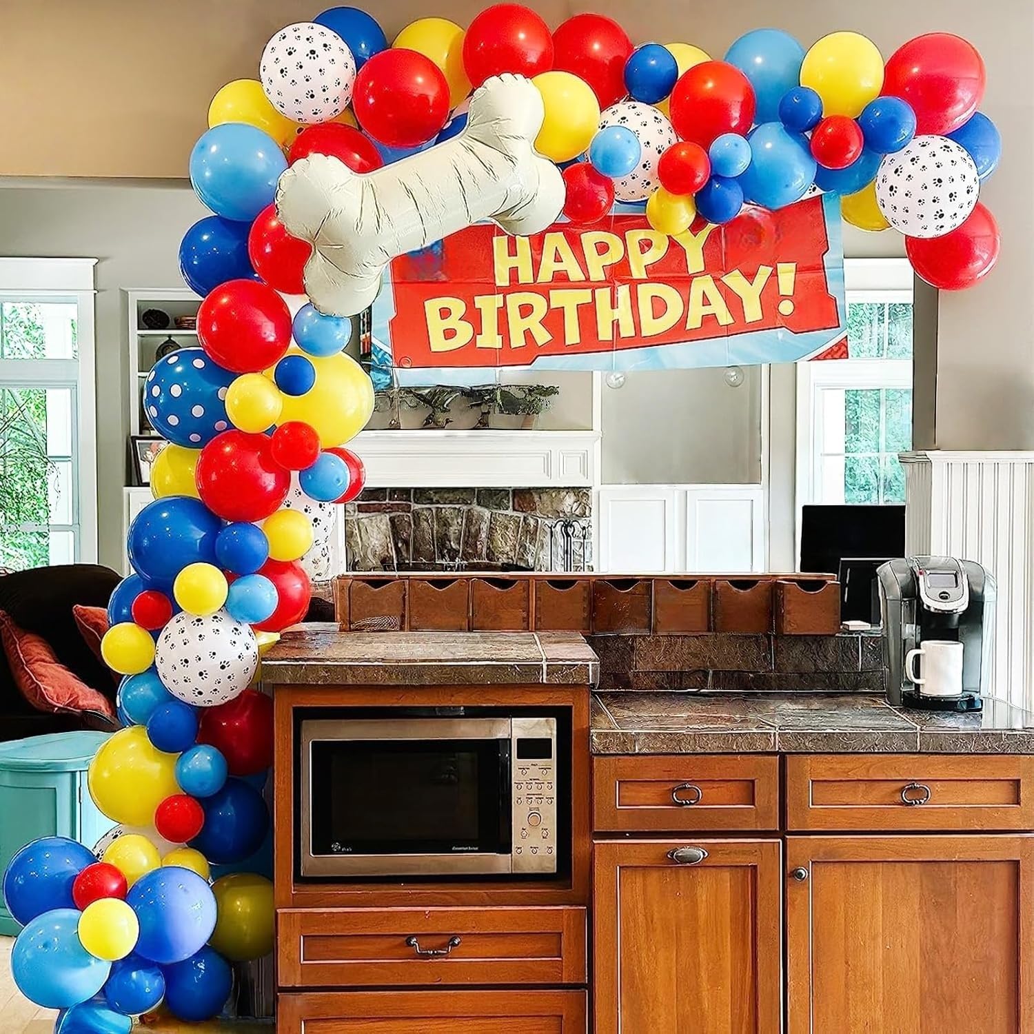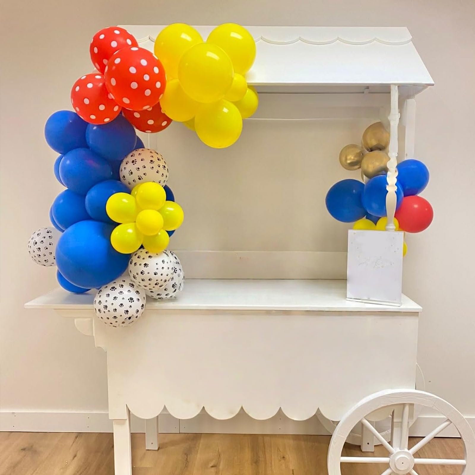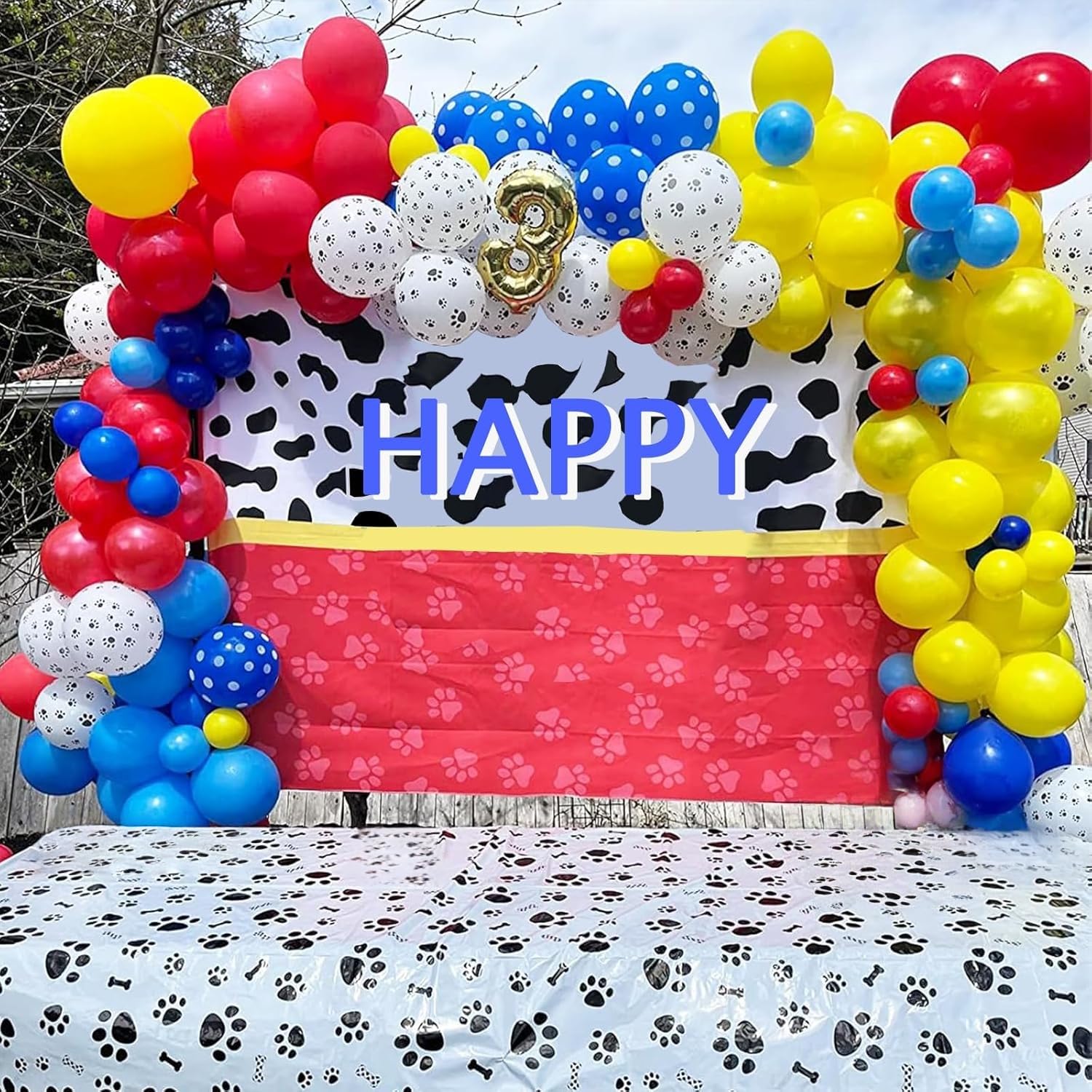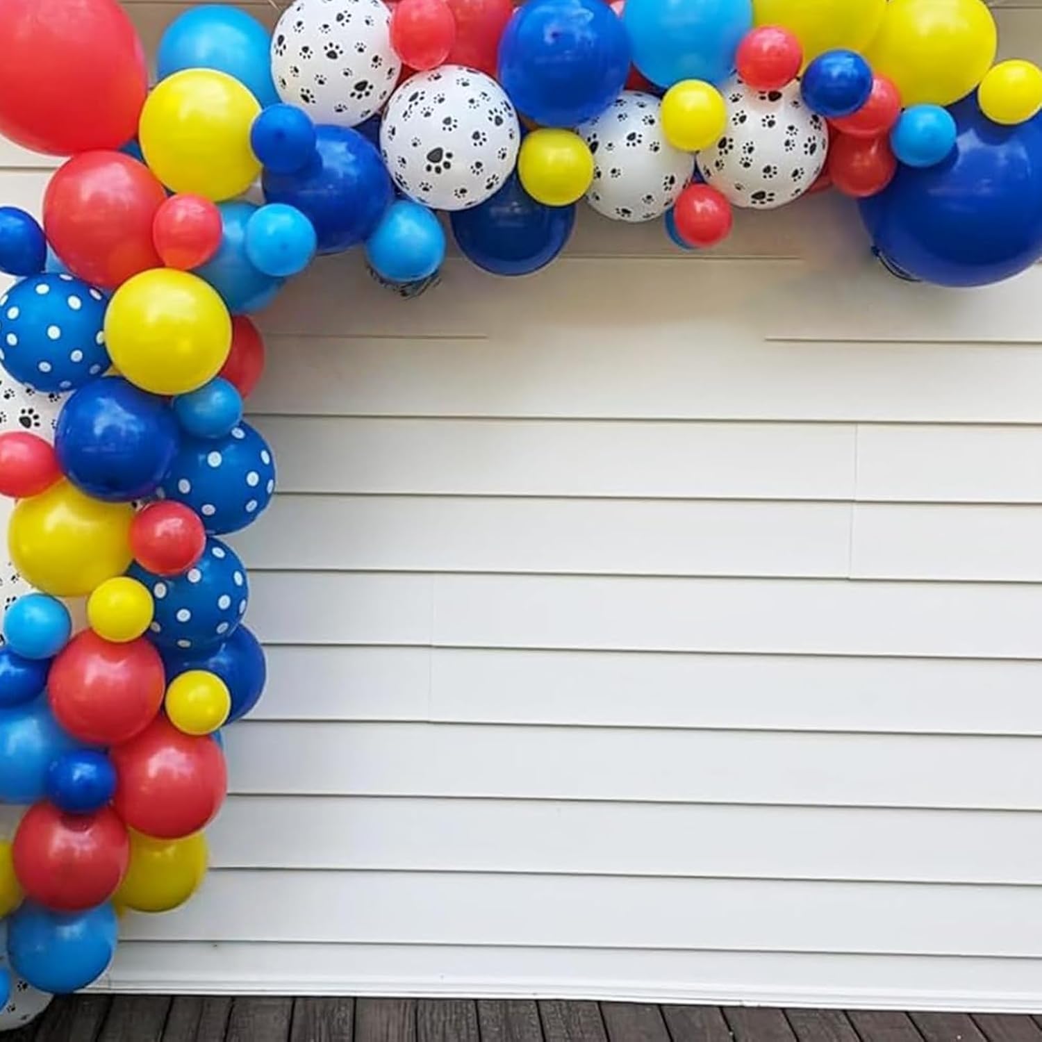 Dog Paw Party Balloons: 30pcs 12 inch balloons set, include 5pcs Dog Printed balloons, 5pcs red latex balloons, 5pcs dark blue latex balloons, 5pcs light blue latex balloons, 5pcs yellow latex balloons, 5pcs colorful confetti latex balloons and 1pc ribbon. Perfect for a puppy theme party