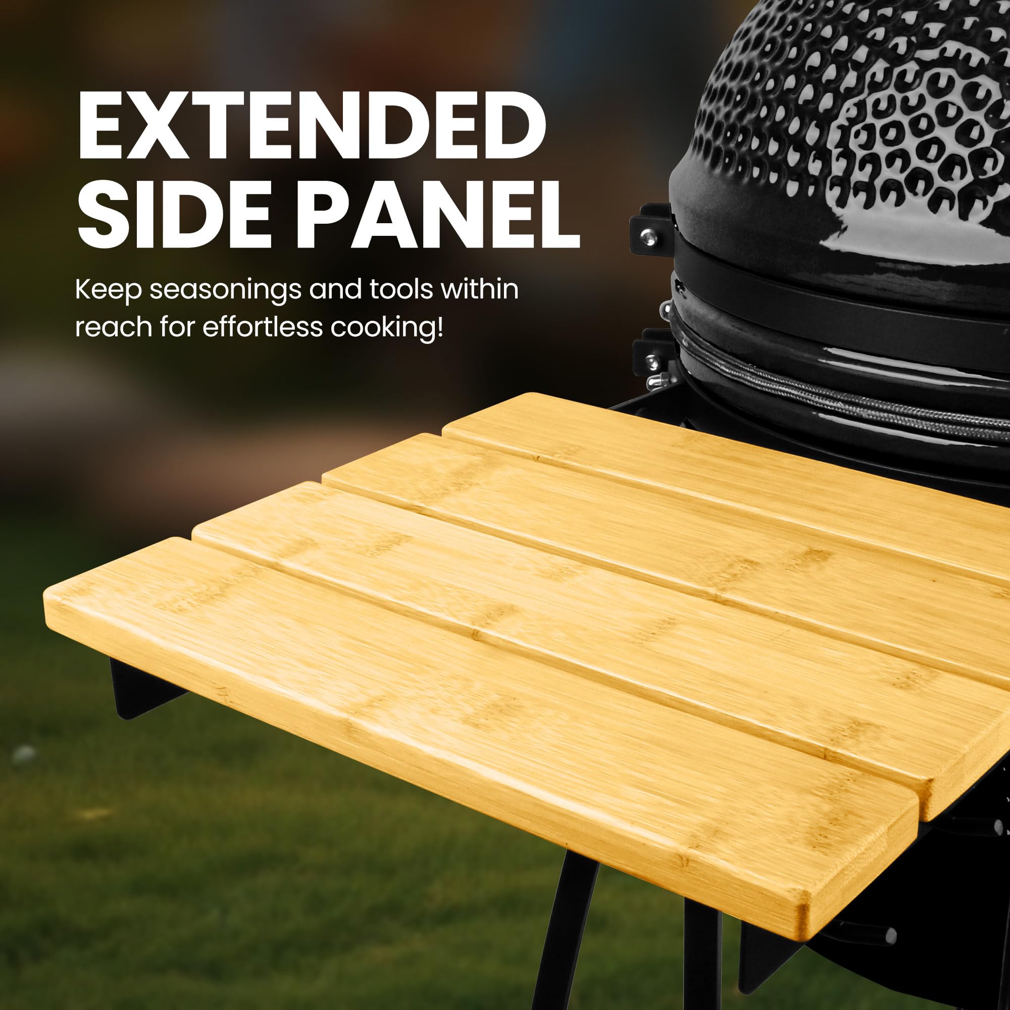IDEAL SIZE WITH EXPANDED FUNCTIONALITY- The compact 15.4” ceramic body (13.2” cooking grate) is perfectly sized for couples and families, saving space without sacrificing performance. The added foldable side shelves maximize your workspace, while the integrated locking casters make full use of your outdoor area by enabling flexible placement and storage.