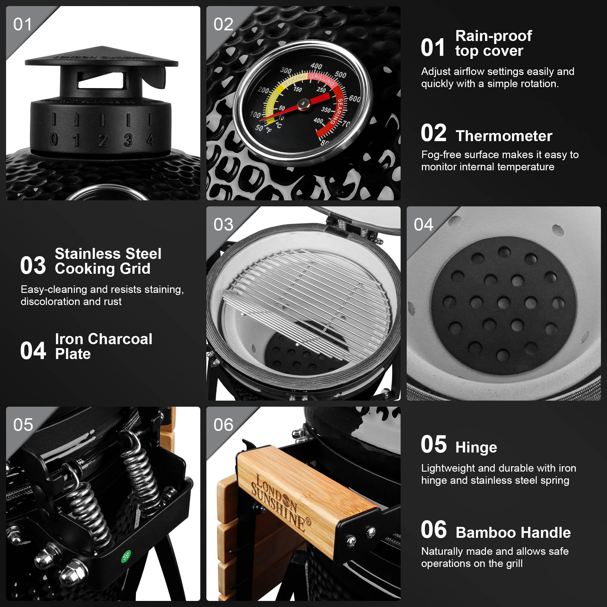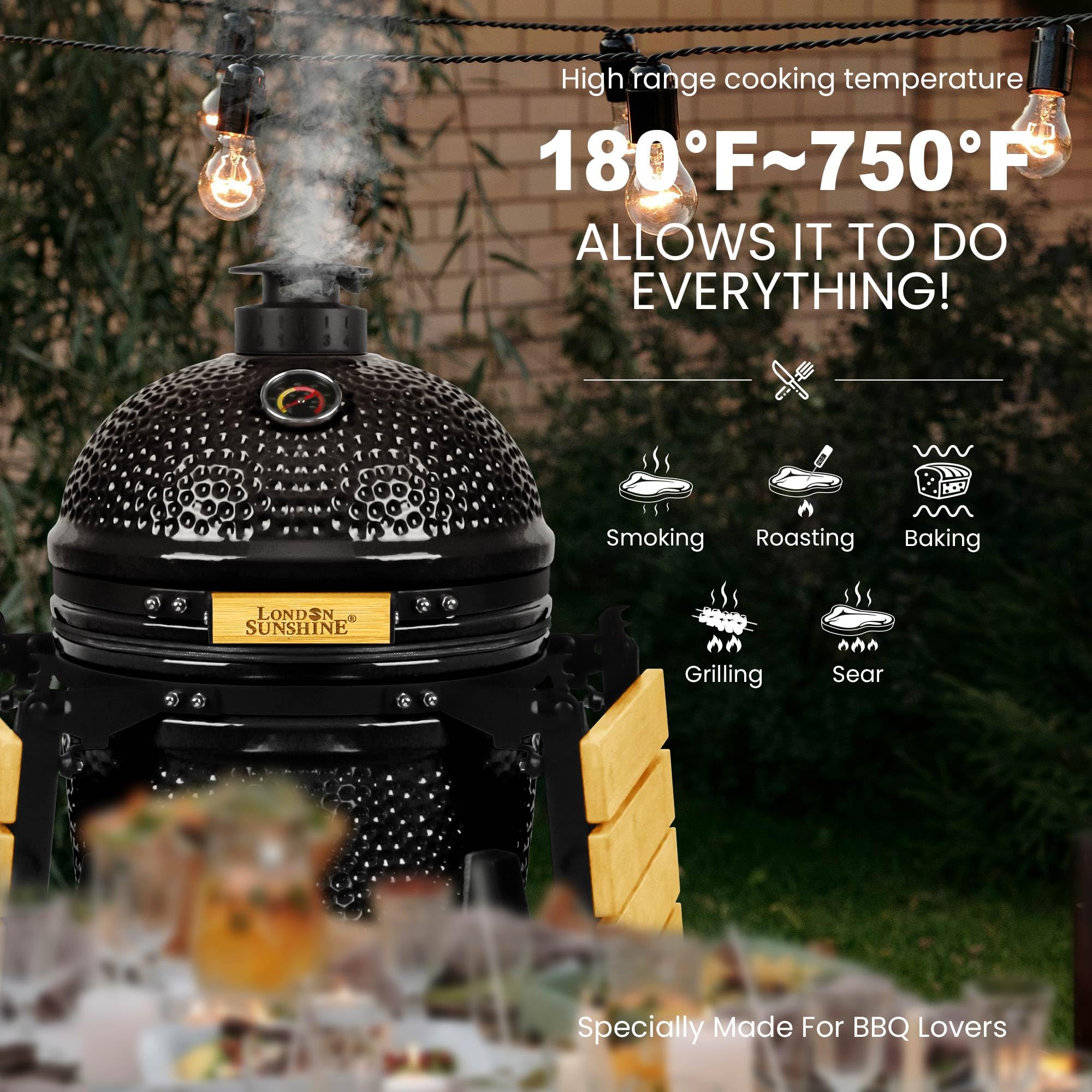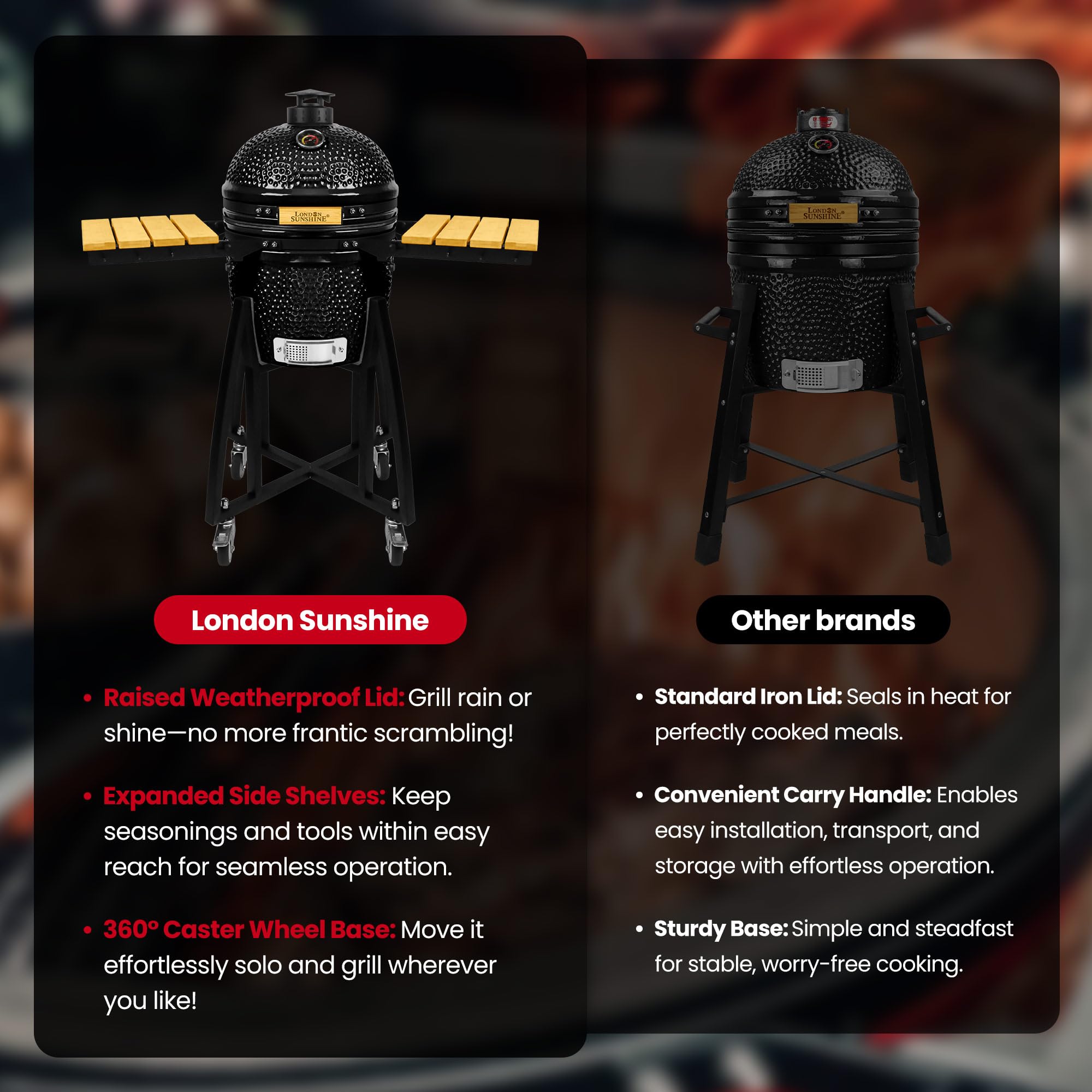 LONDON SUNSHINE CERAMIC KAMADO CHARCOAL BBQ GRILL - The Junior Pro Series 15.4" Ceramic Body with 13.2" Stainless Steel Grill, Locking Casters & Foldable Side Shelves Discover the perfect compact Kamado grill, now upgraded to the Junior Pro Series for unparalleled convenience and versatility. Featuring a robust 15.4-inch ceramic body and a precise 13.2-inch cooking surface, this grill is ideal for small families or intimate gatherings. The latest enhancements—locking casters for effortless mobility and stability, and foldable side shelves for added prep space—make it the ultimate all-in-one outdoor cooking solution. A high-quality glass fiber gasket ensures a perfect seal, locking in smoke and flavor for truly authentic BBQ results. Freestanding and classically designed with a brilliantly glazed colorful body, this grill is more than just a tool—it's the centerpiece of your backyard paradise. The Origin Of Kamado The name KAMADO originates from an ancient cooking tradition dating back over 3,000 years. “KAMADO” is the Japanese word for “stove,” literally meaning “place for the cauldron.” It represents a simple yet incredibly efficient method of cooking food to perfection. Advantage of Our Ceramic Kamado Grill Superior Heat Management: The unique egg shape promotes excellent heat circulation, ensuring food is cooked evenly. The thick ceramic walls retain moisture for juicier results. Exceptional Heat Retention: The massive heat storage capacity allows for consistent low-and-slow smoking or high-heat searing. The built-in thermometer lets you monitor the temperature with ease. Unmatched Versatility: Master every cooking method—Grilling, Searing, Baking, and Smoking—in any season. New Premium Features: Locking casters make moving your grill safe and simple, while the foldable side shelves provide essential workspace that stows away neatly. SPECIFICATIONS Ceramic Body Diameter: 39 cm / 15.4 inch Cooking Grid Diameter: 33.5 cm / 13.2 inch Assembled Dimension (LWH): Approx. 50 * 53 * 85 cm Package Dimension (LWH): 71 * 49 * 65.5 cm Net Weight: 46 kg Gross Weight: 50 kg PREMIUM MATERIALS & CONSTRUCTION Top Vent: Heavy-Duty Cast Iron for precise airflow control. Handles & Hardware: Heavy Iron construction for durability and safety. Stand & Band: Heavy-Duty Iron stand with integrated Locking Casters for stability and mobility. Cooking Grates: 13.2" Stainless Steel (6mm Wire), foldable on one side for easy charcoal addition. Fire Box & Ceramic Body: High-grade ceramic resistant to 1000° Celsius. Gasket: High-Temperature Glass Fiber for an superior seal. New Additions: Integrated Foldable Side Shelves.