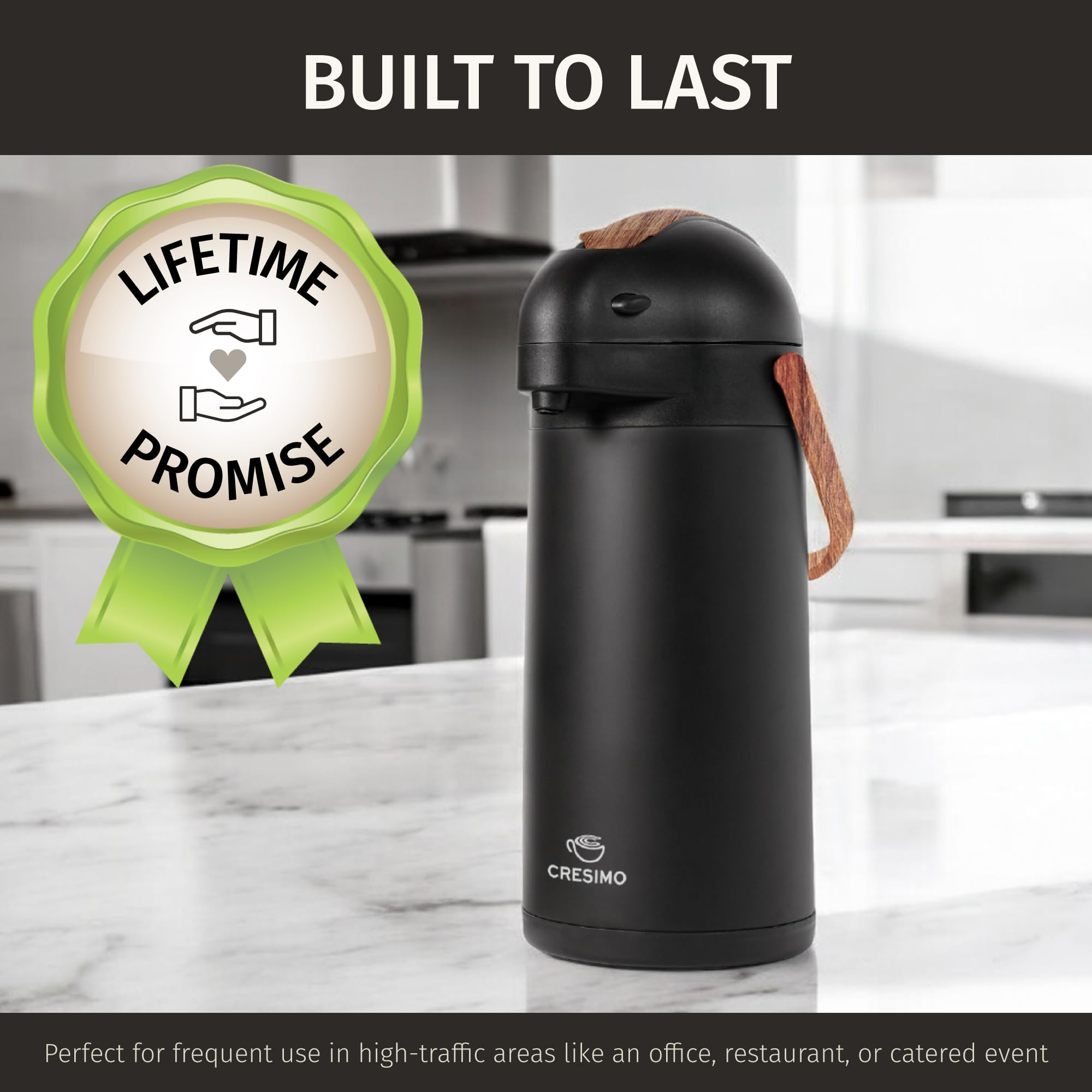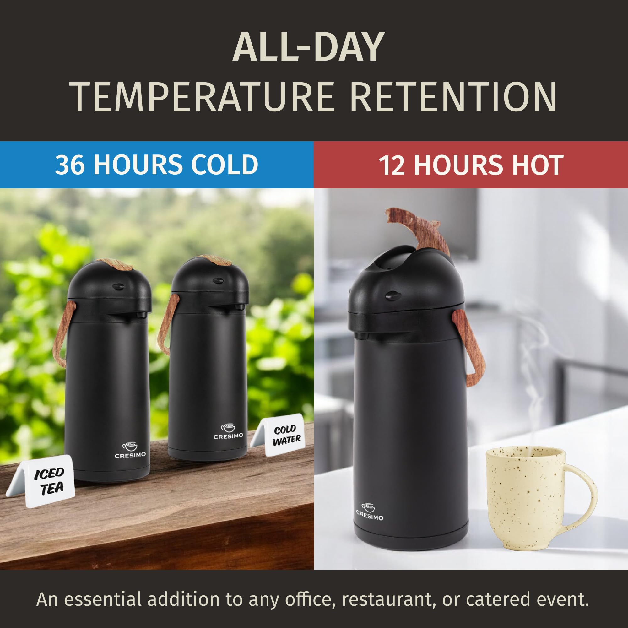 ENJOY ALL-DAY TEMPS — Modern wood-trim handle on a thermal coffee airpot / coffee dispenser with pump that keeps drinks hot up to 12 hours or cold for 36 via double-wall vacuum-insulated 18/8 stainless steel.
