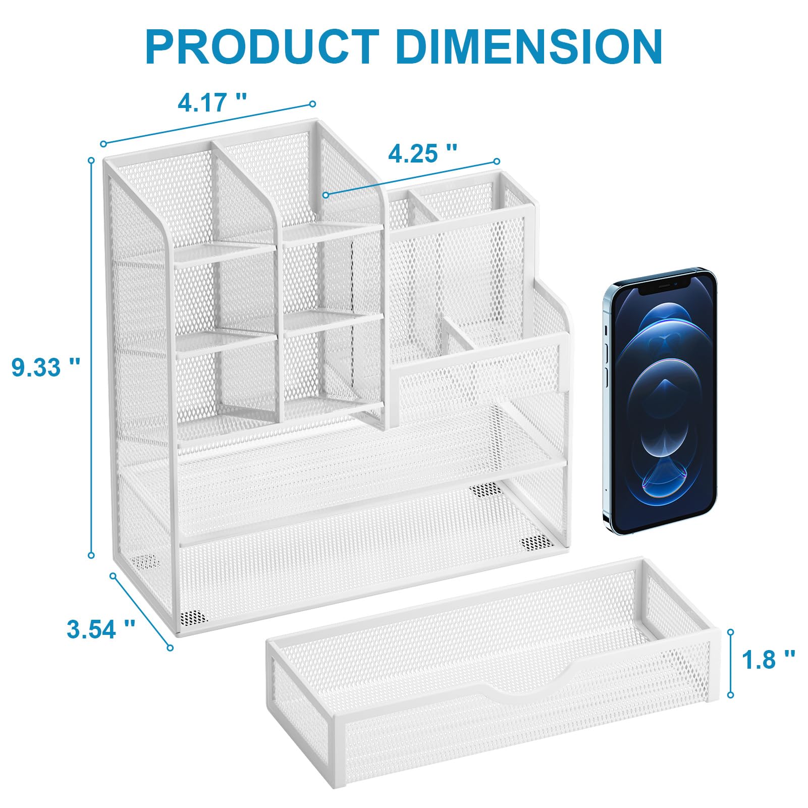 【ENOUGH CAPACITY】: This desk organizer set of 6 tilt compartments, 4 flat bottom compartments slots, 1 tray compartment, and 1 drawer, to store a wide variety of items. Multifunction help you arrange the desk gadgets and stationary clean and tidy.The best and safest storage option for you. Perfect Size:9.33*8.5*3.54inch.