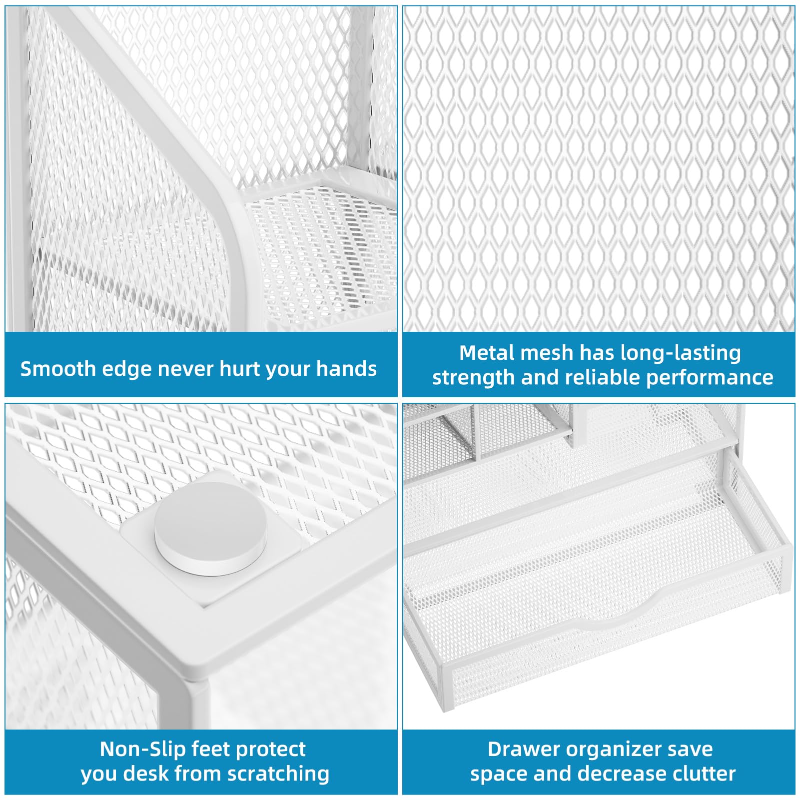 【STURDY AND DURABLE】: The desk storage is made of high-quality metal mesh and built with non-skid feet to make it incredibly stable, which is not easy to get rusty and thereby, keeping the pen holder brand new all the time. The extremely smooth edges will not hurt your things or yourself. for meeting all your demands for home and office use.