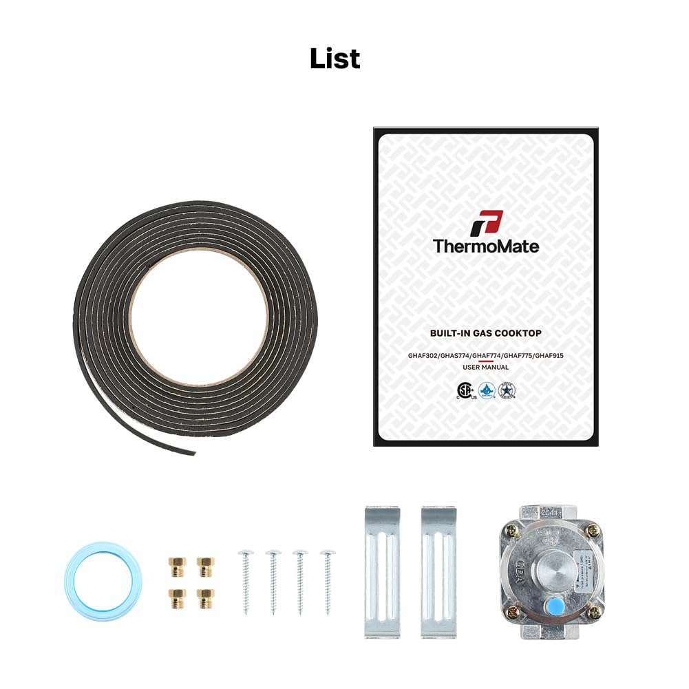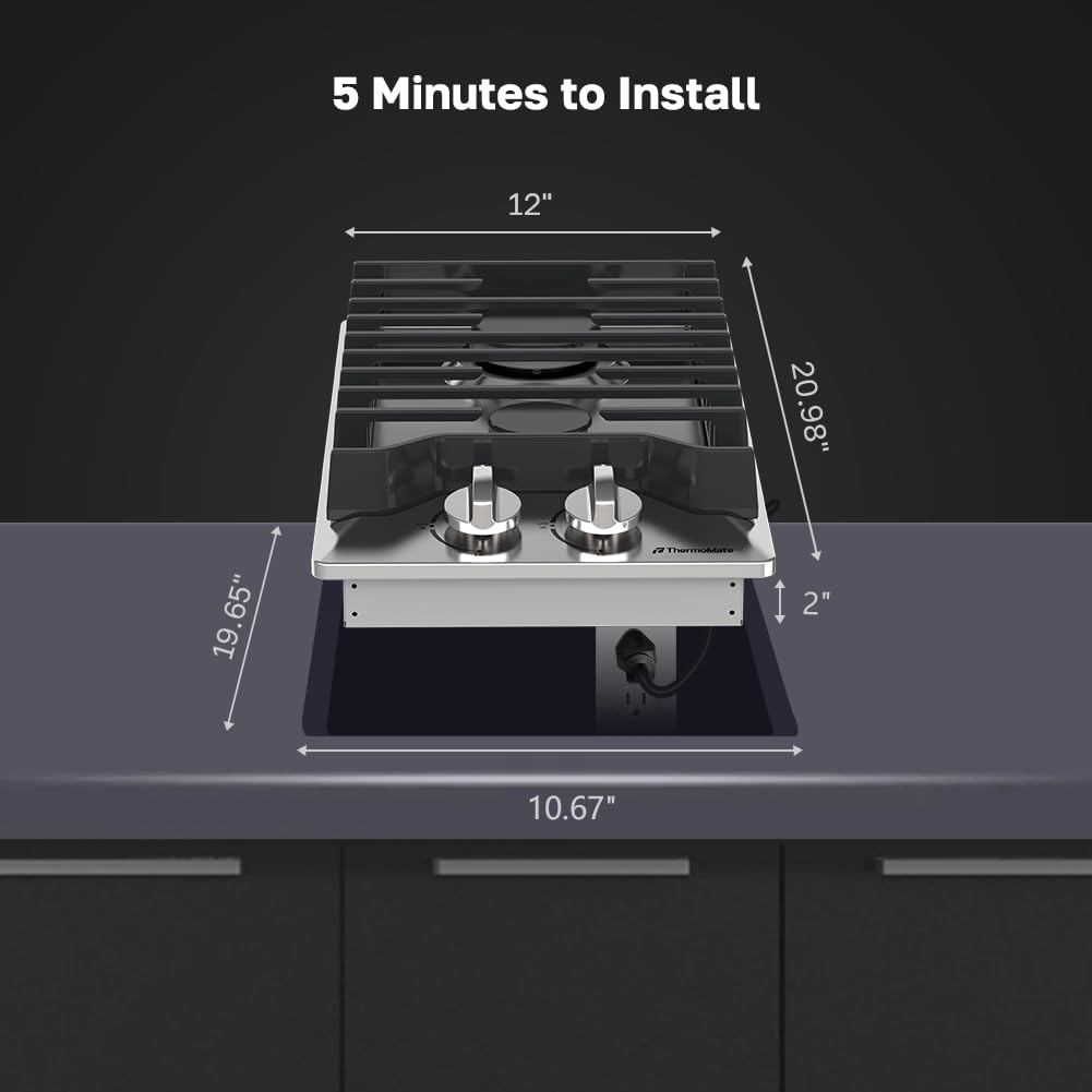 5 Minutes to Install: Please verify the gas hob is the right size for you. Product size: 12” W × 20.98” D × 2” H, cut out size: 10.67” W × 19.65” D. 120V AC pulse ignition with 3.9 feet (1.2 m) power cord for quick connection. NOTE: the gas pressure regulator included is for NG use only