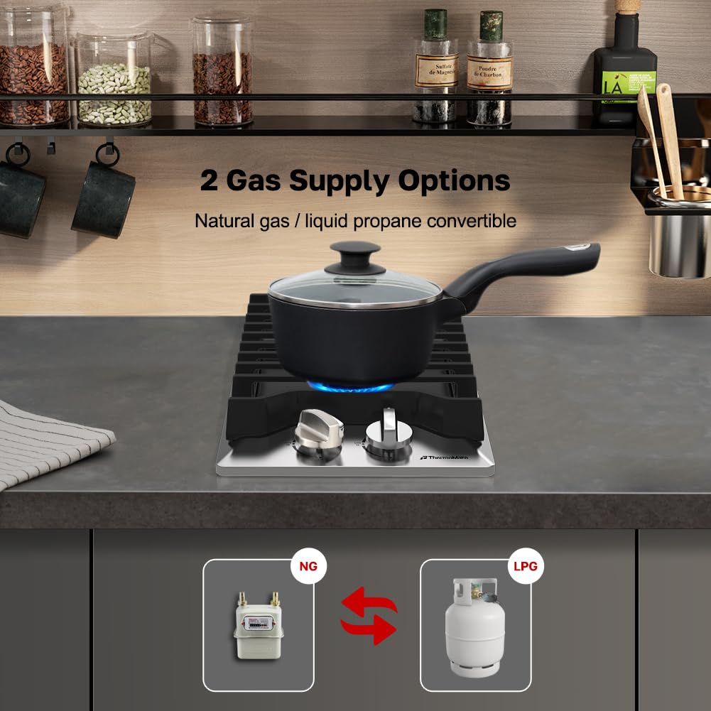 2 Gas Supply Options: The gas cooktop stove delivers the maximum 17,300BTU power to natural gas ( Preinstalled for NG) and liquid propane gas(LPG Conversion Kit included), you can choose either gas supply as you like. Capable for multi-purpose such as big kitchen, mobile home, cooking lover family, etc.