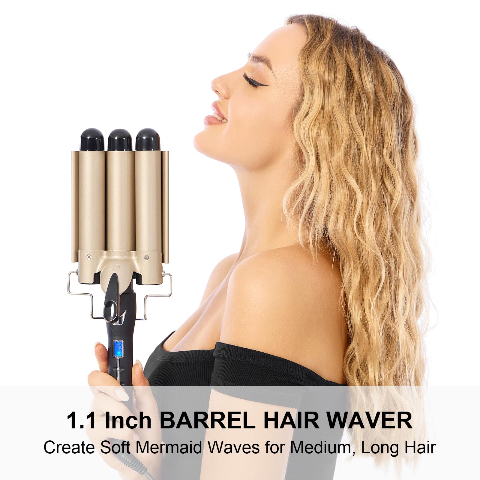 【Three 1.1" barrel: Instantly create WAVY MERMAID HAIR in seconds】This must-have hair crimping irons creates beachy, boho or glam waves in seconds, making it super easy for anyone to do. It's the game-changer for hair - any length or texture. Simply clamp down and release for instant, big, lush waves.