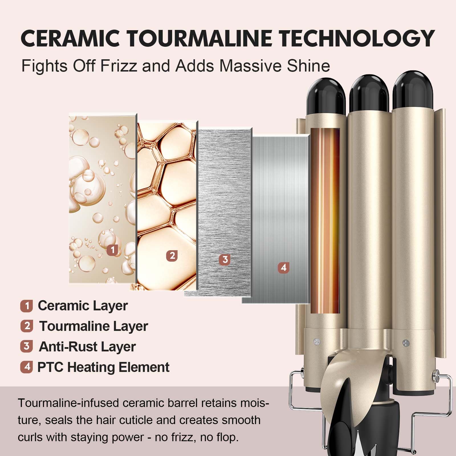 【Tourmaline Ceramic Technology: Fights off frizz and adds massive shine.】 The ultra-smooth ceramic -coated barrel prevents your hair from getting caught, tangled or damaged by the heat. Tourmaline prevents your hair from becoming static by releasing negative ions, so that even the most dry or damaged hair remains frizz-free. Finally, the natural oils in your hair are protected by sealing in moisture and closing hair follicles on contact. Creating frizz-free, shiny curls has never been this easy!