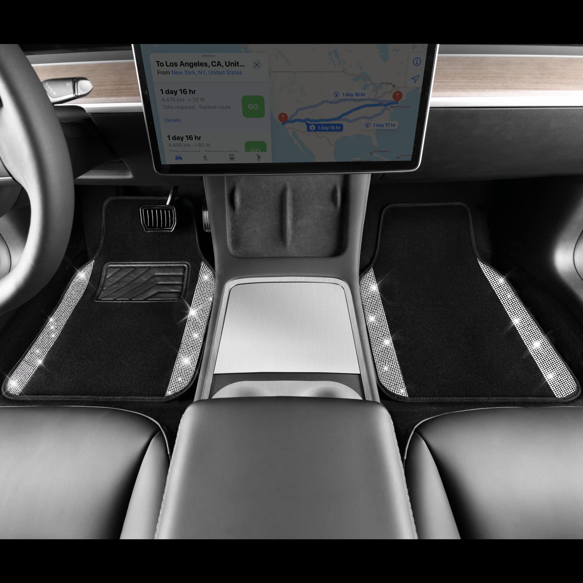 SIZE AND COLOR - Universal Size fits most vehicles: car, sedan, SUVs, truck, vans. Front Mats: 17.3" W x 25.2" L, Rear Mats 11.8" W x 17.3" L. Package Includes (4pcs) : Front Mat*2, Rear Side Mat*2. There are sparkling diamonds in different colors on the side of the mat, those diamonds make your car beautiful and shiny. Perfect cute gift for women and girls.