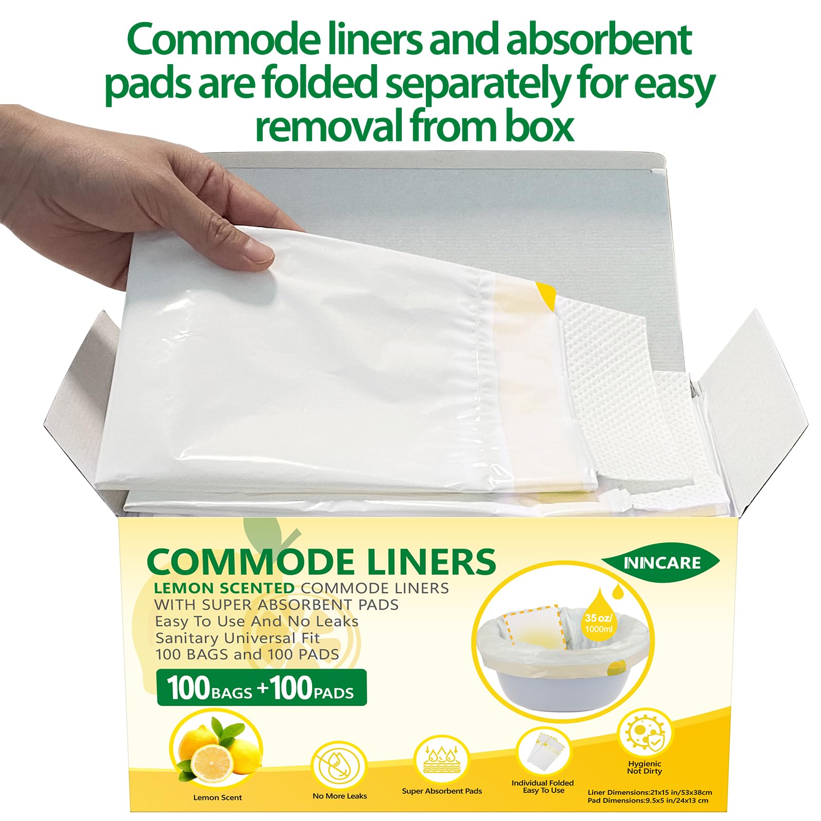 Value Pack - This set comes in a sturdy box and includes 100 commode liners and 100 super absorbent pads.These 100 commode liners disposable are much easier to get out of the box as they are individually folded instead of a roll.