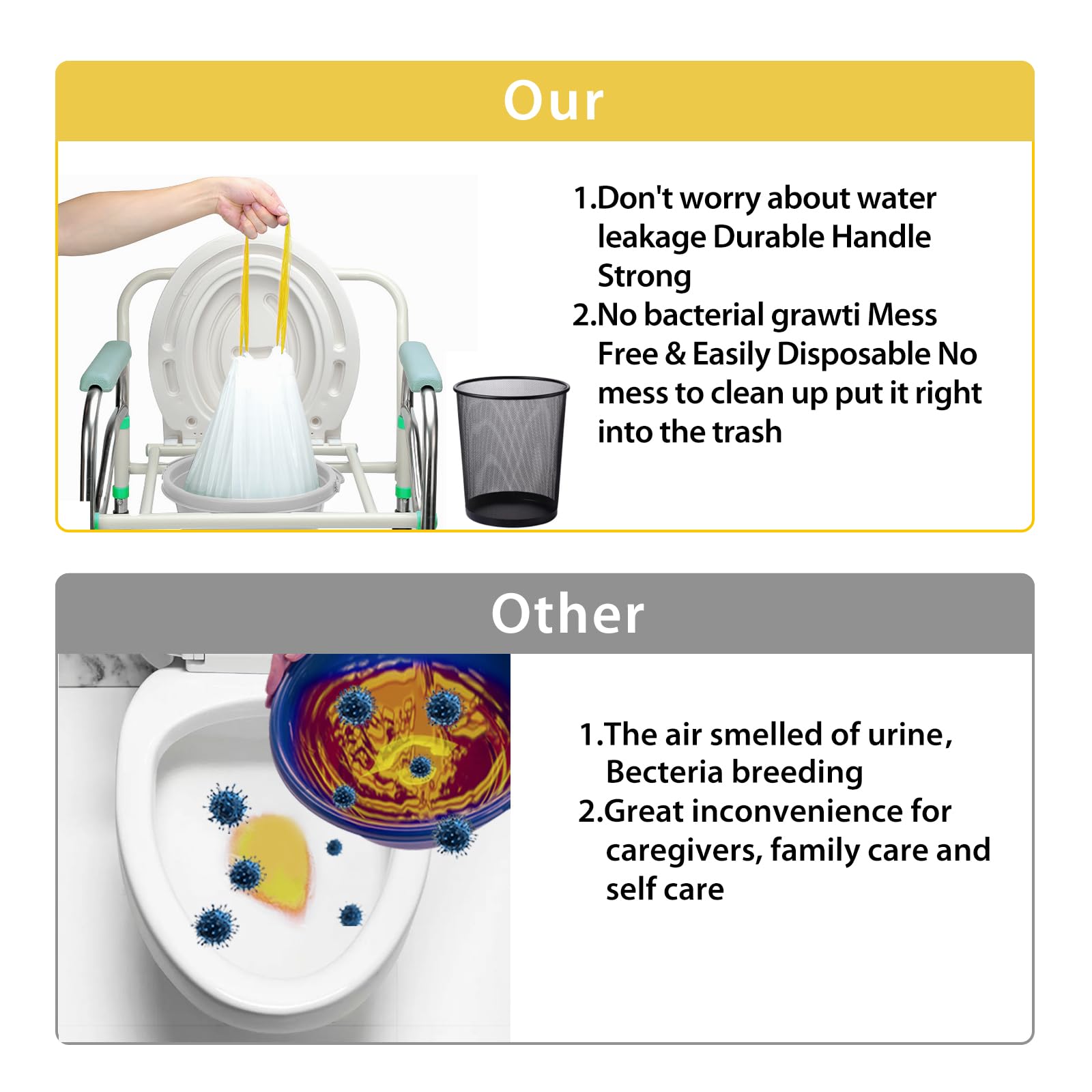 KEEP YOUR ENVIRONMENT TIDY - Make cleanup easy. No more scrubbing or cleaning dirty toilets, simply throw away disposable liners like a garbage bag after use to restore your dignity and prevent your caregivers or family from smelling urine in the bedroom.