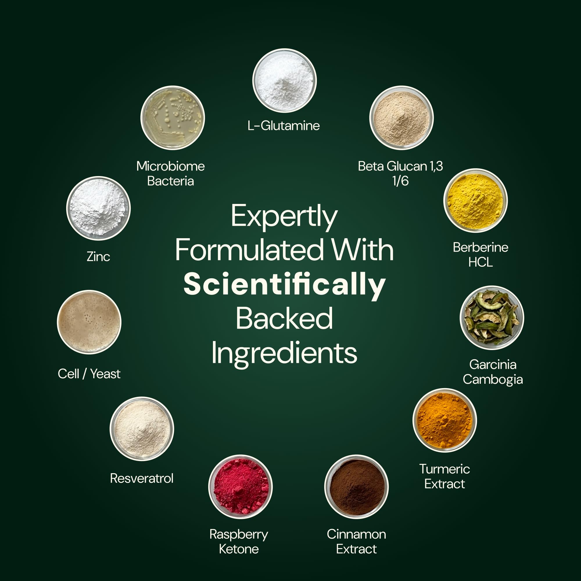 𝟏𝟎-𝐈𝐍-𝟏 𝐁𝐎𝐓𝐀𝐍𝐈𝐂𝐀𝐋 & 𝐏𝐑𝐎𝐁𝐈𝐎𝐓𝐈𝐂 𝐂𝐎𝐌𝐏𝐋𝐄𝐗: Each serving delivers Berberine HCL 95%, Turmeric Extract 95% Curcuminoids, Cinnamon Extract, Raspberry Ketone, Resveratrol 98%, Beta Glucan 1,3/1,6, L-Glutamine, Organic Inulin, Zinc, and 5 probiotic strains — a complete gut and metabolic support stack.*