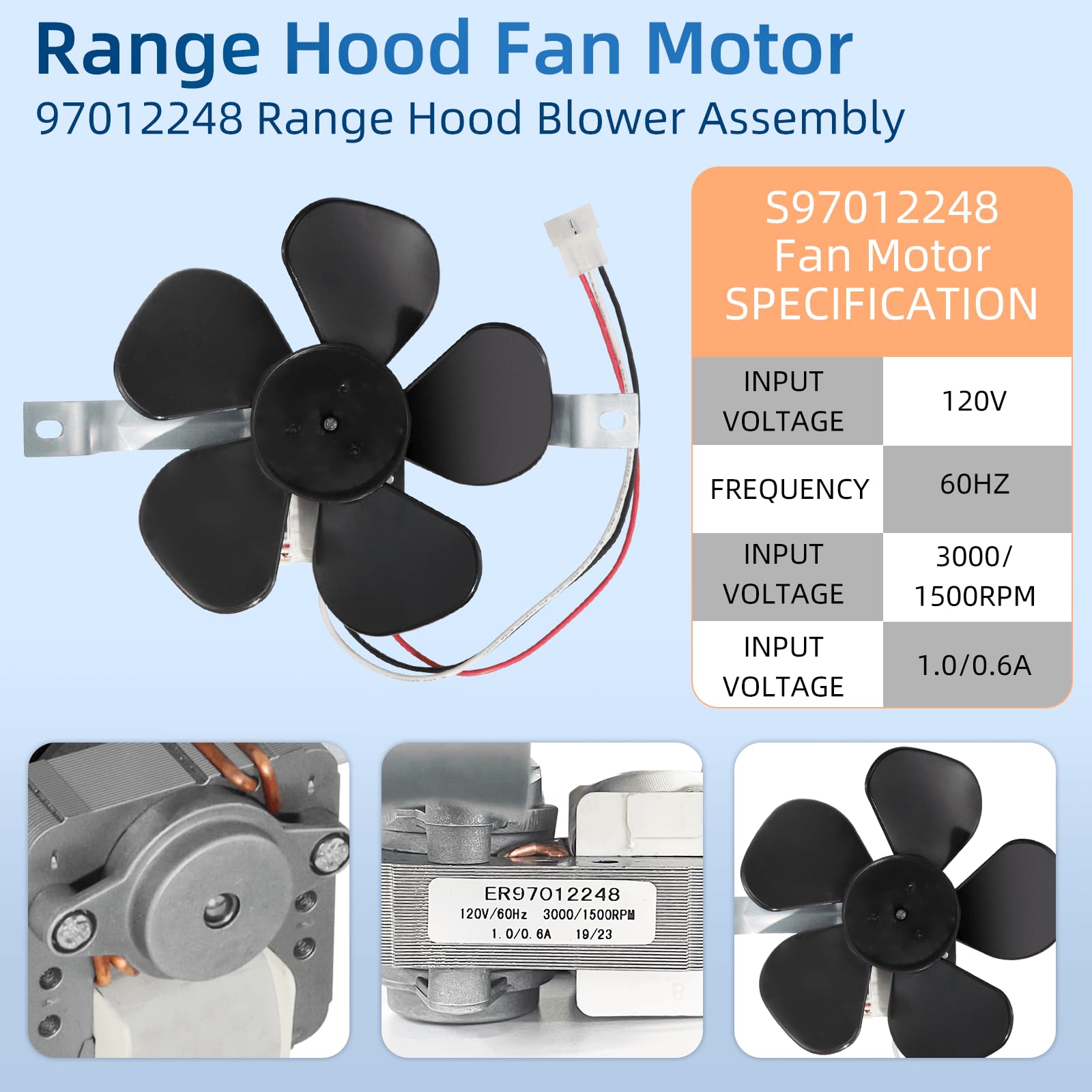 ใ๐ฃ๐ฟ๐ผ๐ฑ๐๐ฐ๐ ๐ฆ๐ฝ๐ฒ๐ฐ๐ถ๐ณ๐ถ๐ฐ๐ฎ๐๐ถ๐ผ๐ปใ97012248 range stove motor assembly includes 1 x Motor, 1 x Bracket and 1 x Fan Blade. This S97012248 Range Hood Motor and Fan is 2 Speed motor, bracket is approximately 8 1/4" on center. Fan blade is 6 1/2" diameter. 120V/60HZ, 3000/1550RPM, 1.0/0.6A, Rotation CCW shaft