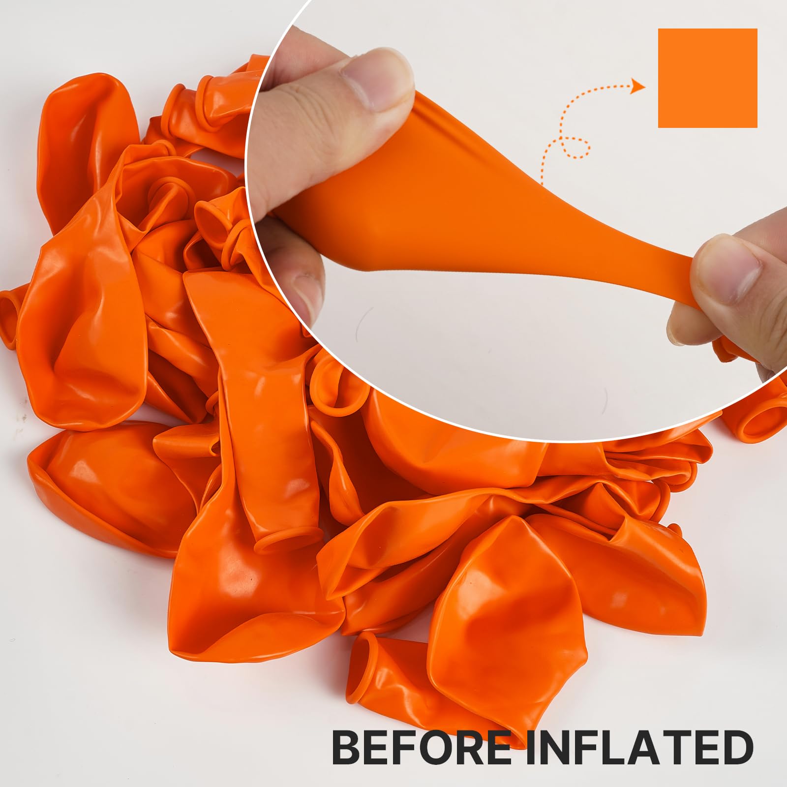 Package includes: 18 inch orange balloons (5pcs), 12 inch orange balloons (30pcs), 10 inch orange balloons (40pcs), 5 inch orange balloons (65pcs), in a solid consistent color. Pay attentions the 5 inch balloons could NOT float when inflated with HELIUM.