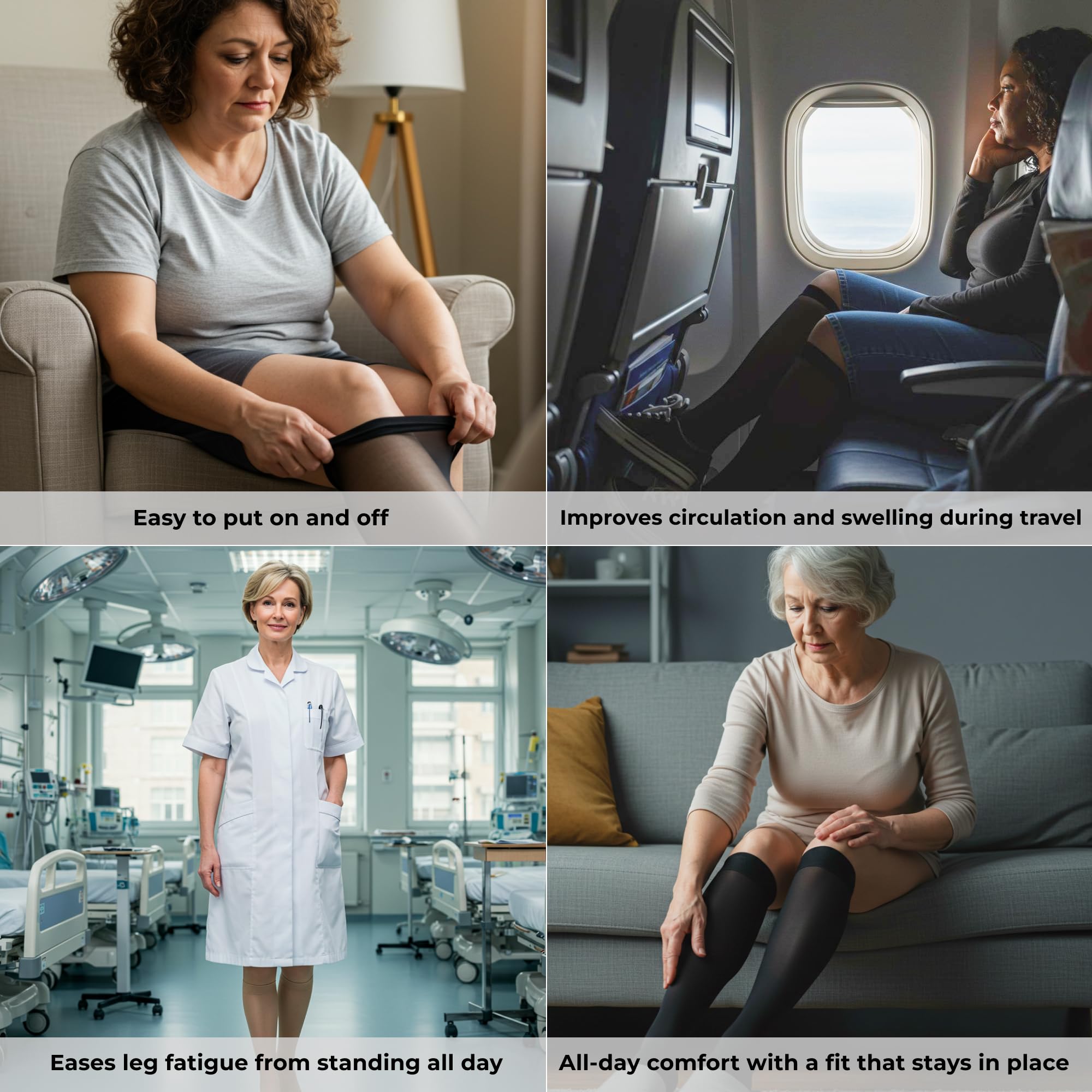 SECURE FIT - Designed with a snug, elastic band that ensures they stay up all day without sliding down, providing consistent compression.