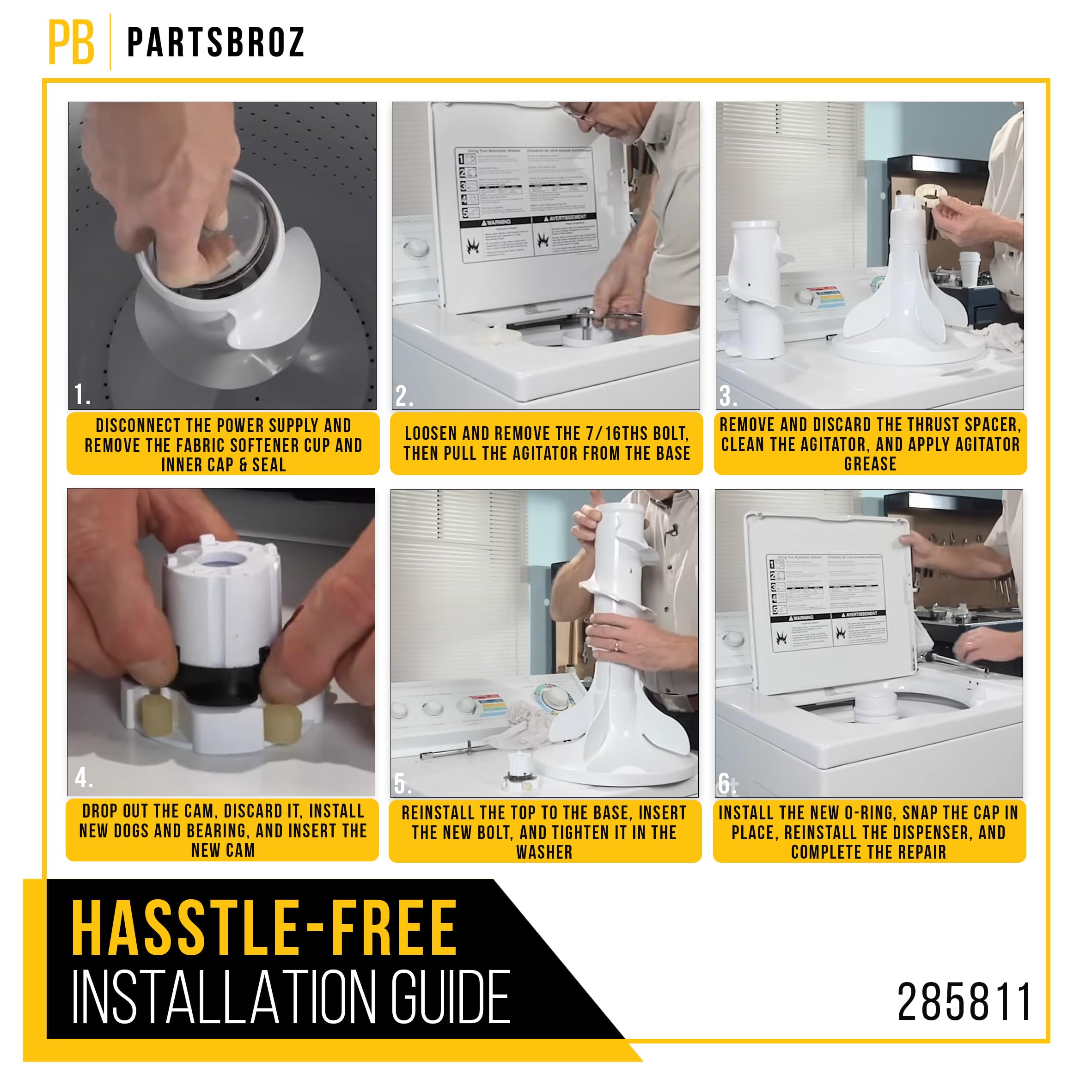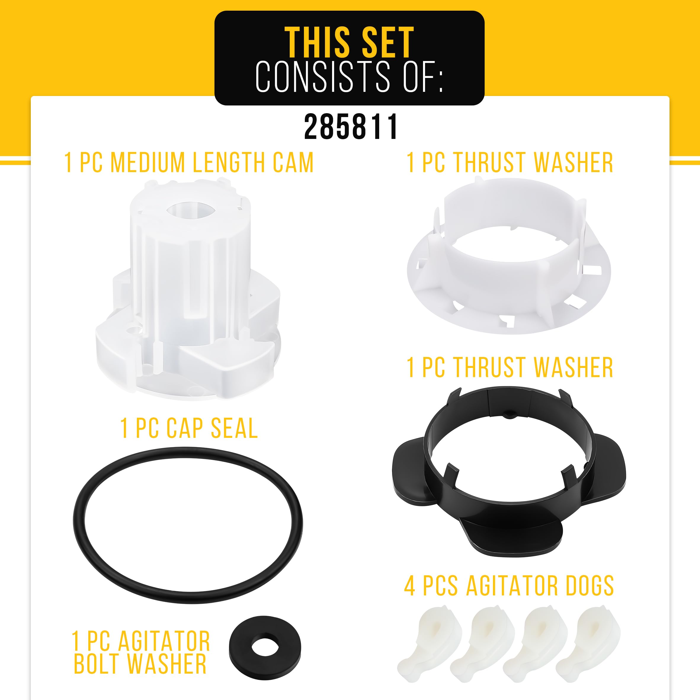 The 285811 Agitator Repair Kit is a direct replacement for part numbers AP3138838, 2744, 285746, 285811VP, 3347410, 3351001, 3363663, 3948431, AH334650, EA334650, and PS334650.