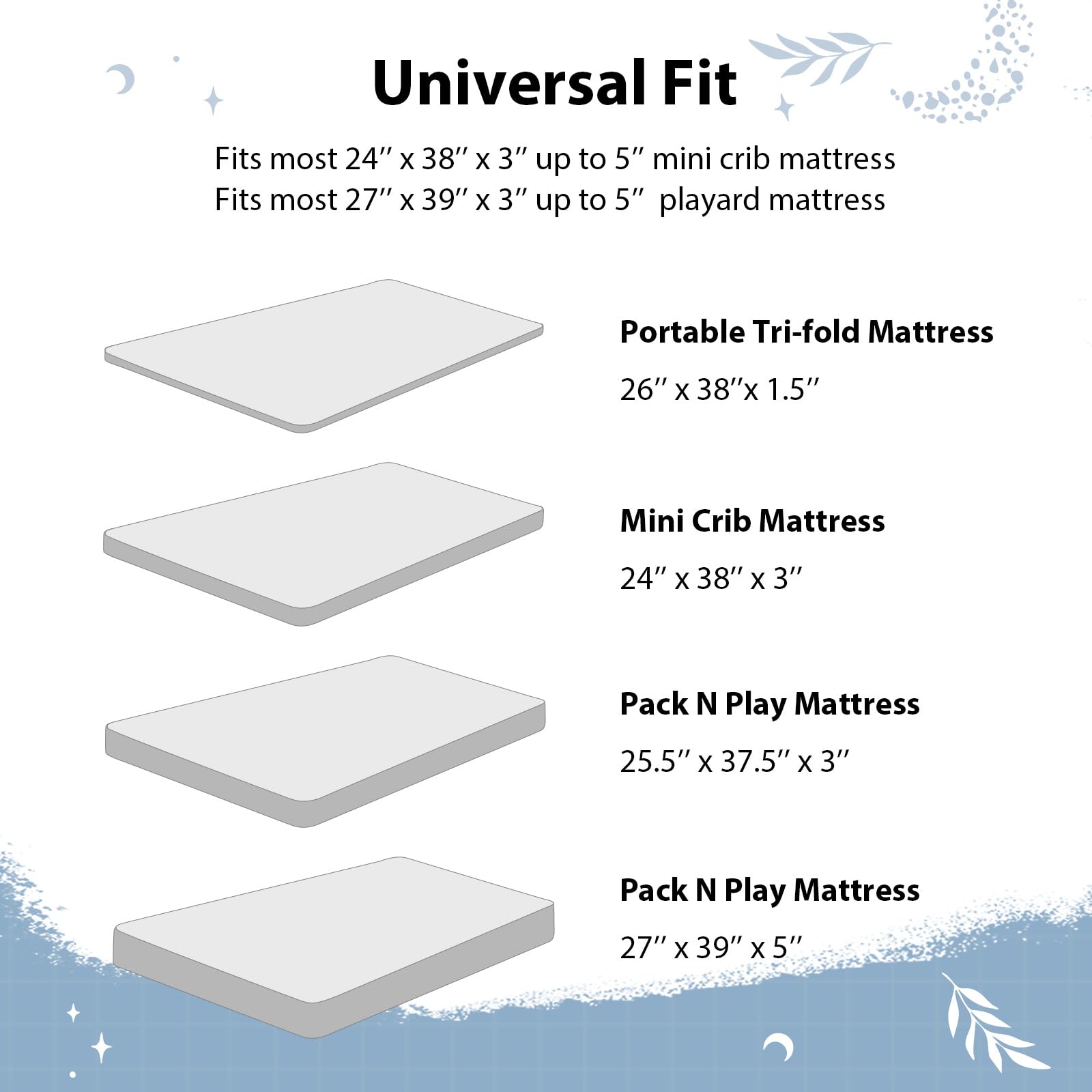 Snug Fit: Measuring 38” x 26”, our 3-pack mini crib sheets fit most baby portable plapens and pack n play mattresses. With elastic bands around the edges of the playard sheets, an 6-inch deep pocket, and stretchy fabric, they ensure a snug, wrinkle-free fit that stays securely in place.