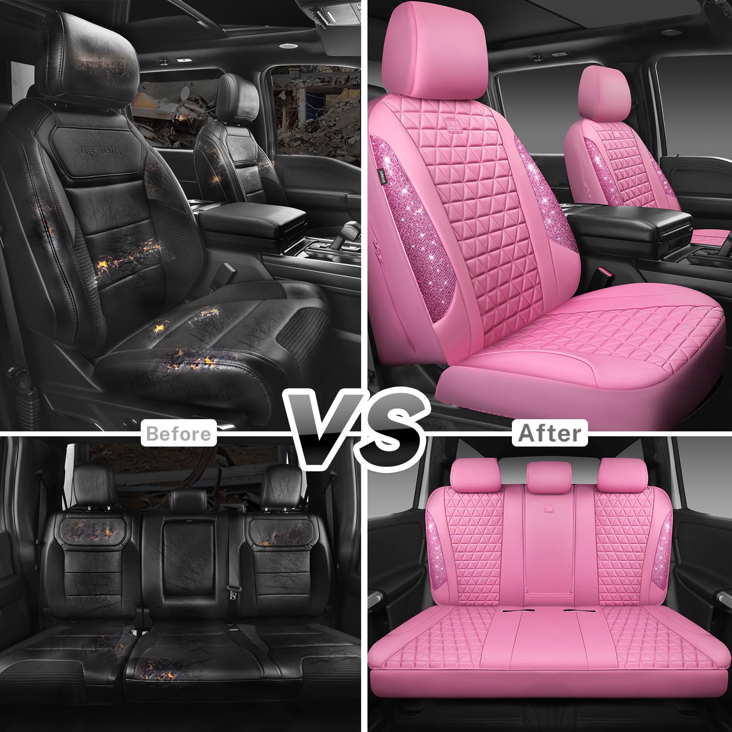 UNIVERSAL SPARKLY DIAMOND - Refresh your car if you install the bing bling crystal diamond leather seat covers, water resistant material. Surface rhombic texture design lined sponge soft and comfortable. Fit for most SUV Sedan Pickup coupe automobile vehicle seats with adjustable headrests. Can be installed with the detachable headrests. Easy to install, with installation manual, can be installed in 10 minutes