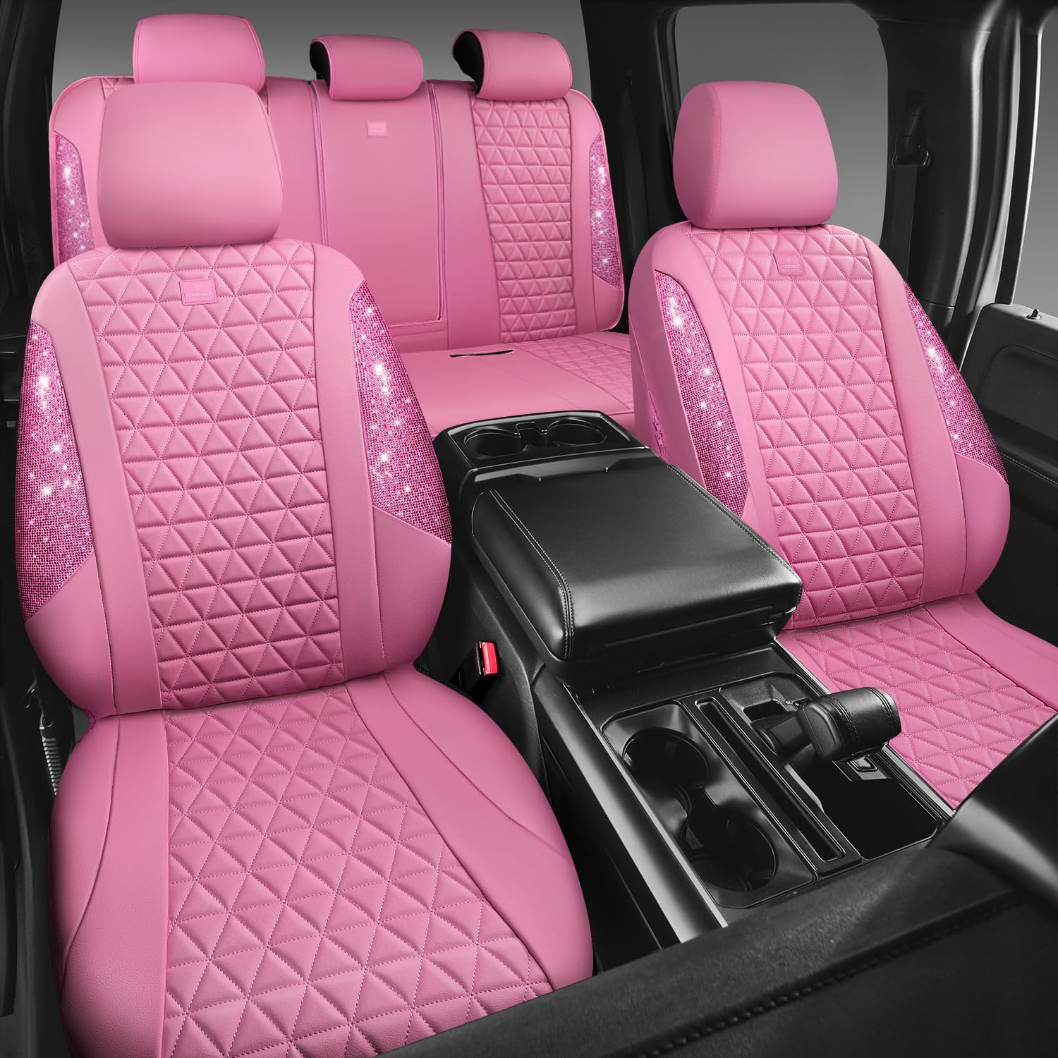 BLING LEATHER SEAT COVER - Premium rhombus leather design lined sponge with pretty rhinestones. Luxury pink pu leather with shiny rhinestones perfect for women, girls. Perfectly match your car's interior look. Ensure your seats of your vehicle will last for many years to come. Refresh your interior look. Beautiful design with good quality. Top grade diamond craftsmanship, firm and not falling off