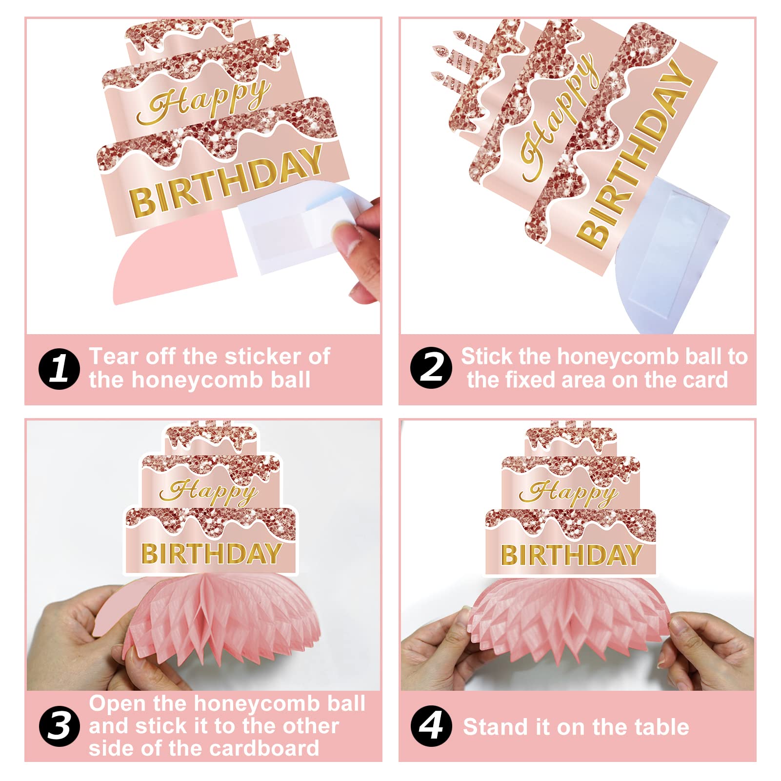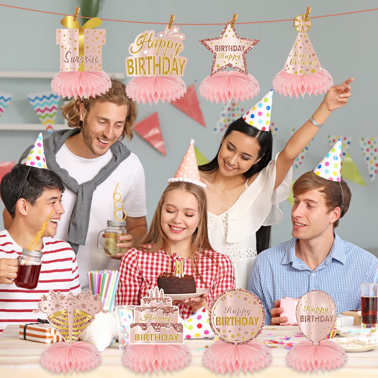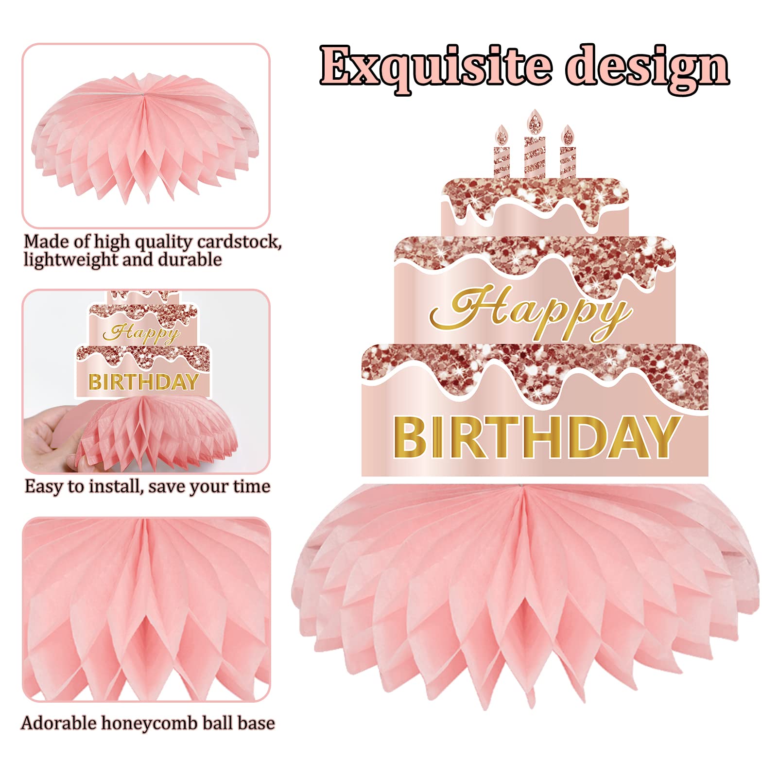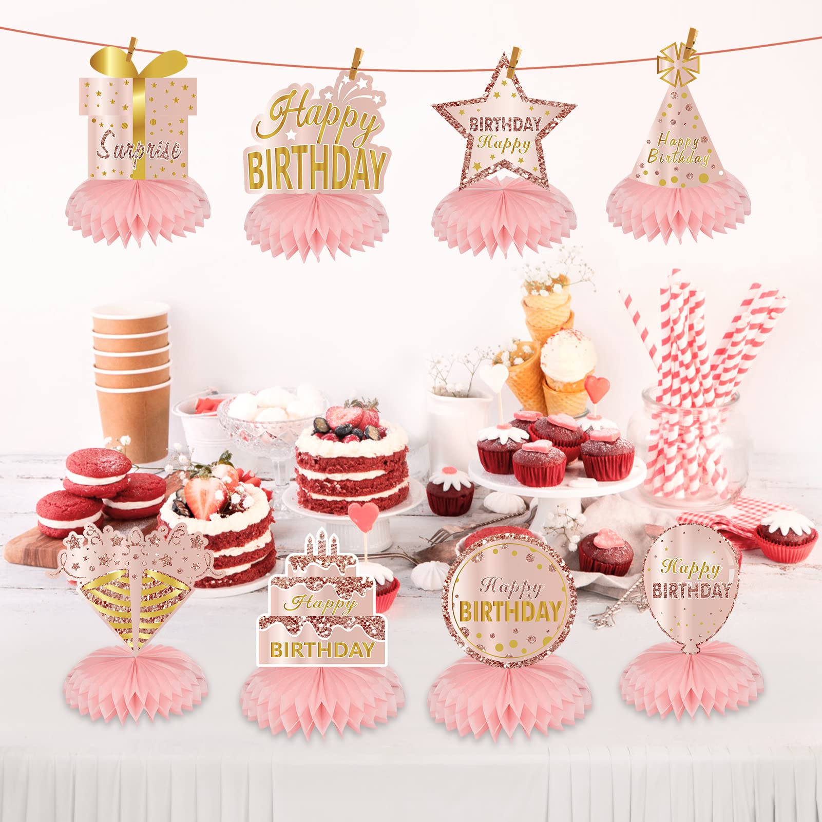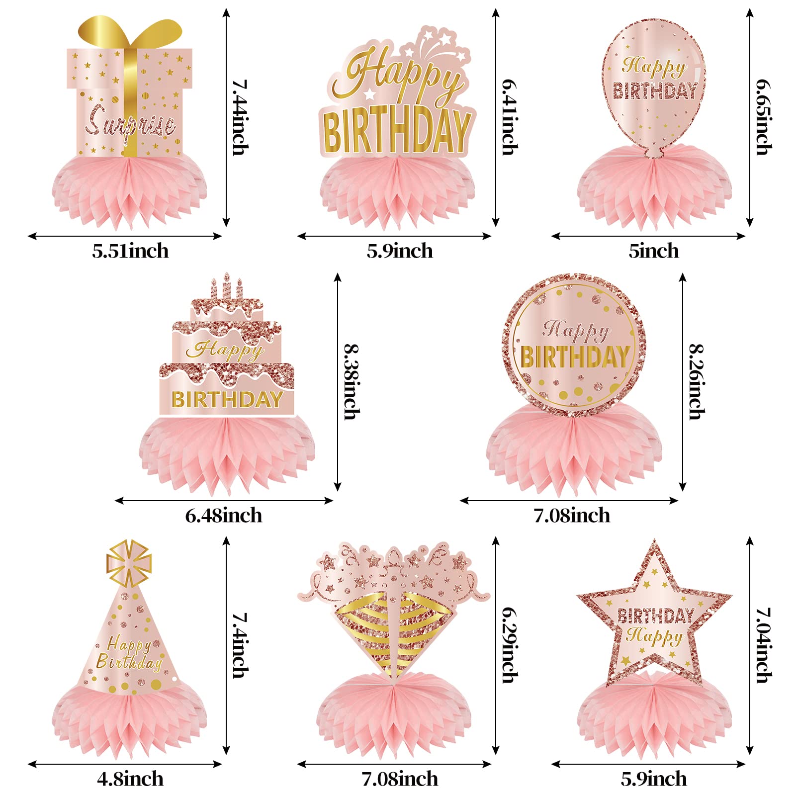 [You will receive] -8 rose gold happy birthday honeycomb centerpiece decorations, including 8 birthday themed cards and 8 pink honeycomb centerpiece balls, perfect for your birthday party decoration.