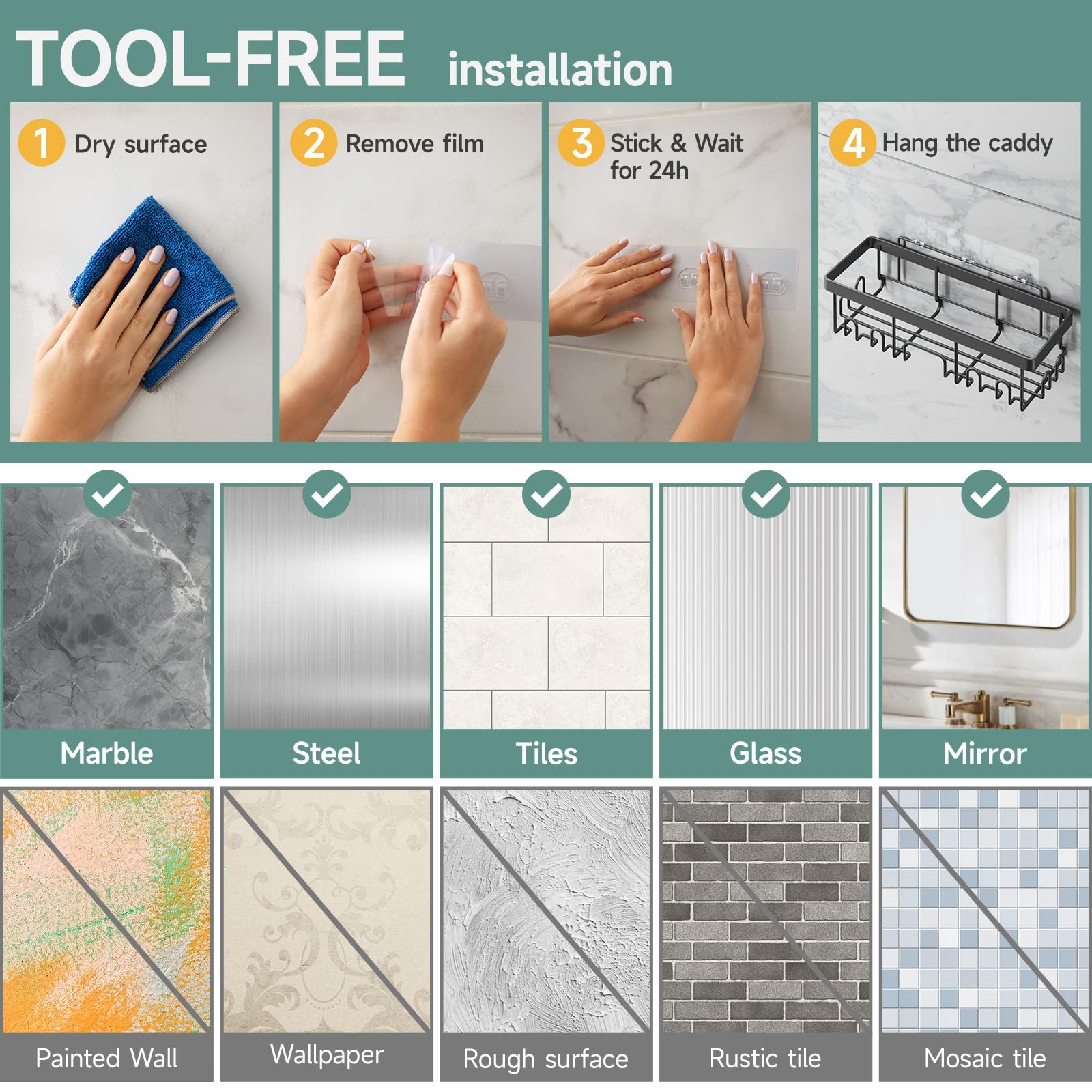 Waterproof & Rust-Resistant: Designed for use in high-moisture areas, this caddy is made from rustproof and waterproof materials. It resists corrosion over time, keeping your shower organization solution looking pristine in damp environments.