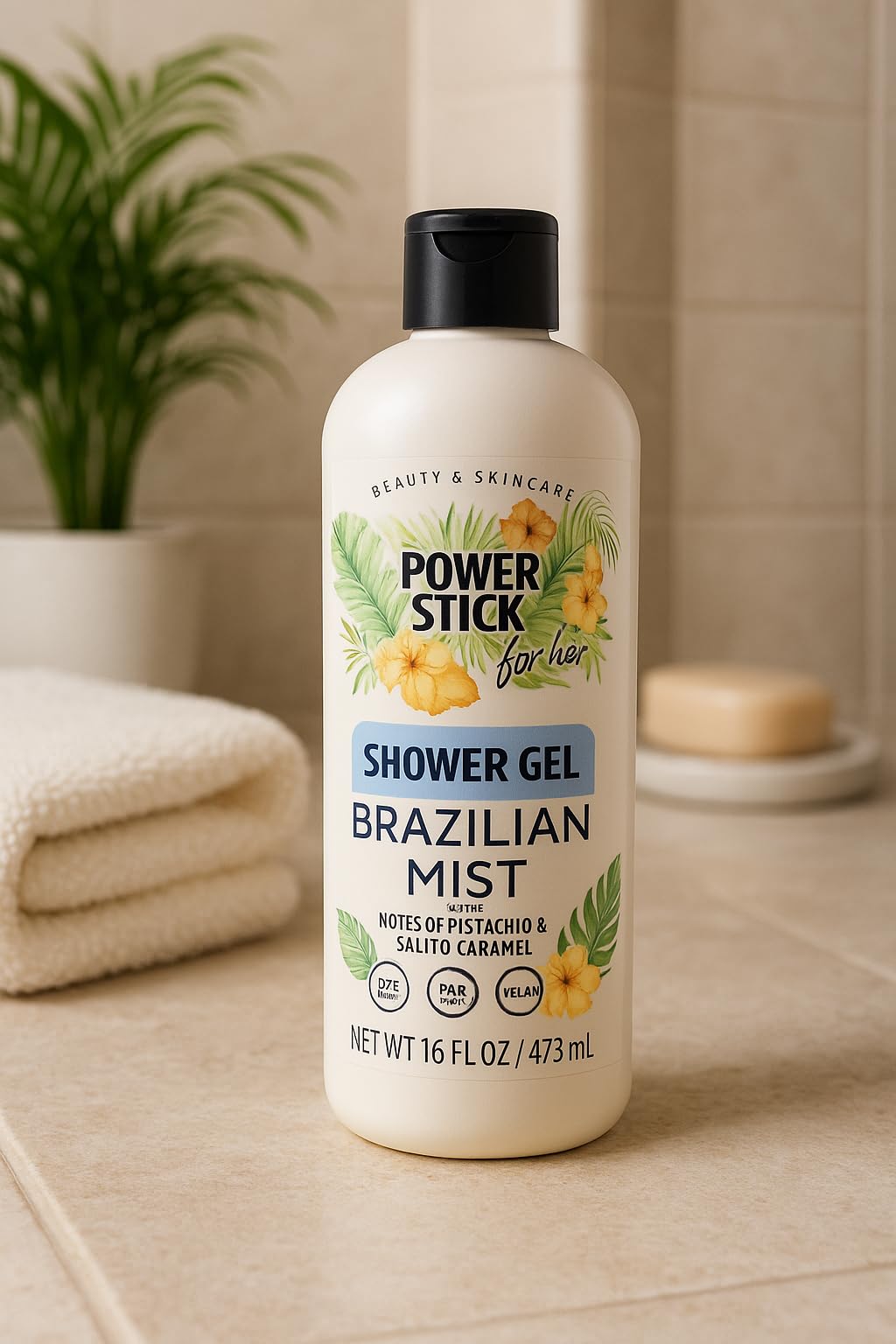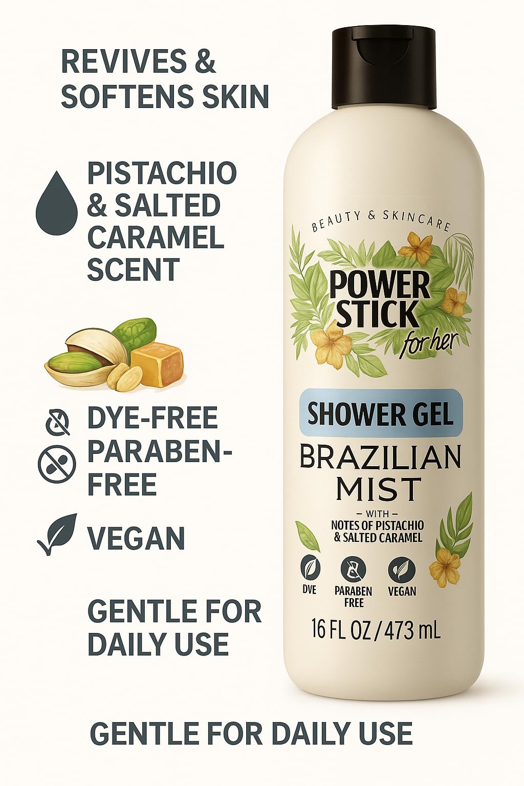 Indulge in a luxurious shower experience with Power Stick Brazilian Mist Shower Gel. Enriched with captivating notes of pistachio and salted caramel. Key Features: Scent : Revel in the delightful fusion of pistachio and salted caramel. Size : Generous 16 fl oz to keep you refreshed for days. Benefits : Nourishes and cleanses your skin, leaving a lingering, delectable fragrance. For All : Suitable for all skin types, making it a perfect addition to your daily routine. Transform your shower into a tropical paradise and let the lush notes of pistachio and salted caramel whisk you away to the sunny shores of Brazil. Elevate your self-care routine with Power Stick Brazilian Mist Shower Gel and embrace the essence of luxury in every drop!