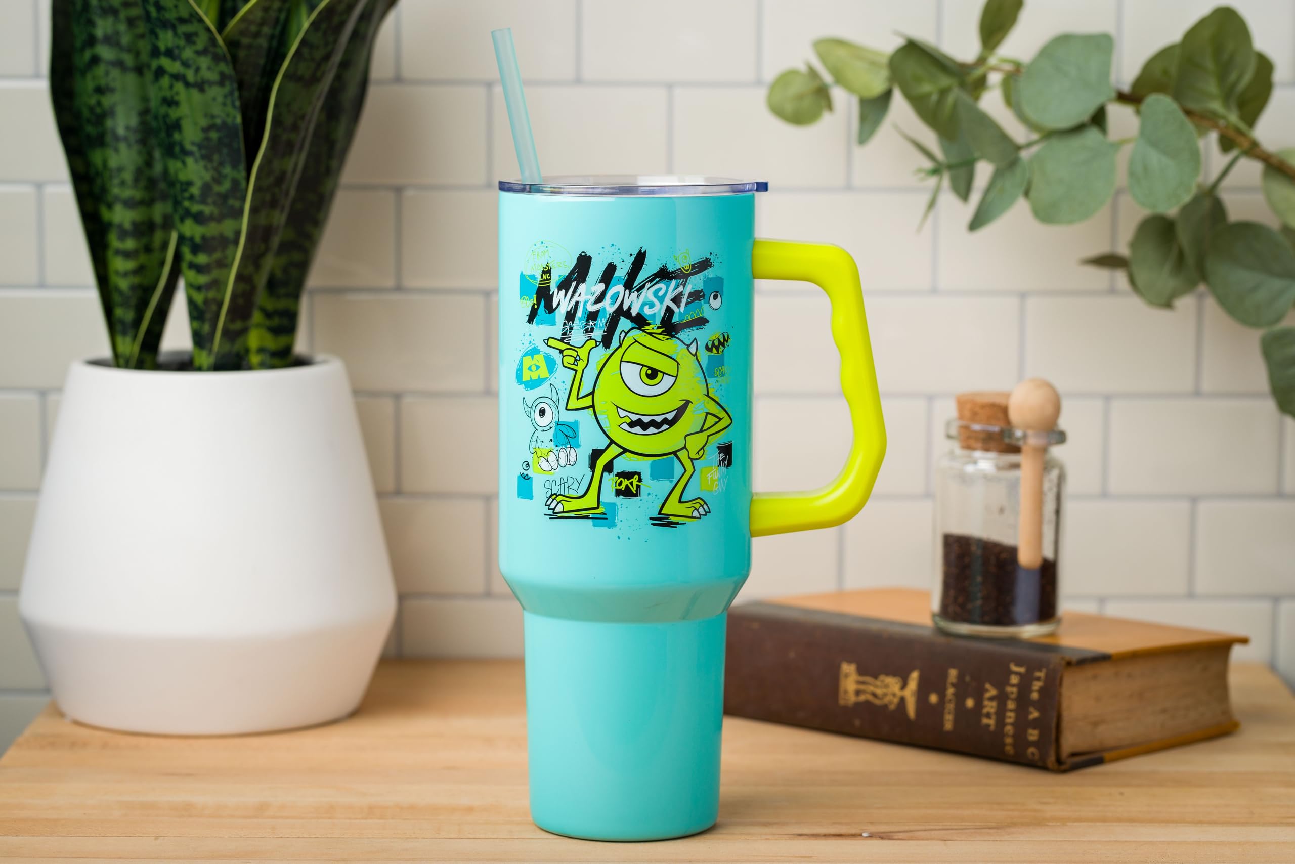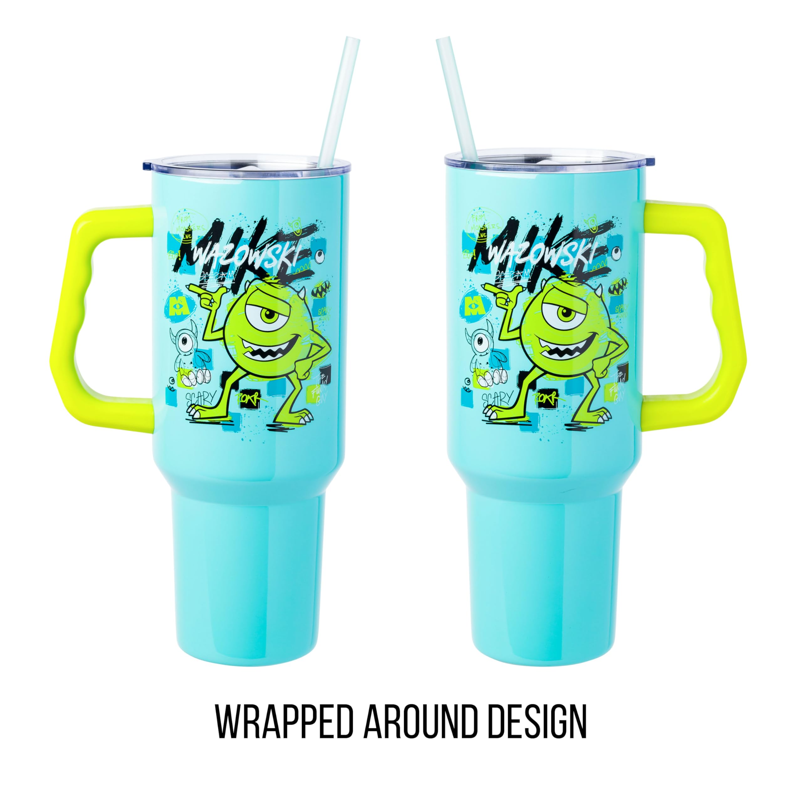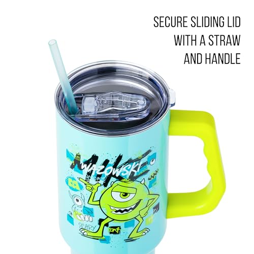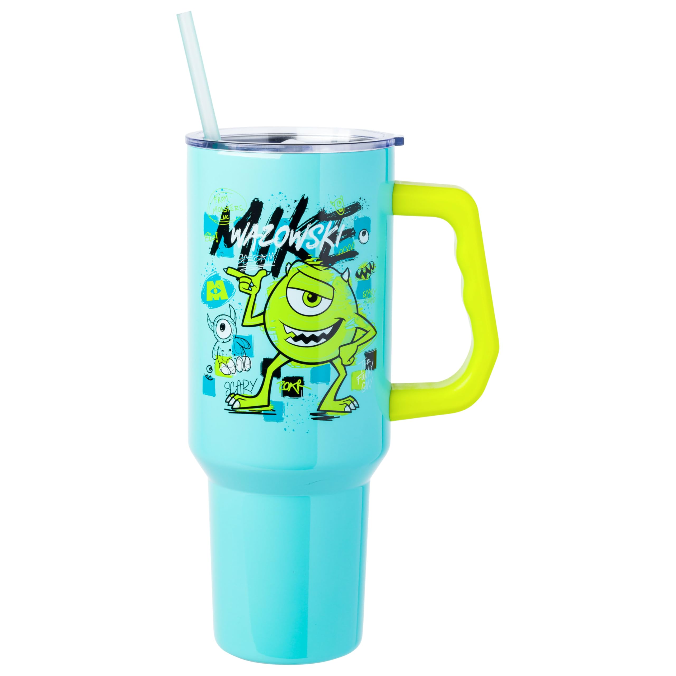 Take your favorite character on the go with this themed tumbler! Stainless steel tumbler features Mike Wazowski surrounded by iconic Monsters Inc. images. Written above the character is his name “Mike Wazowski.” Tumbler is blue with a green handle. NOT microwave or dishwasher-safe; HAND WASH ONLY. This stainless steel tumbler holds up to 40 ounces of your favorite beverage. Stainless steel tumbler comes with a secure screw-on lid, reusable straw, and handle making this the perfect cup to keep you hydrated while on the go. Tumbler is designed to fit in a standard cup holder. Disney, Pixar, and Monsters Inc. fans alike will enjoy this tumbler, making it the perfect gift. Great for birthdays, holidays, or other gift exchanges. Take a dive into the fictional world with Silver Buffalo! Silver Buffalo provides fans with official merchandise from their favorite characters. Working alongside licensors and brands, we create unique and imaginative products which are designed with great care and detail. Silver Buffalo aims to connect fans to their favorite cartoon characters, superheroes, movies, tv-series, and more. Celebrate your fandom!