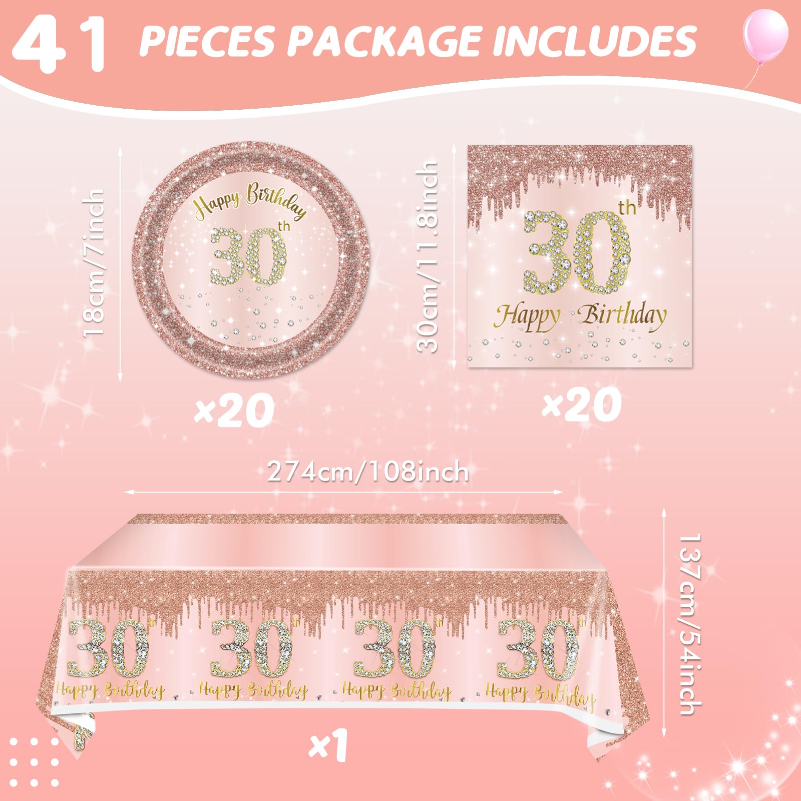 【Sufficient Package】You will receive 20 pcs of 30th birthday plates, 20 pcs of 30th birthday napkins, 1pcs tablecloth. Enough quantity to meet your family and party needs