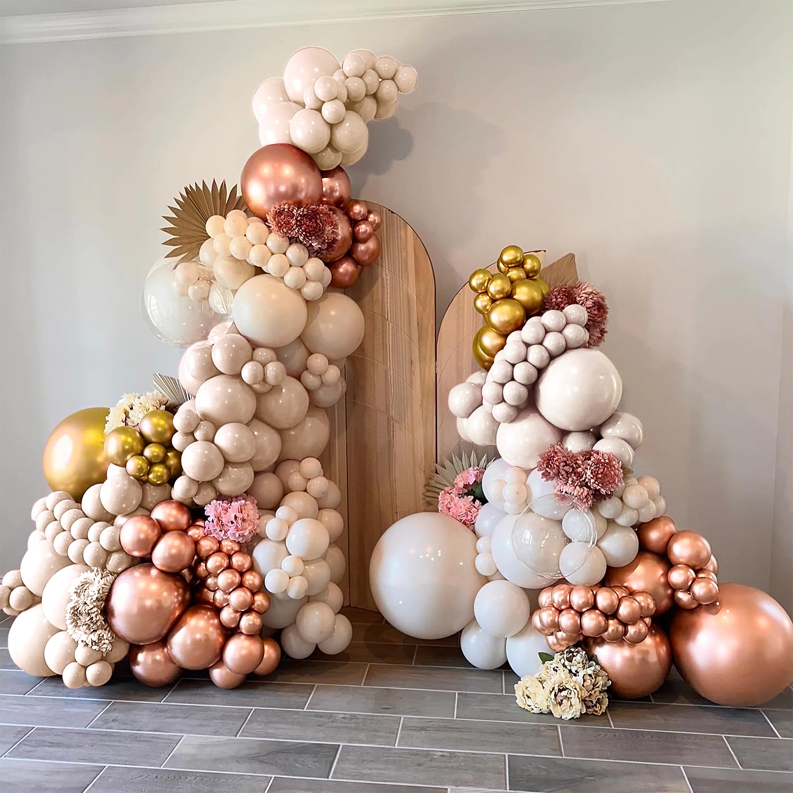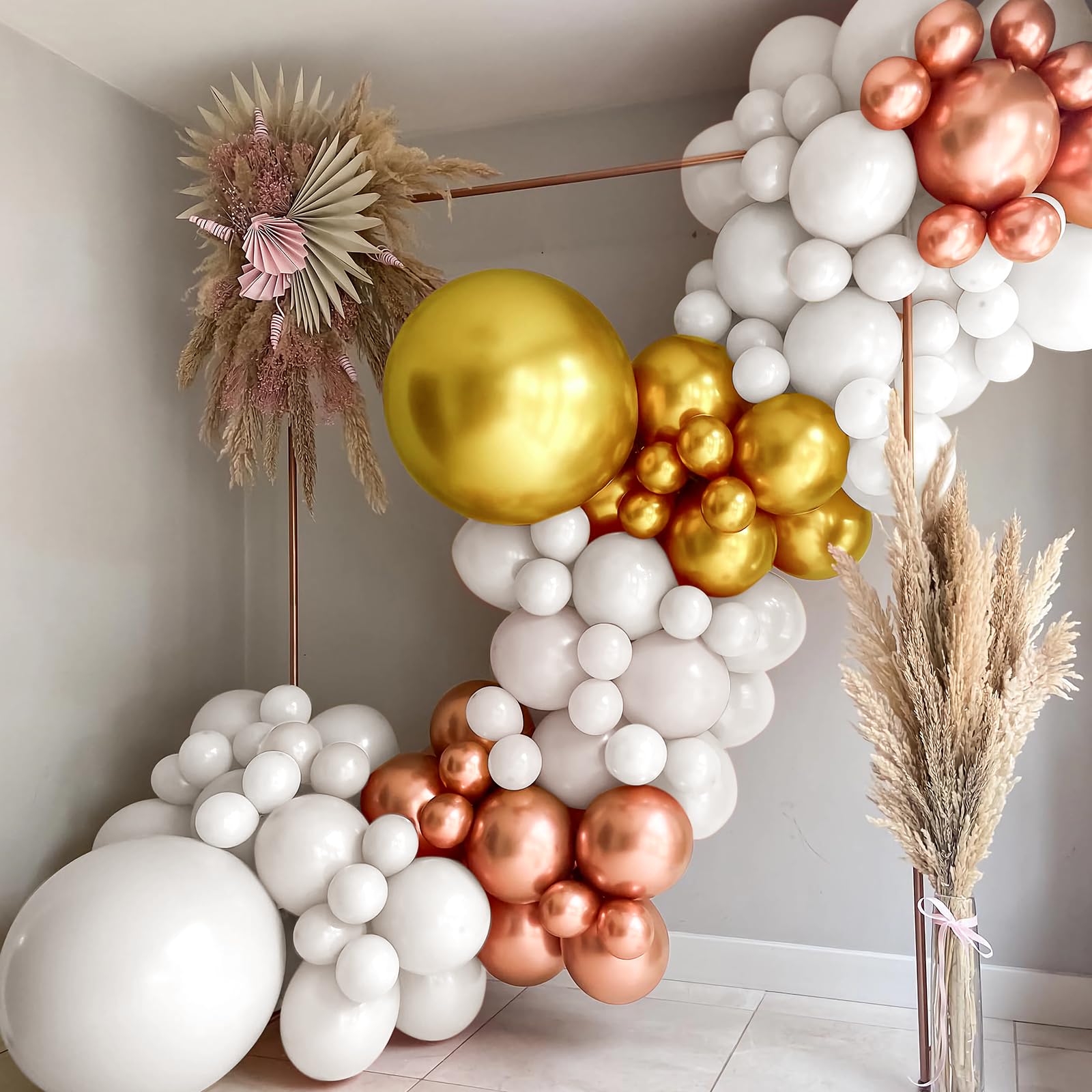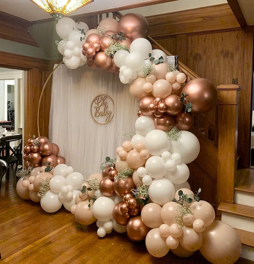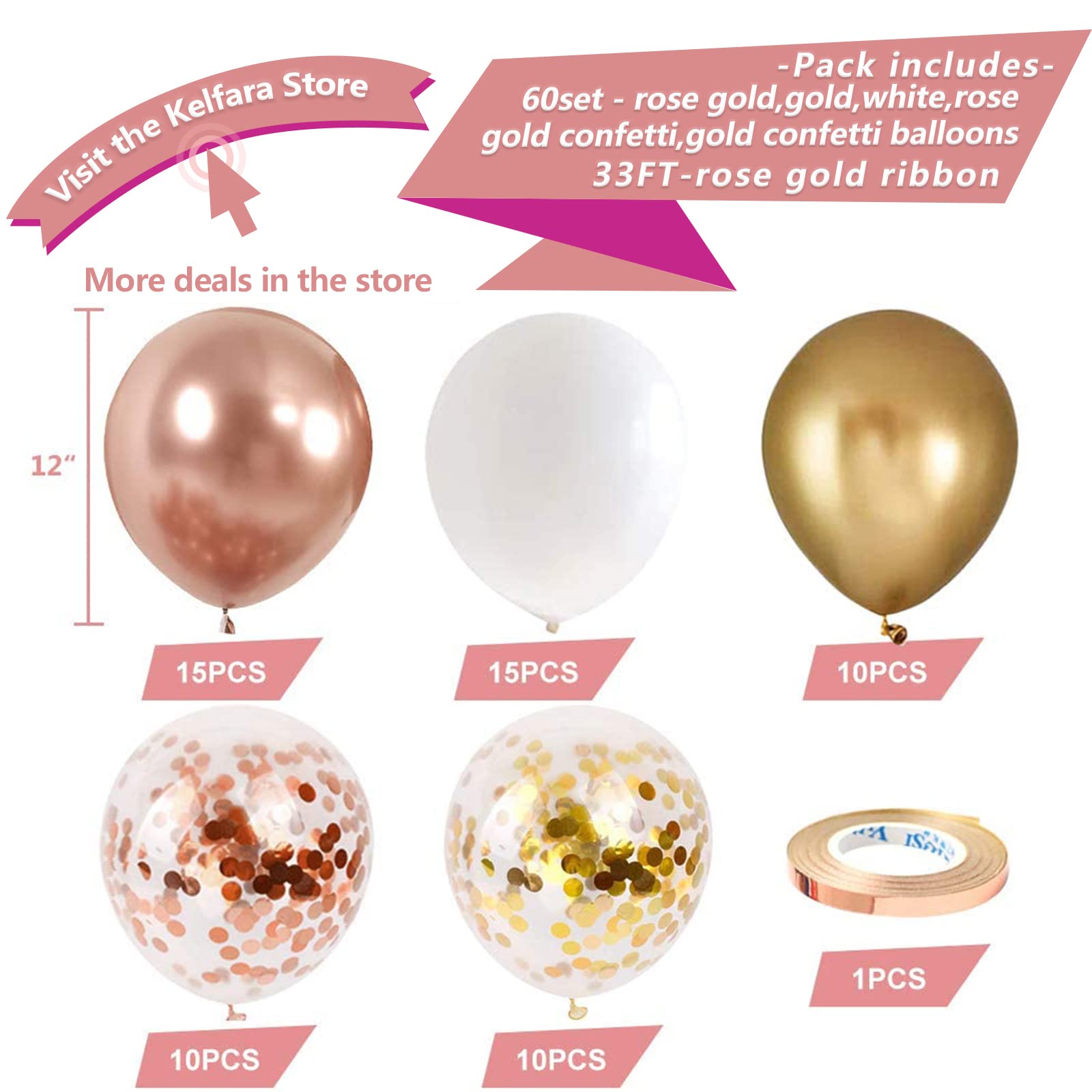 What You Will Get - Each sets contains 60pcs, 15pcs metallic rose gold balloons, 15pcs pearl white balloons, 10pcs gold metallic balloon, 10pcs gold confetti balloons,10pcs rose gold confetti balloons of 12 inches, and 1pcs rose gold ribbon (33 feet total). The right amount quantity and most suitable color for each party decoration.
