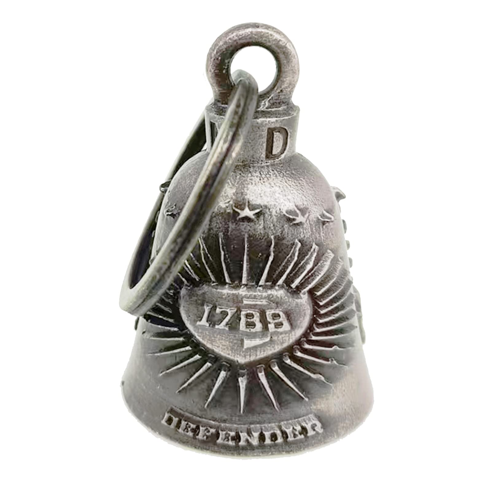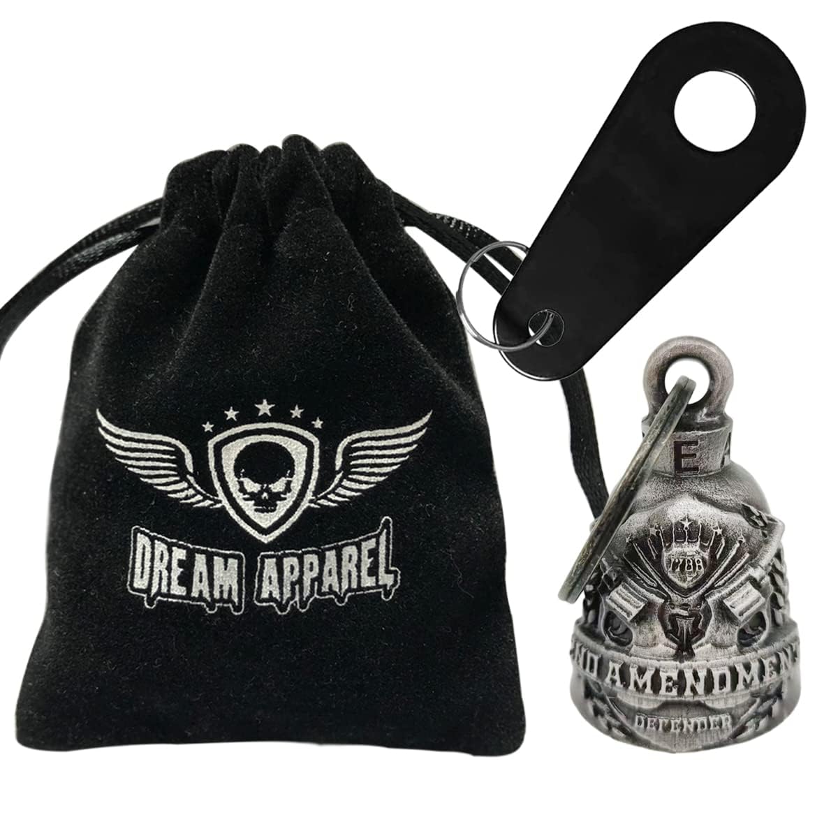 [Dimensions and Package Content] - Measurement of bell: 1.77" Height x 1.18" Diameter. Weight: 0.18 LBS. Each bell comes with a 1.18" split key ring, a drawstring black velvet bag, a black bell hanger and a motorcycle bell legend card. Motorcycle bell is easy to install with bell hanger or zip tie.