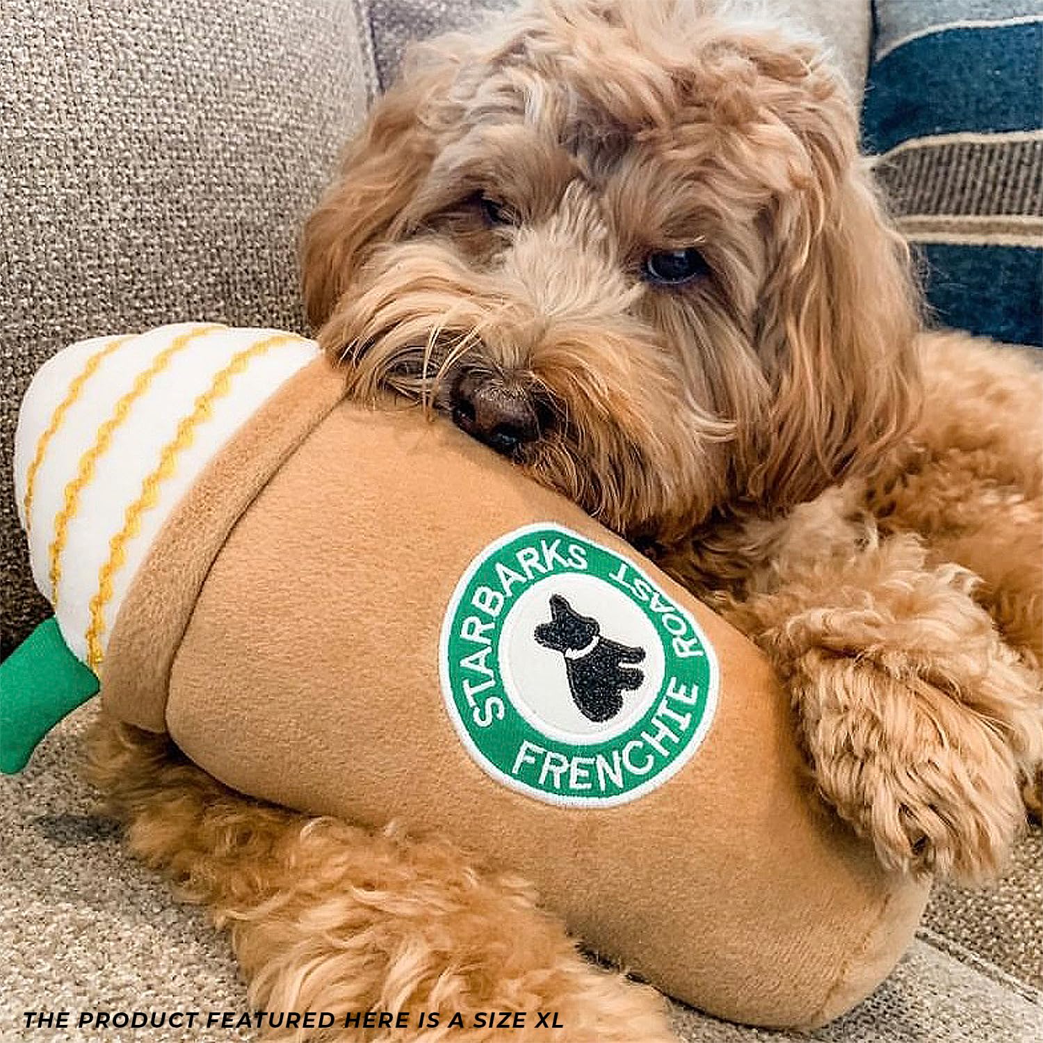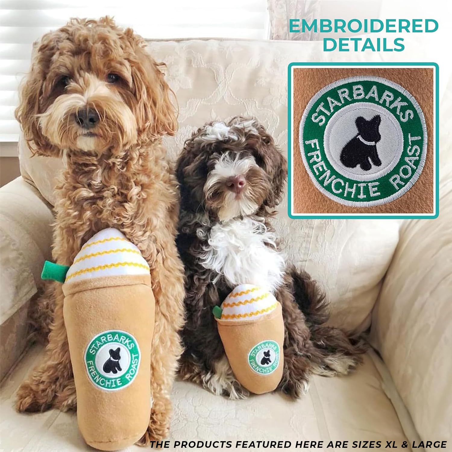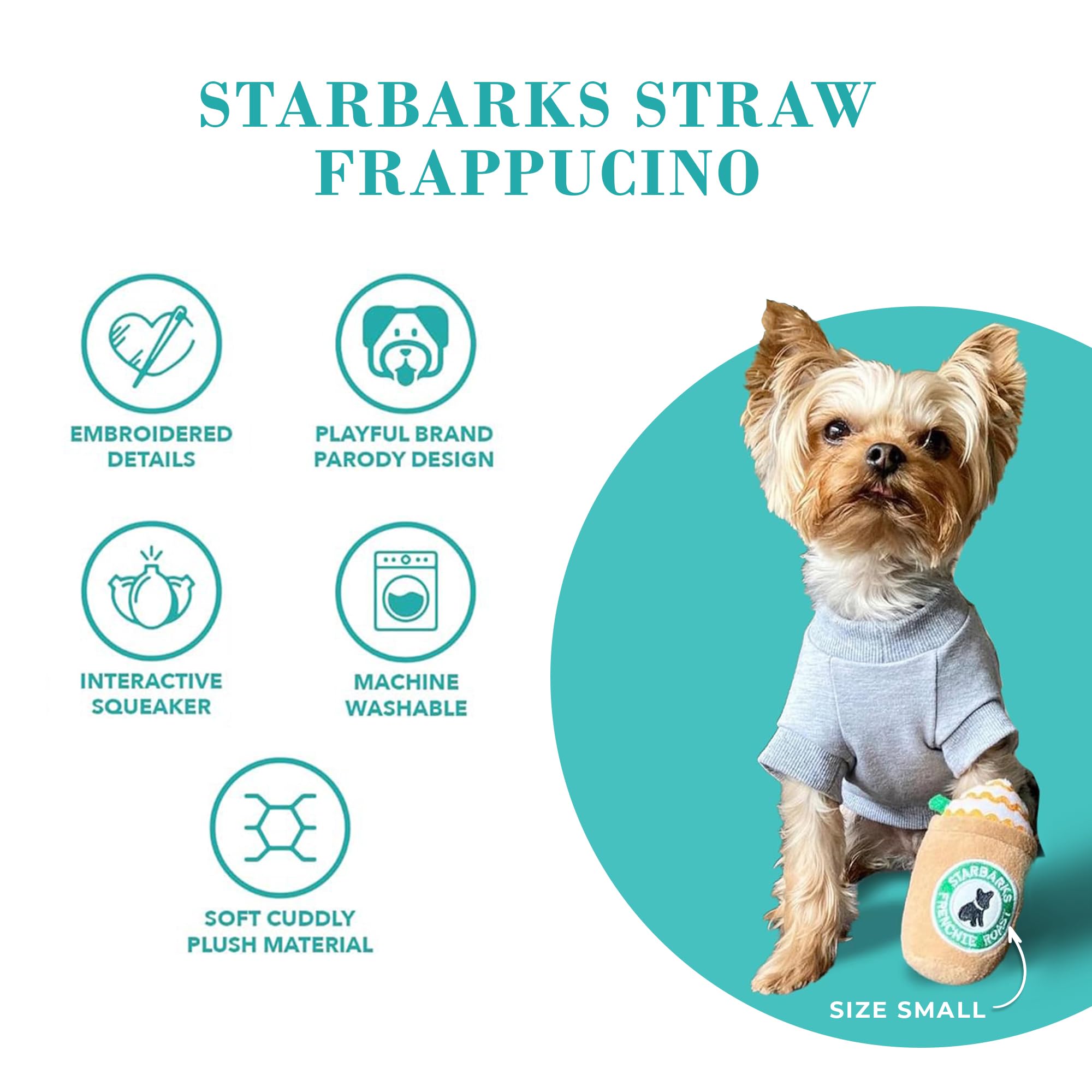 Funny Parody Plush Dog Toy: Perk up your pooch with a double shot of canine caffeine with our Starbarks Frappawcino dog toy. This dog toy features a brown plush exterior with a built-in squeaker hidden inside. Embroidered accents read “Starbarks Frenchie Roast”. It’s a fun, cute interactive dog toy that will start any morning off right! The XL size features a durable fuse mesh lining that is suitable for aggressive chewers. Size XL 11"x7"x3".