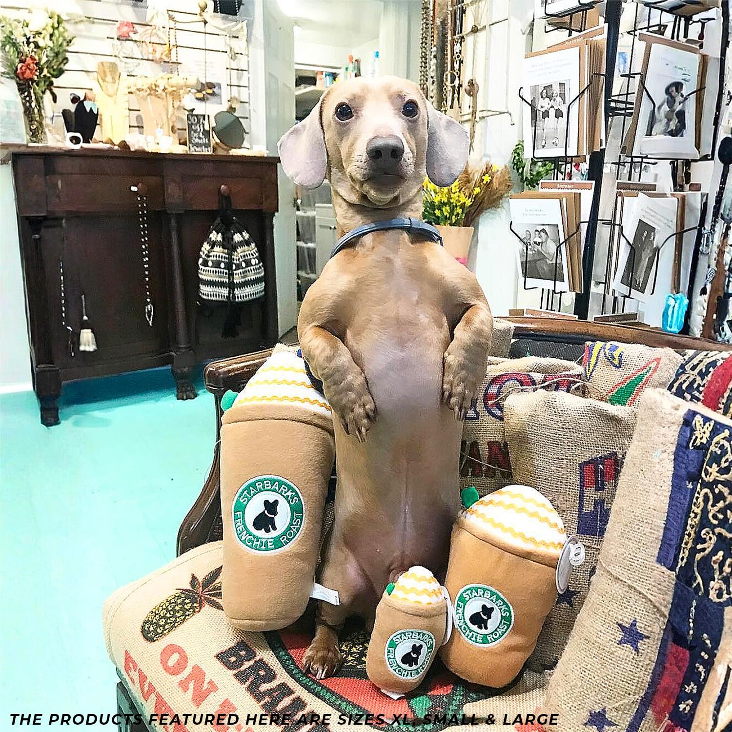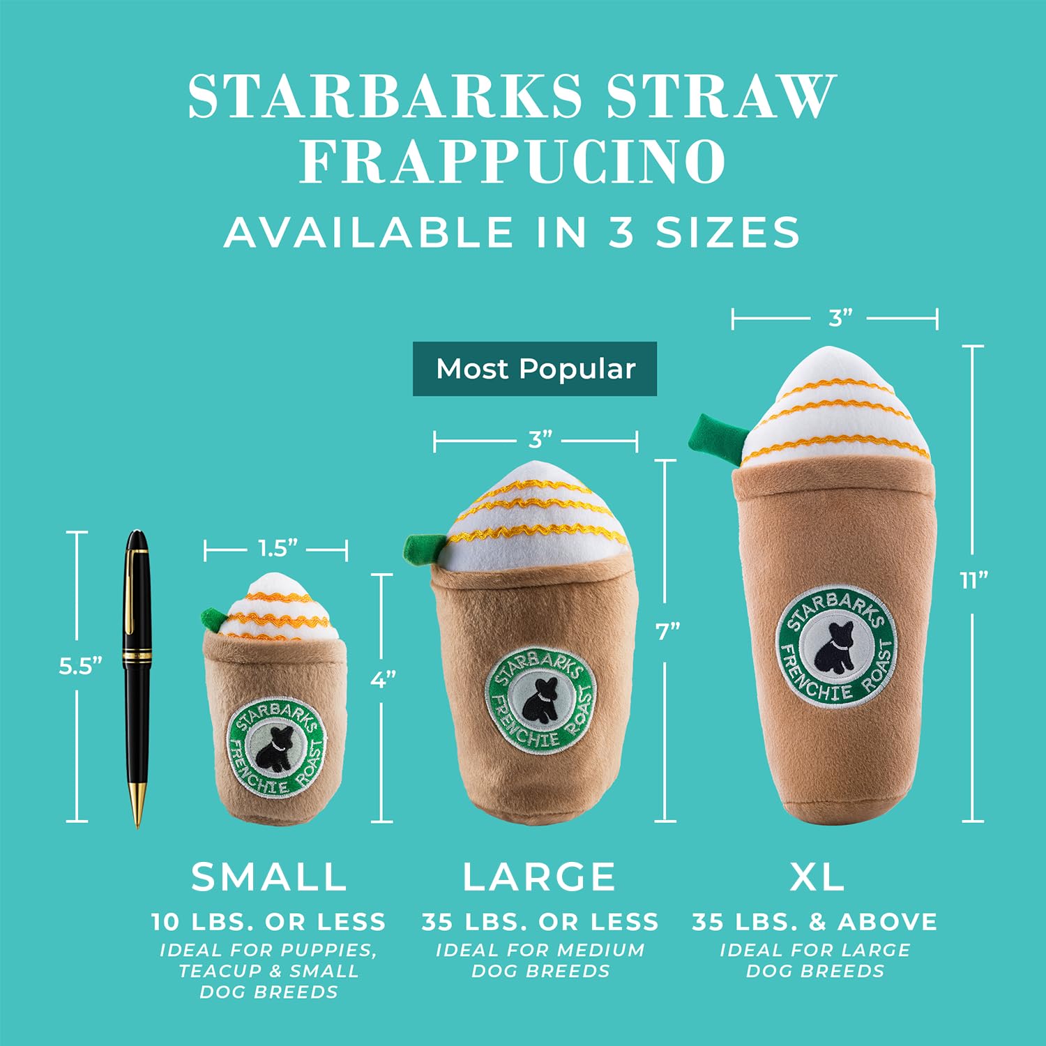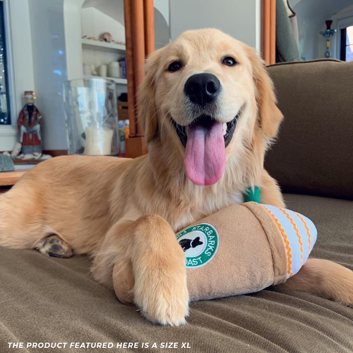 Funny Parody Plush Dog Toy: Perk up your pooch with a double shot of canine caffeine with our Starbarks Frappawcino dog toy. This dog toy features a brown plush exterior with a built-in squeaker hidden inside. Embroidered accents read “Starbarks Frenchie Roast”. It’s a fun, cute interactive dog toy that will start any morning off right! The XL size features a durable fuse mesh lining that is suitable for aggressive chewers. Size XL 11"x7"x3".