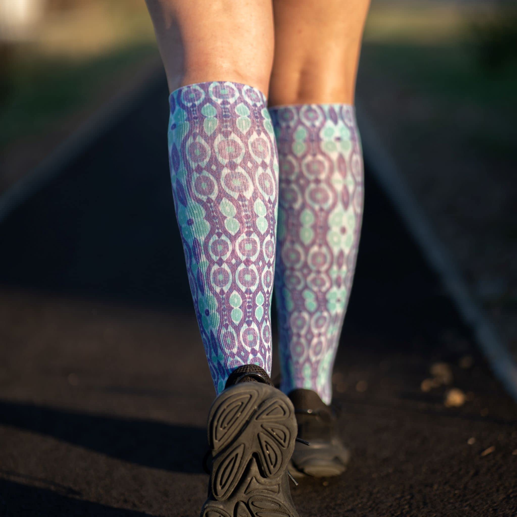 COMPRESSION SOCKS 20-30 mmHg. A Durable Compression Socks have wide variety of fun colors and designs specially for nurses, size rang cover both women and men. Double stitched with functional Fabric and knitted with seamless compression technology. Fits comfortable, easy to get on and delivers 376 degree support to feet and legs. Knee high long sleeves compression socks make sure the graduated support effect entire calf.