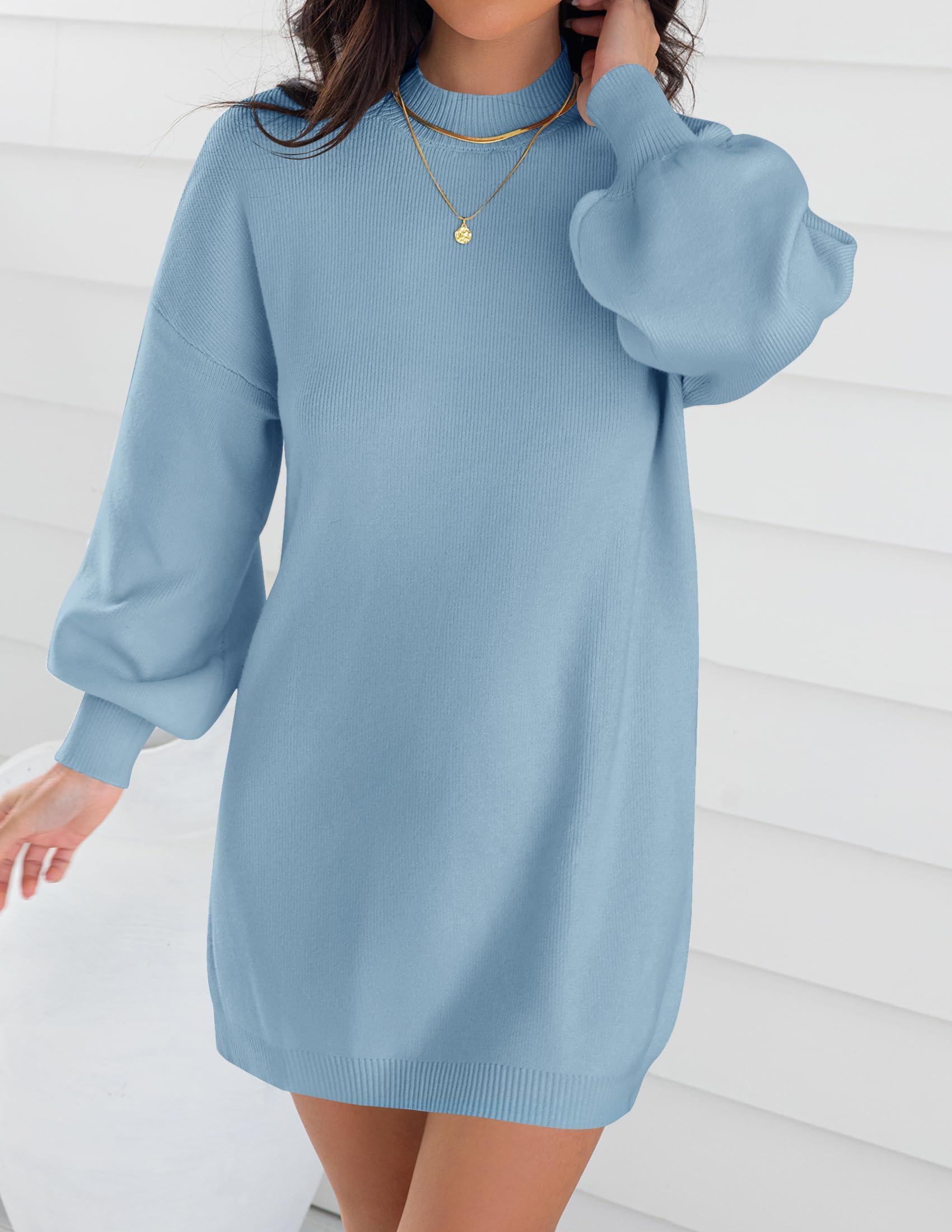 Sweater dresses for women 2025, mini dresses for women, fall sweater dress, lantern long sleeve dress, ribbed knit dress, mock neck, loose fit, classic solid color, above knee length, slouchy and baggy style, maternity dress, winter dress, cocktail party dress