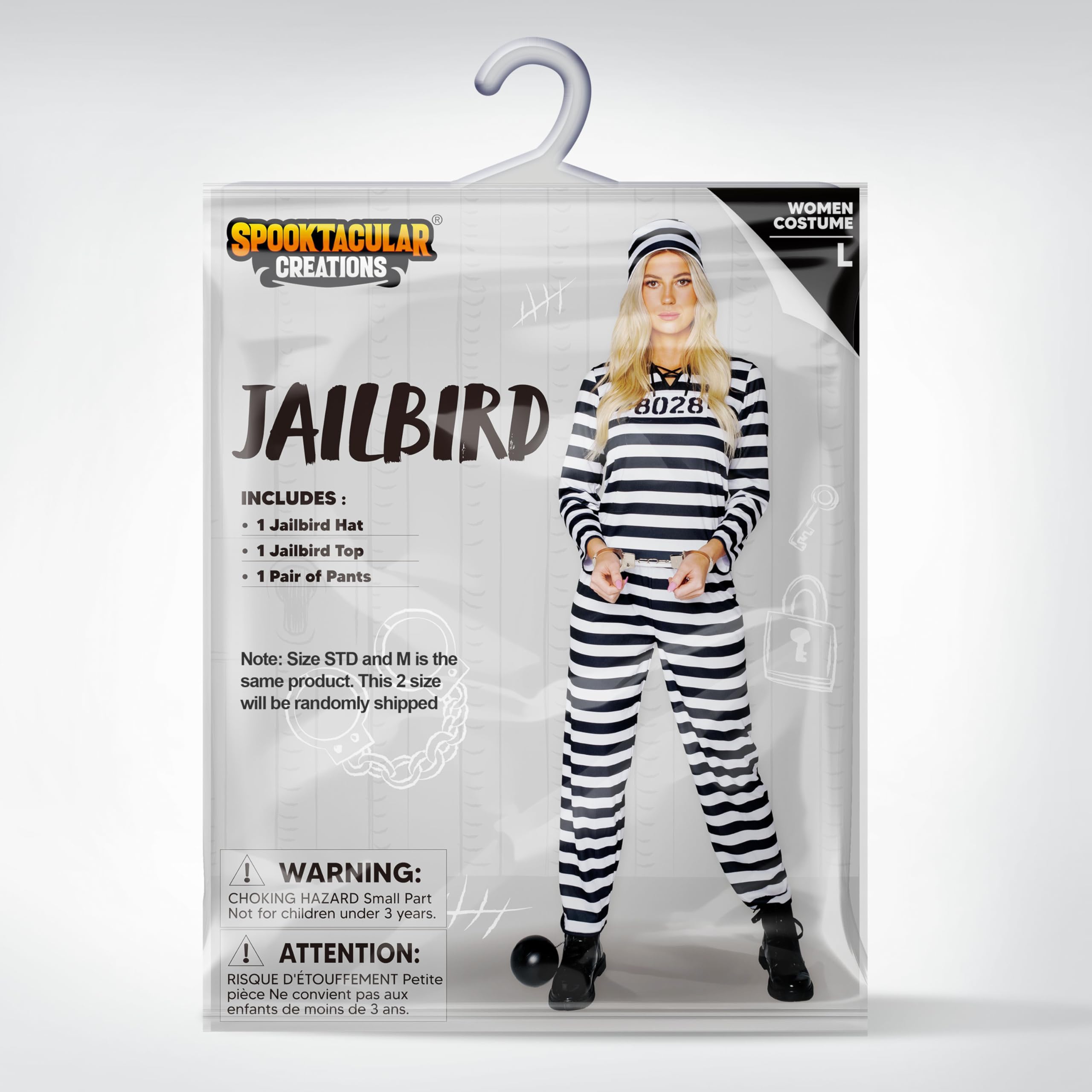 SUPER VALUE PACK. Our women's prisoner costume set includes one prisoner hat, a pair of prisoner pants, and one long sleeve shirt that has stripe design and an inmate number print. Answering the door with our jailbird costume for women for Halloween trick or treaters will surely be an interesting experience.