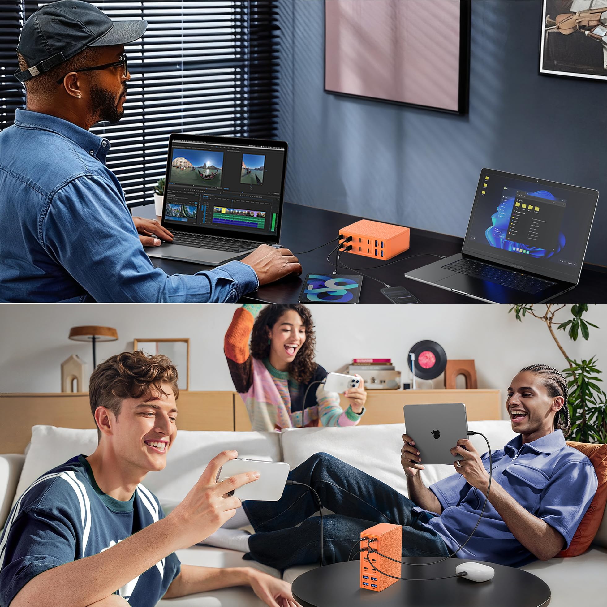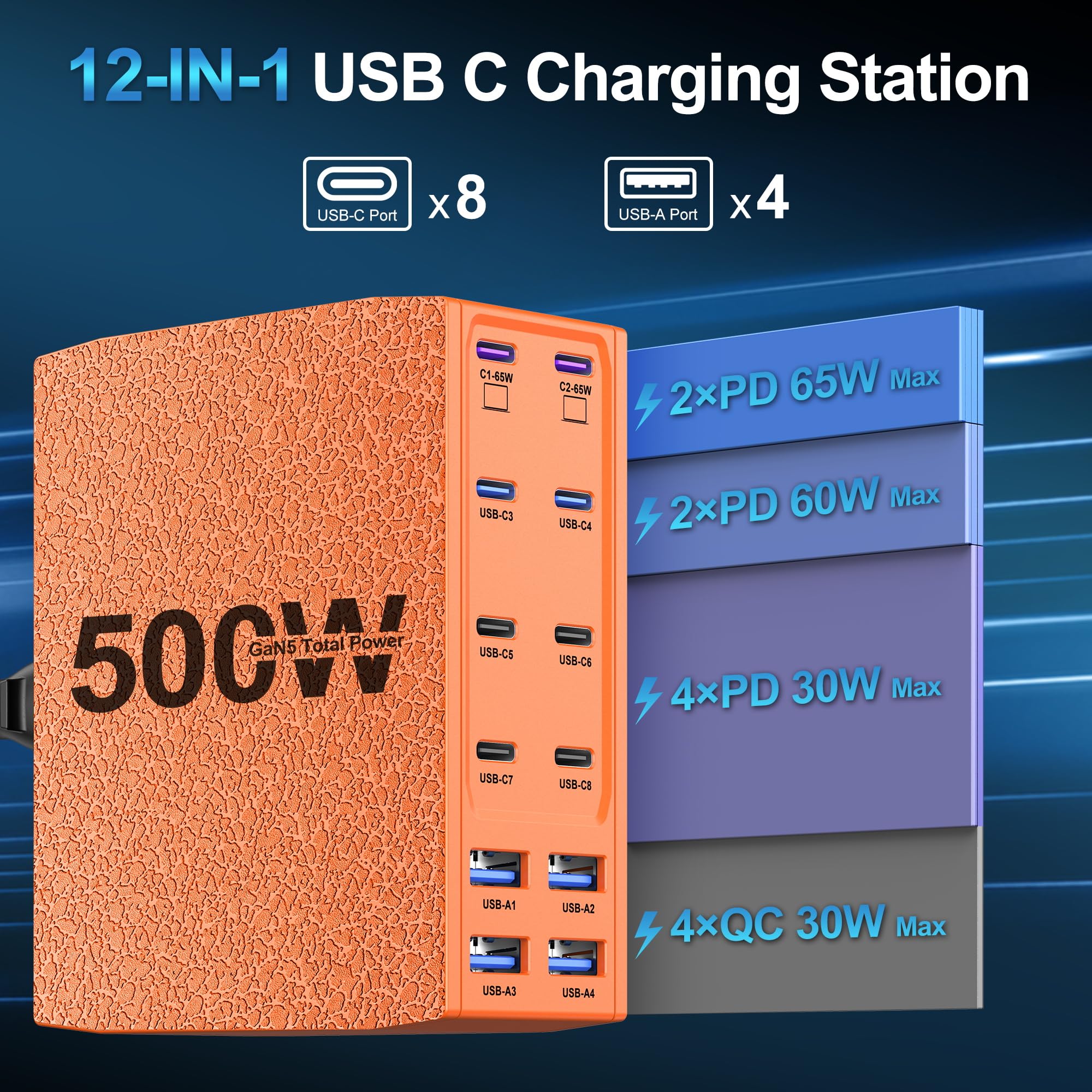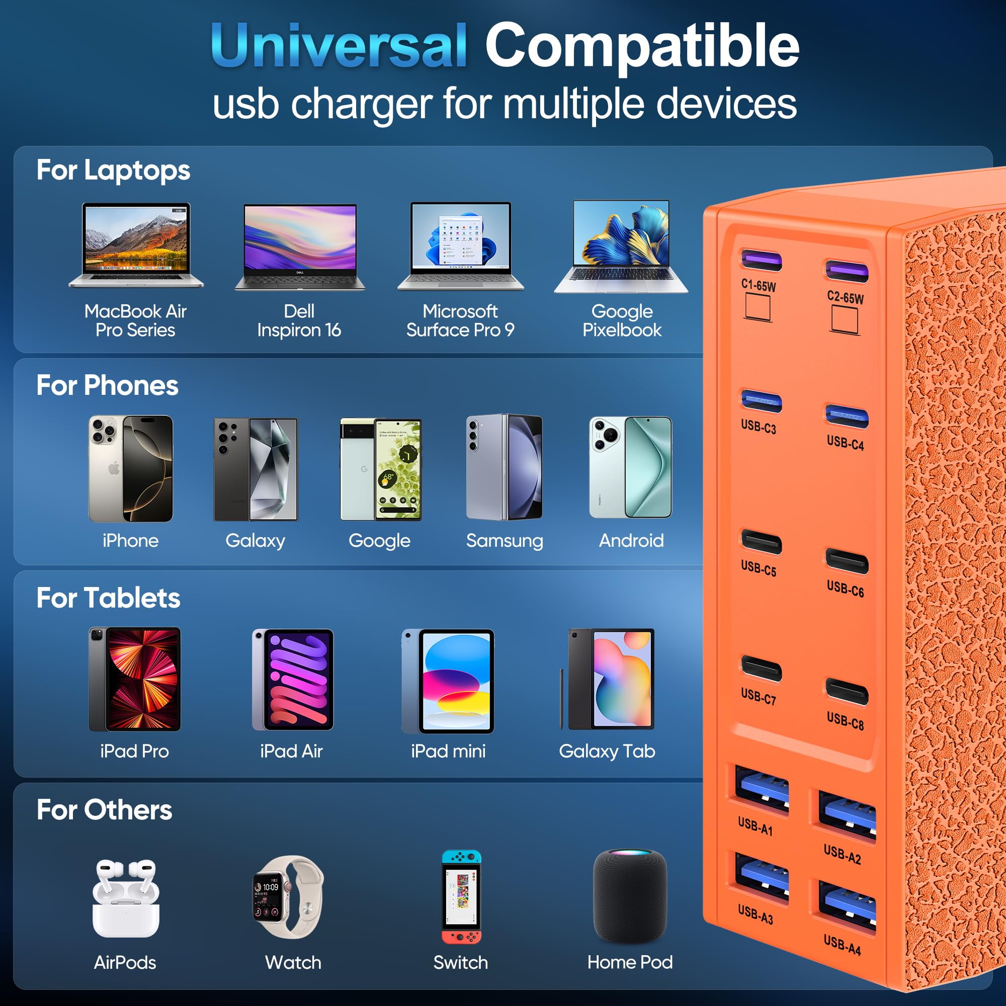 【Universal Compatibility】:The usb charging block is made of a unique leather texture material for added durability. Multi usb charging station supports PD3.0/PPS, QC, PE2.0, AFC, FCP, SCP fast charging protocols. 8 USB-C and 4 USB-A ports are compatible with MacBook Pro/Air, Dell XPS, iPad Pro/Air/Mini, iPhone 17 /17 Pro Max 16/15/14 /13 /12 Pro Max /Plus/X/Mini, AirPods Pro,iWatch, Galaxy S25 /S24/S23/ S22 /S21 Ultra, Switch, Steam Deck, Surface Pro, Google Pixel and more.