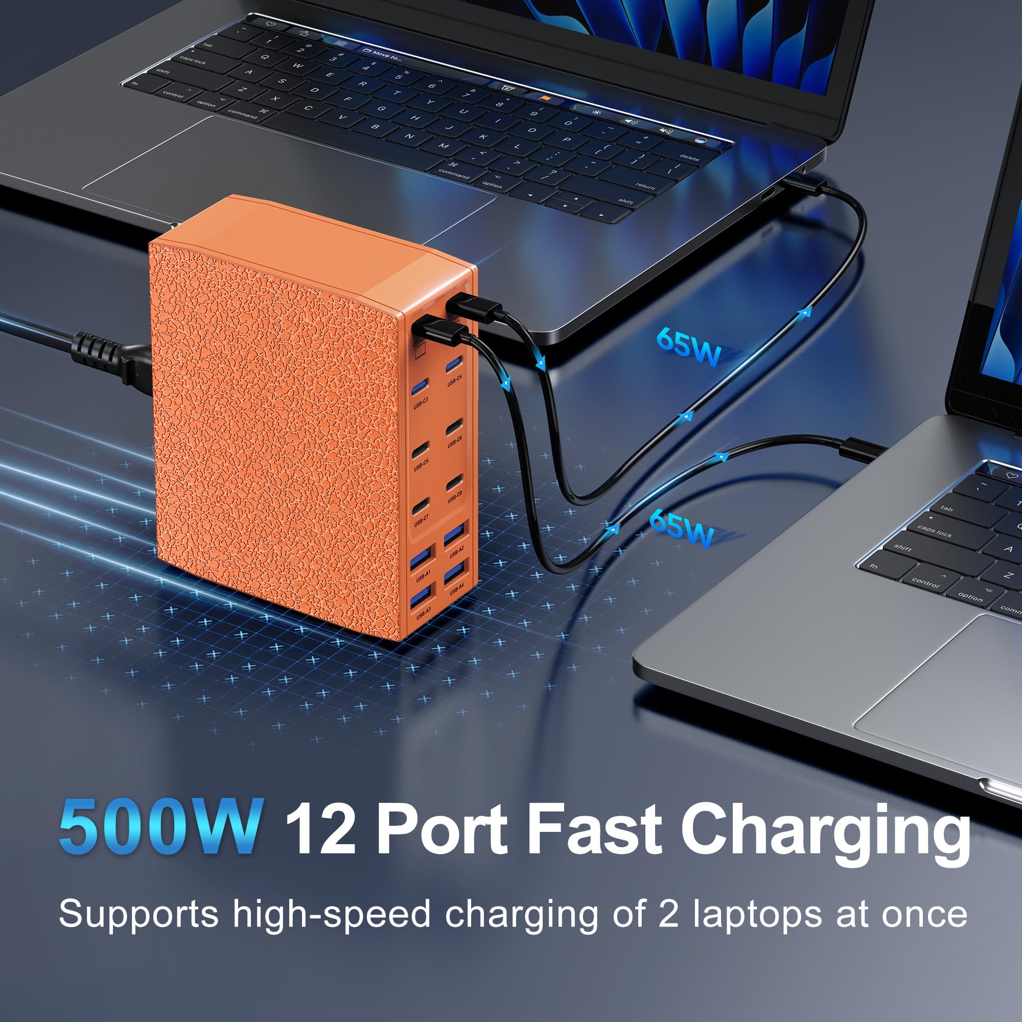 【Fast & Safe Laptop USB C Charger】:The 500W USB C wall laptop charger is equipped with dual 65W fast charging ports. USB-C1/C2 ports support PD/PPS fast charging, which can quickly charge your Macbook series and other laptops. It also comes with 2 powerful 60W USB-C ports, 4 efficient 30W USB-C ports, and 4 versatile 30W USB-A ports. Perfect for charging your smartphones, tablets, headphones, smartwatches, game consoles and more.