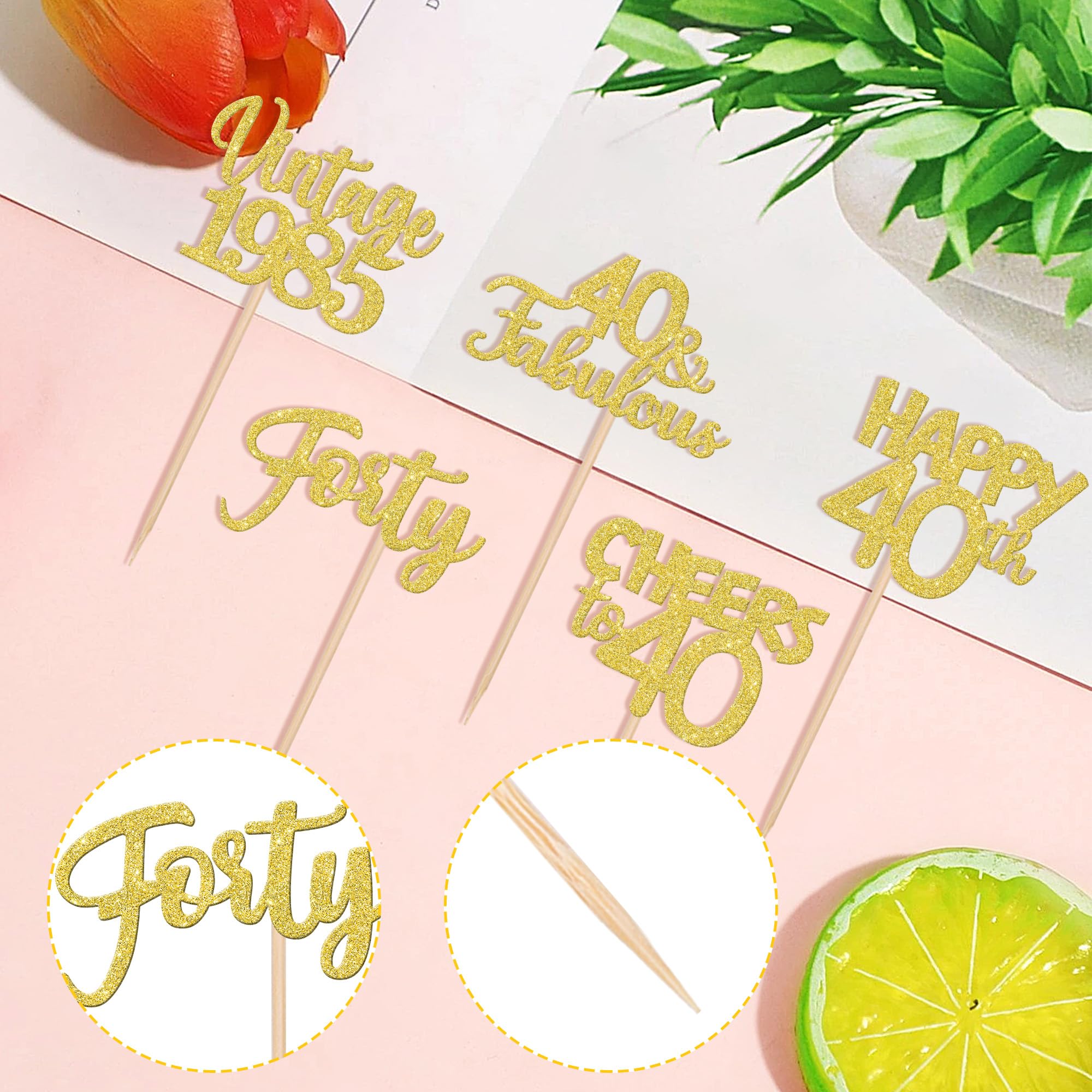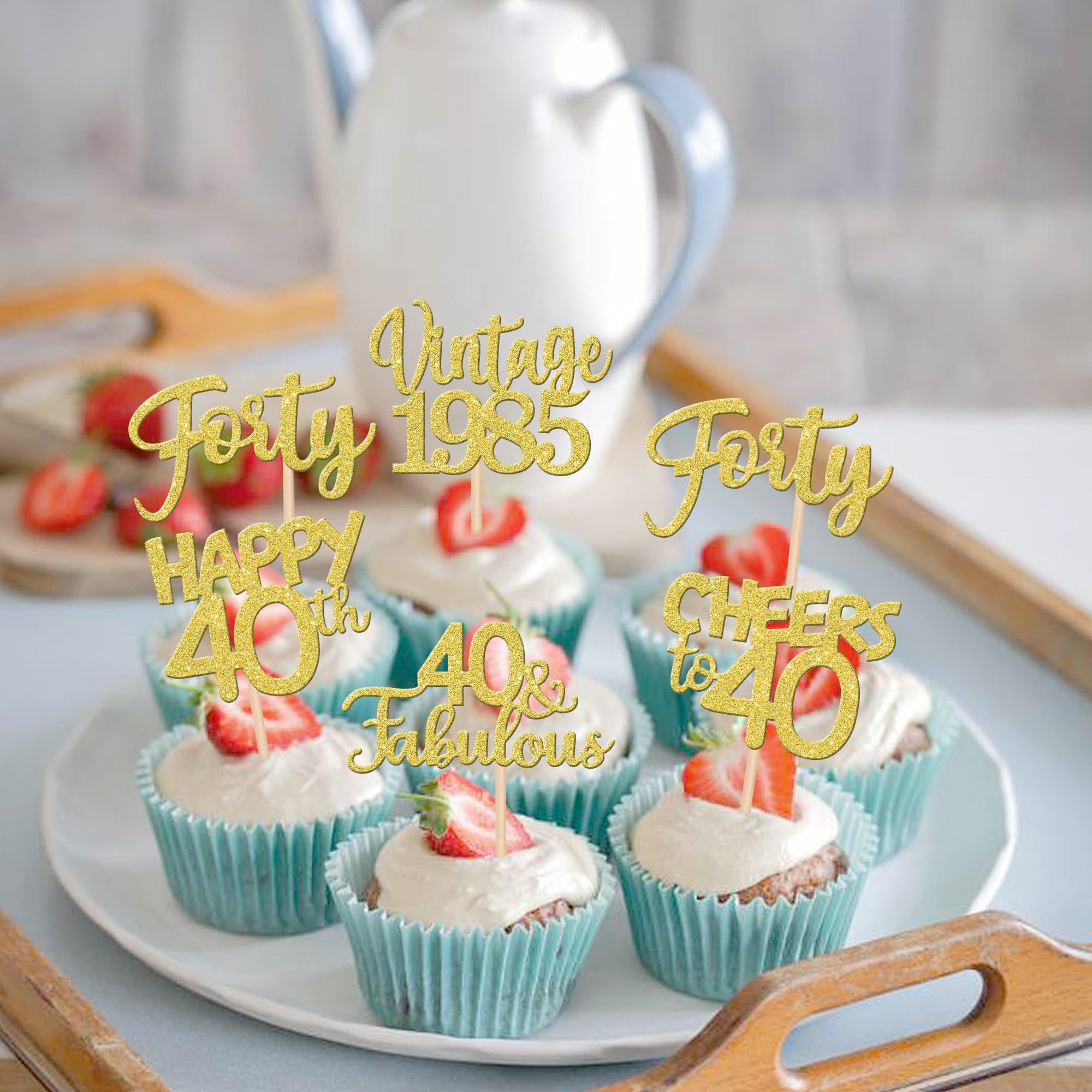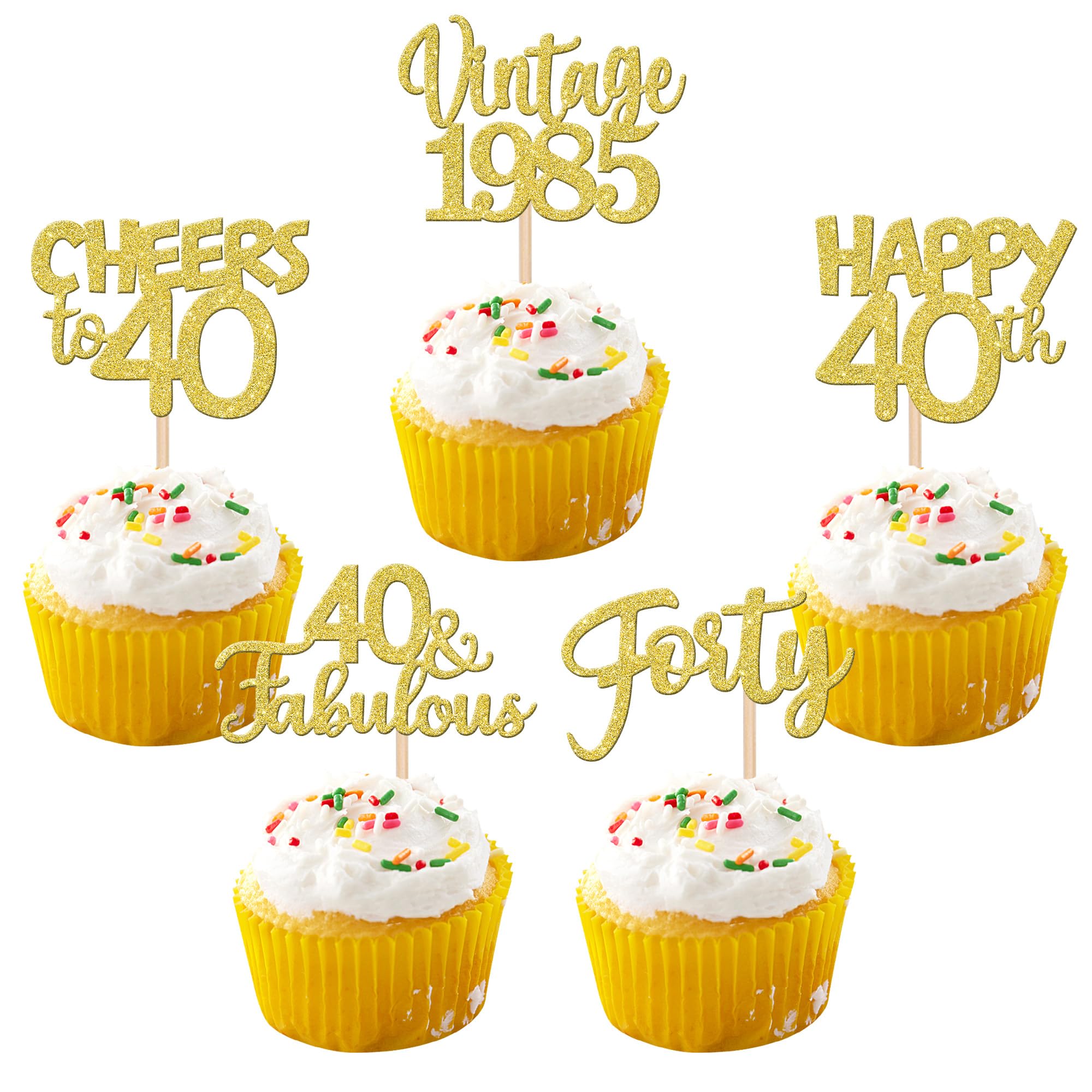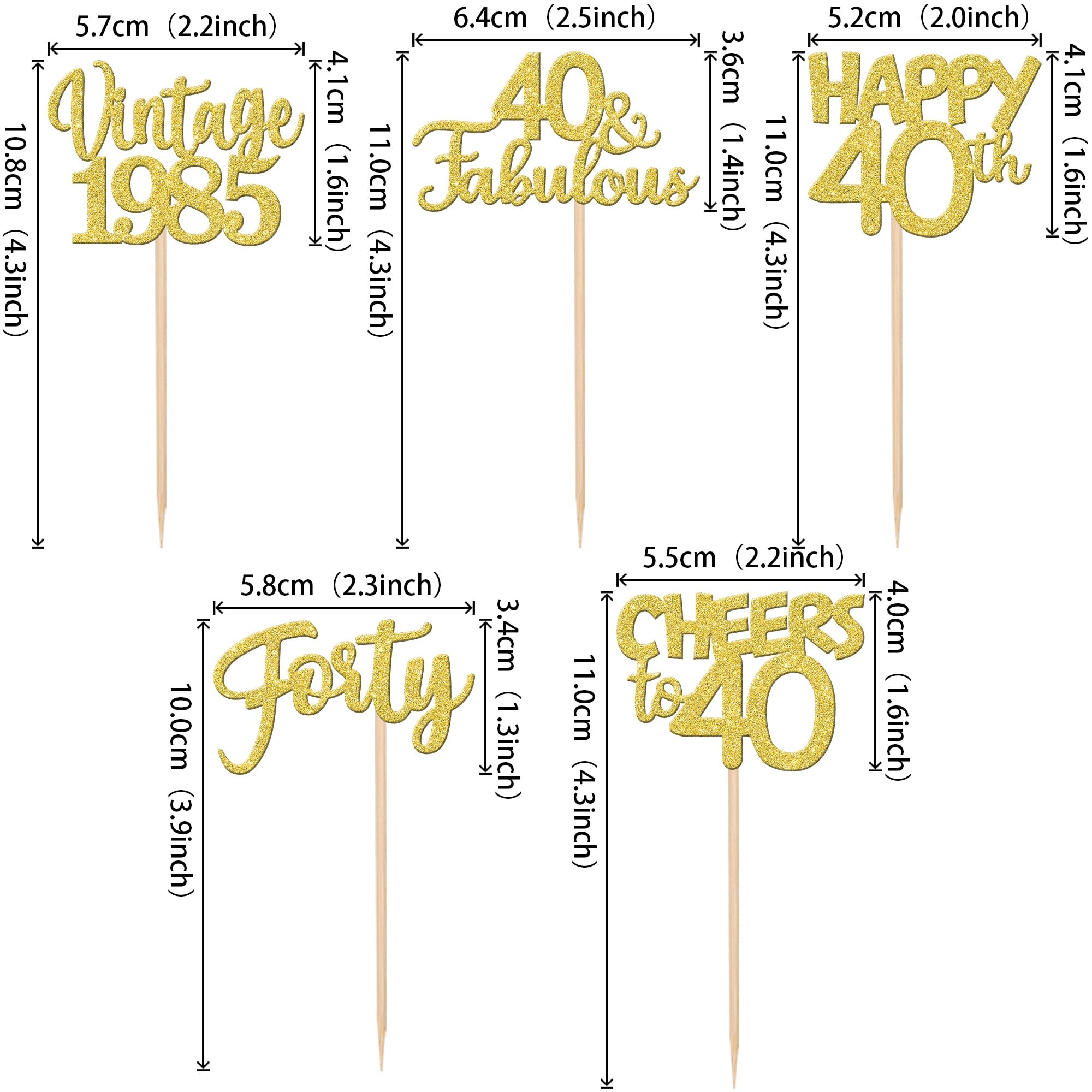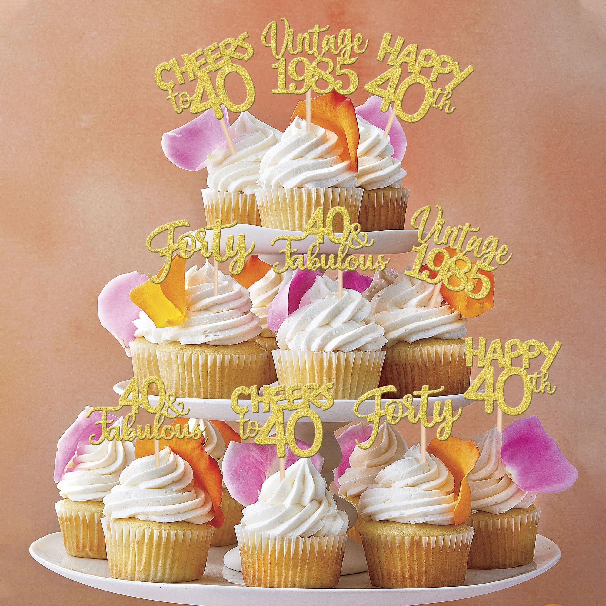 Vintage 1985 Happy 40th Birthday Party Cupcake Toppers Decoration Supplies Perfect for vintage 1985 theme party, 40th birthday theme party, 40th wedding anniversary theme party,cheers to 40 years theme party cupcake decorations supplies. Pack of 30 pcs,6 pcs of each design The size is 2.2*4.3/ 2.5*4.3/ 2*4.3/ 2.3*3.9/ 2.2*4.3 inch ( with stick ) Made of high quality paper card stock,thick and thick and sturdy. These cupcake toppers are single glitter, the back is white, and they are intended for decoration only, please do not put them in oven or microwave. If the item you received has any defects, please contact us immediately.we will deal with it within 24 hours.