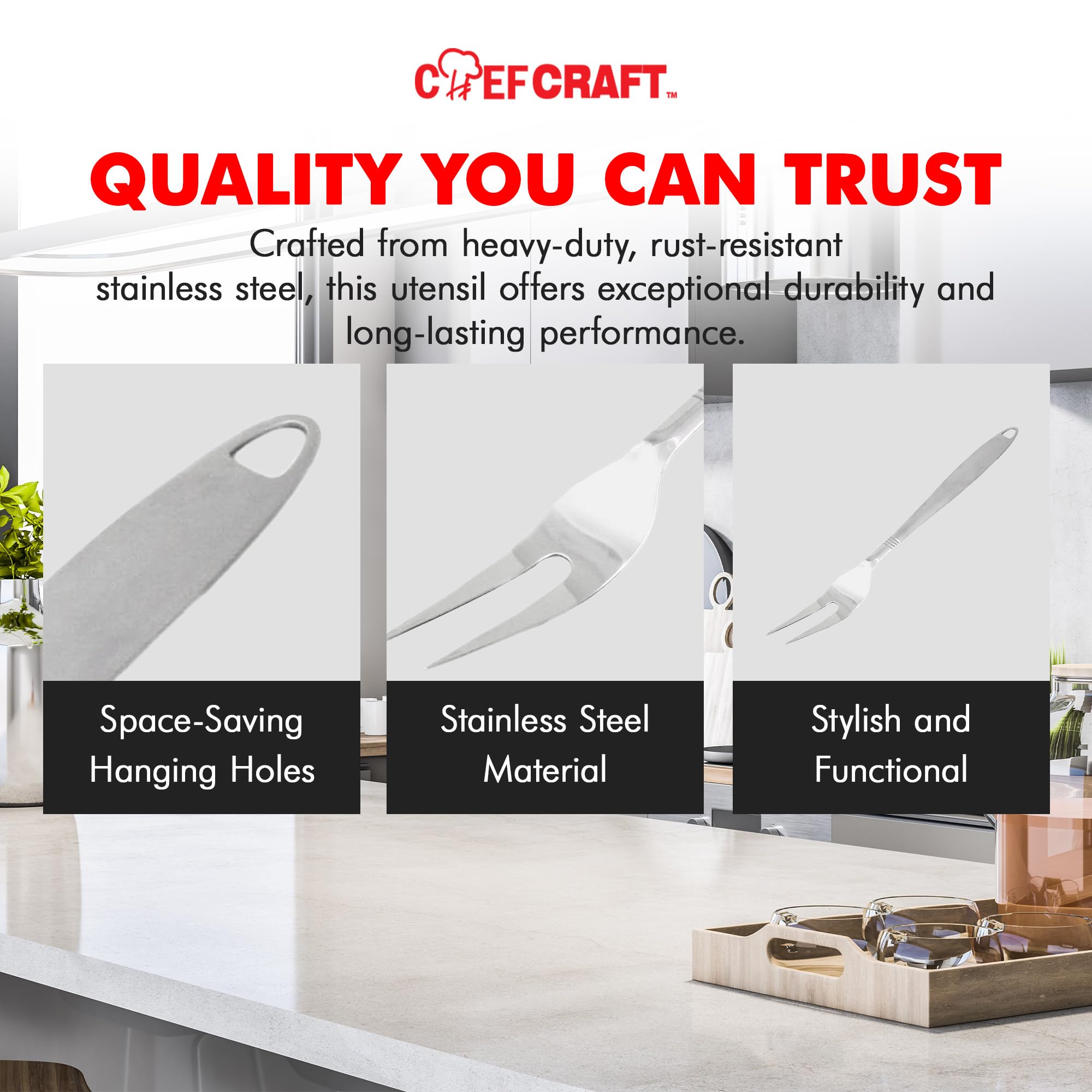 The Chef Craft Stainless Steel Fork is designed from high quality heavy gauge stainless steel, has a brush finished handle with a hole in the top for easy hanging. Attractive design with a brushed handle and shiny working end is great to use for serving at events and parties. Features a hole in the handle for easy hanging and storage when not using. The length is perfect for cooking, it provides a large enough distance from your hand to the pot while still providing control. Dishwasher safe for easy, quick, and convenient cleaning after use with any foods.