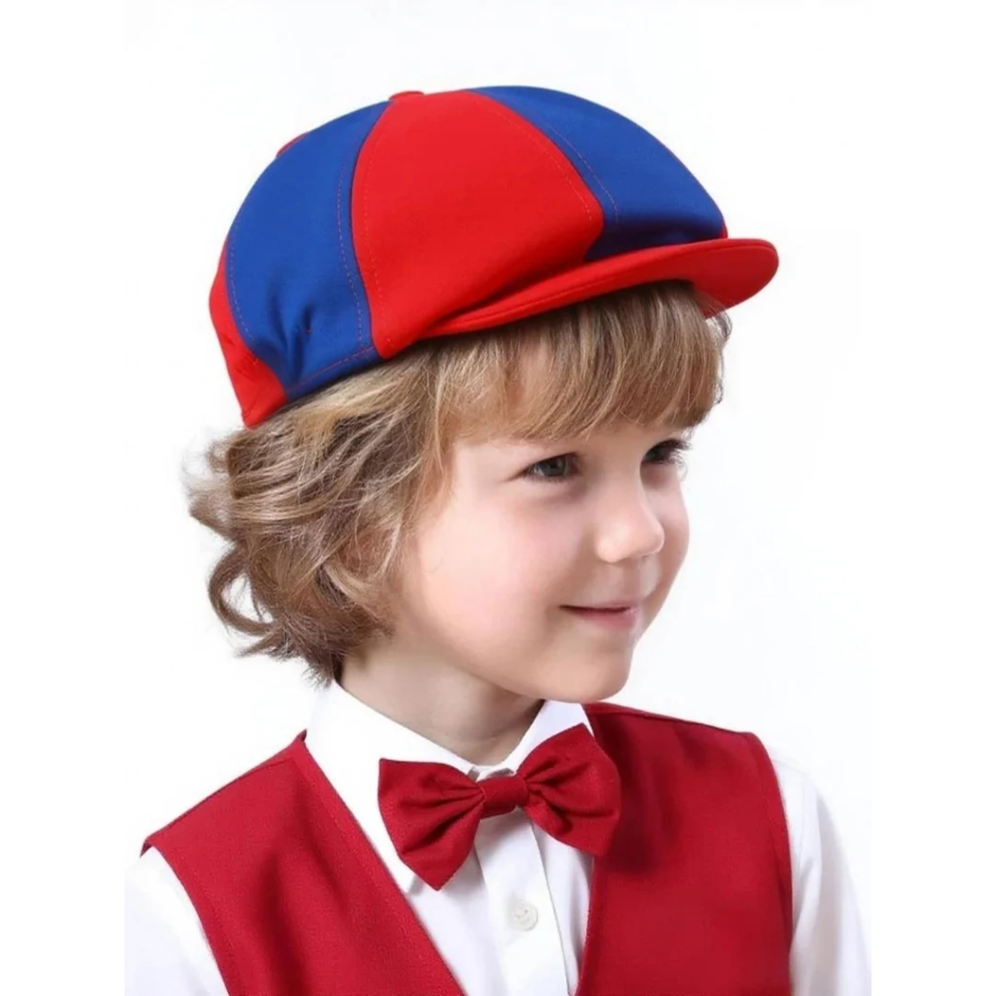 Great Gift Idea: Looking for a unique and stylish gift for a young boy? This red - blue color - blocked newsboy cap is an excellent choice that any little one will love.