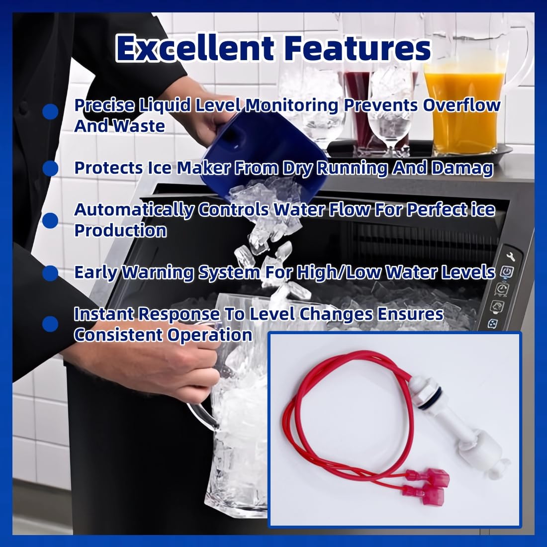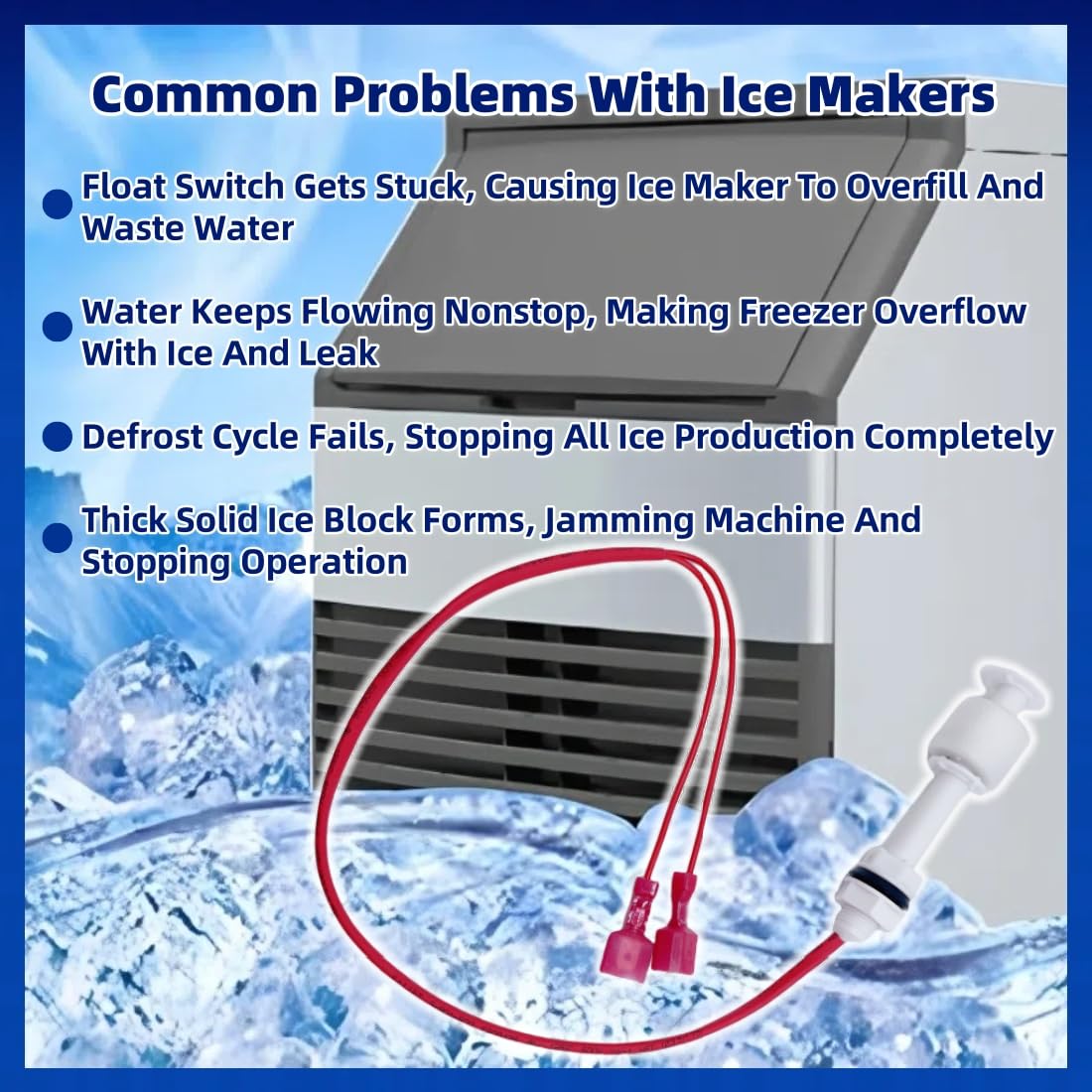 This high-precision float switch solves common ice maker issues like failed harvest cycles, continuous water feeding, and ice slab formation by automatically monitoring ice thickness and water levels. Its smart sensor technology ensures perfect harvest timing while preventing water waste and equipment damage. The durable design maintains optimal freezing conditions by instantly adjusting water levels and activating the pump when needed. Compatible with UD0140A, UY0140AE, UY0310W, and other models, Simply install to enjoy consistent, high-quality ice production with reliable overfill protection and warning systems. Verify your model before purchase
