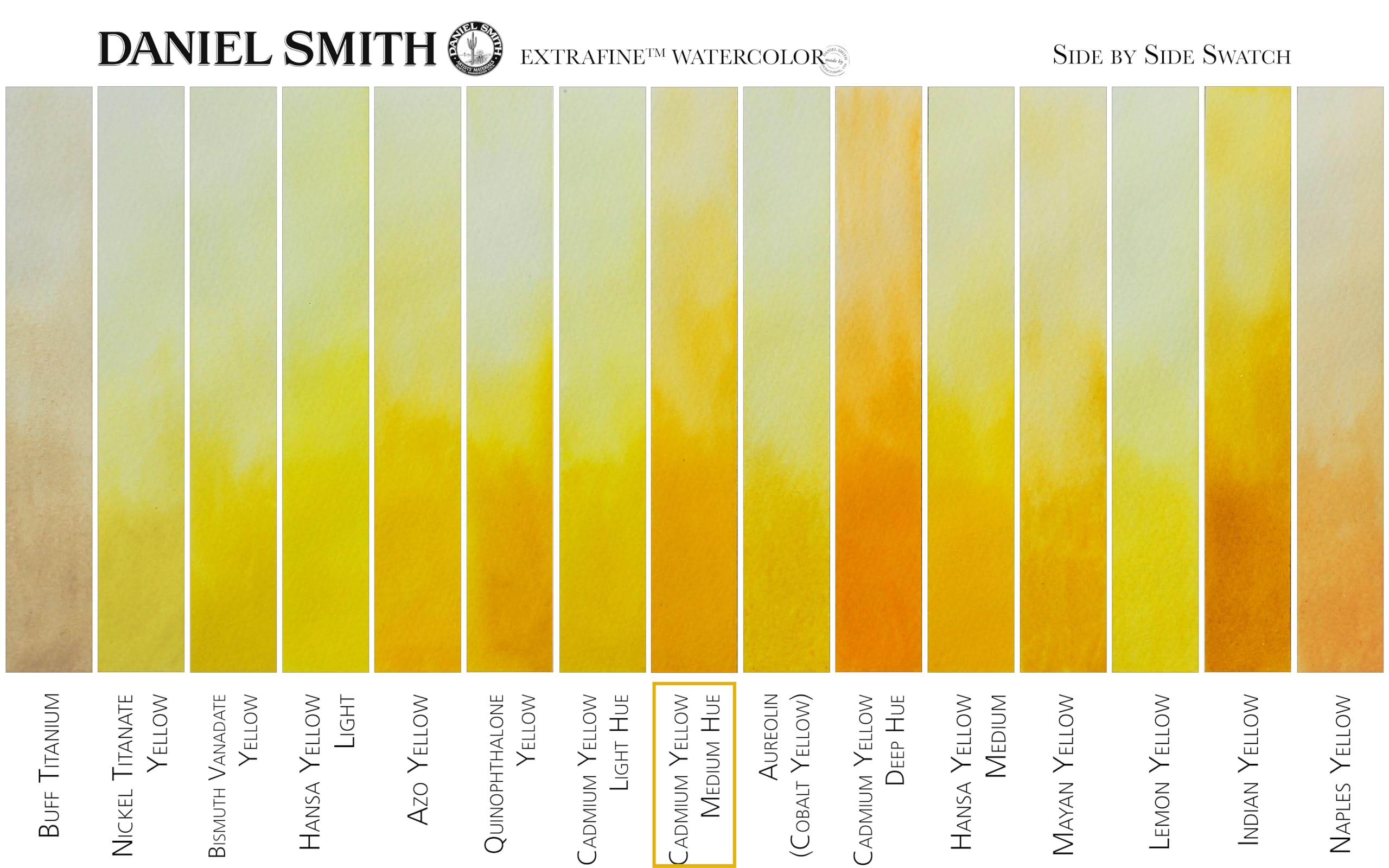 Cadmium Yellow Medium Hue, a mid- toned, slightly red yellow is perfect to add heat, energy and a focus in any painting. Mixed wet into wet with Cerulean Blue you will have a vast array of textured greens in various tones depending on the color balance and amounts of water, from dusky shadow greens to vibrant spring greens. It disperses beautifully in water for smooth, rich washes. We've done it! Safe, Vibrant Cadmium Hue Watercolors! Our new formulas provide all the density and richness of classic cadmium colors. Our hues are virtually identical in color to their namesakes, but cleaner in mixtures and stronger in tints - you'll find a little goes a long way. Working properties - staining power, semi-transparency and excellent light fastness - are also nearly identical to those of the low-soluble cadmium colors we previously offered.